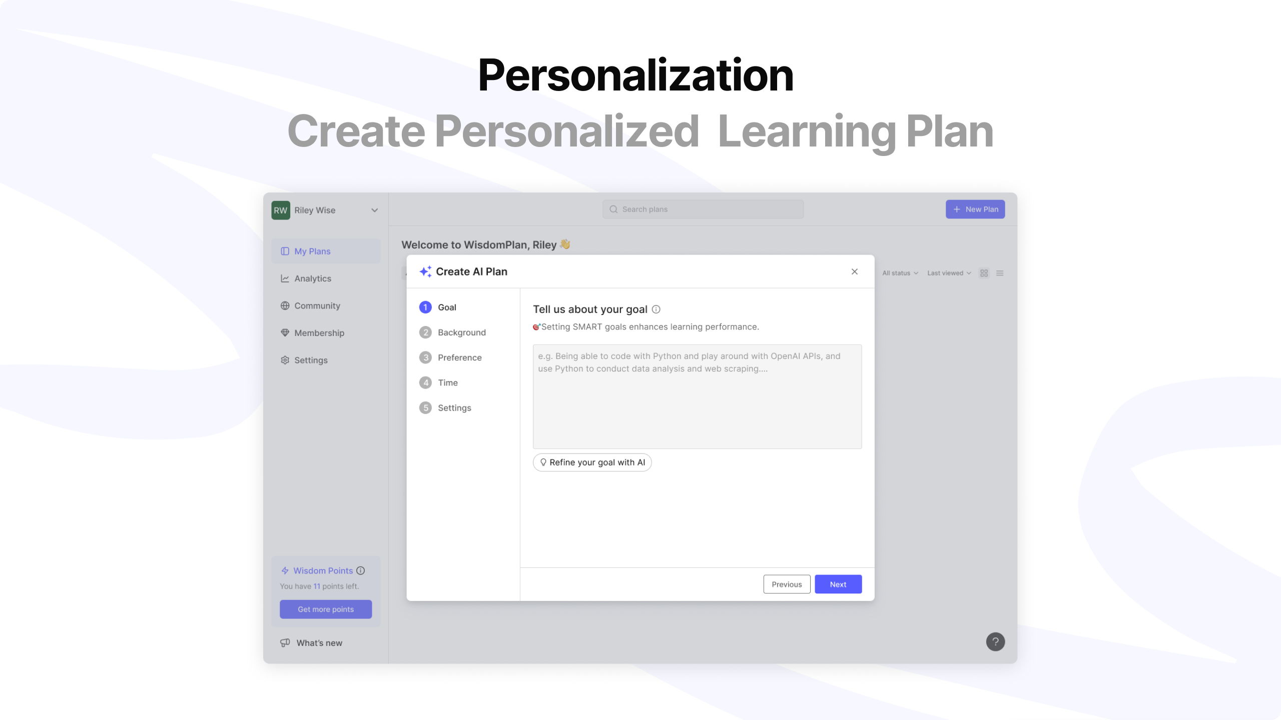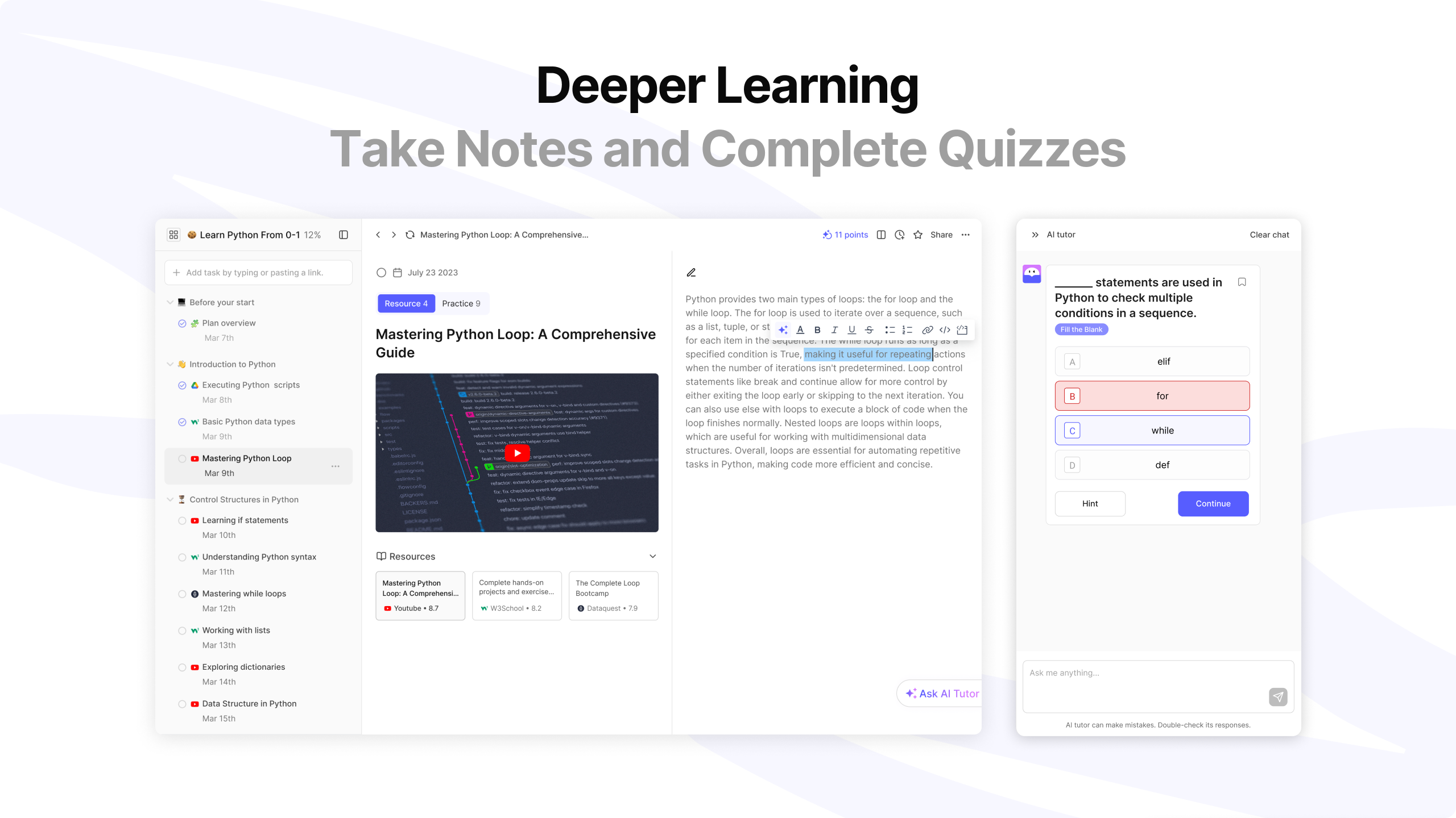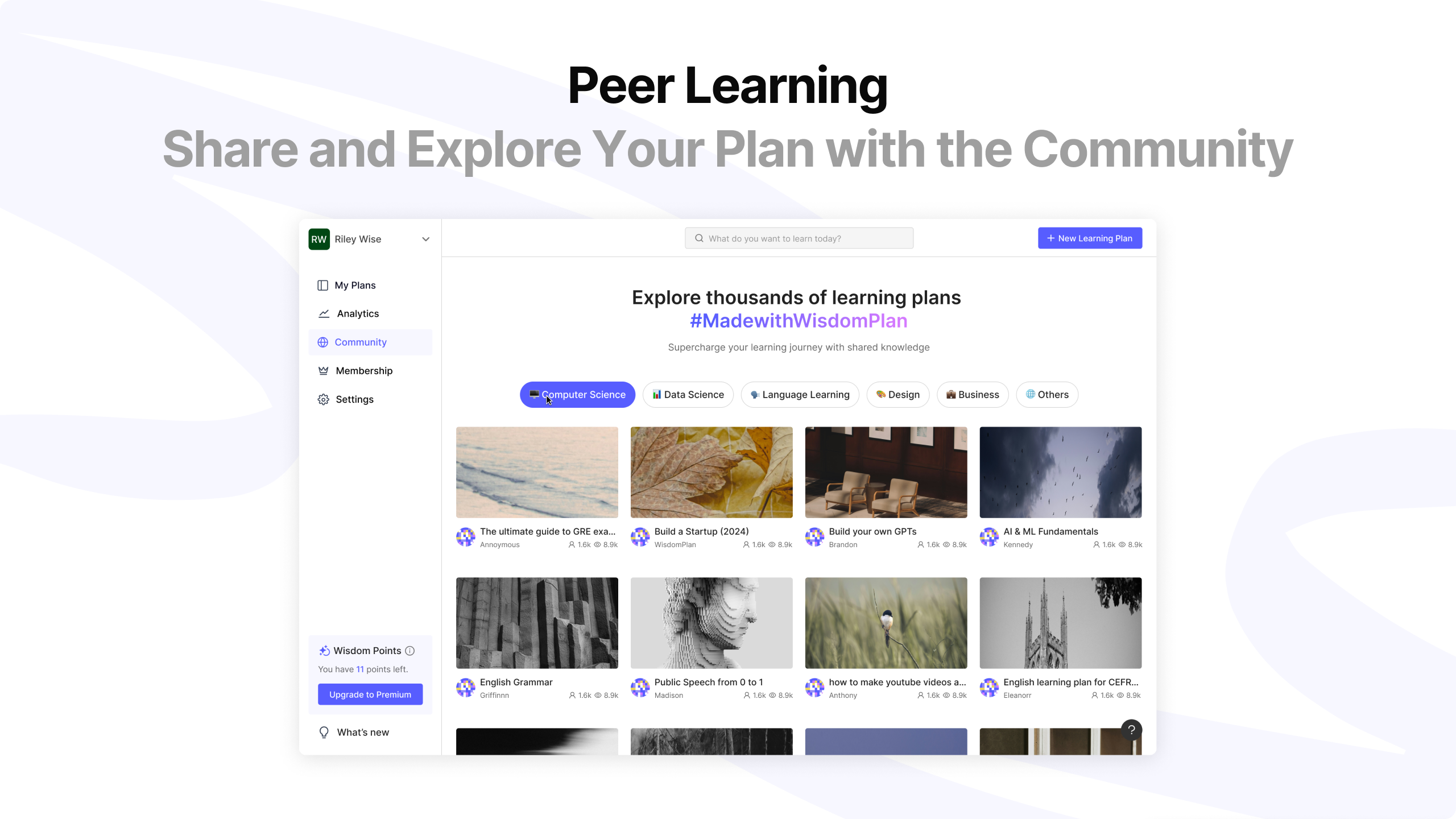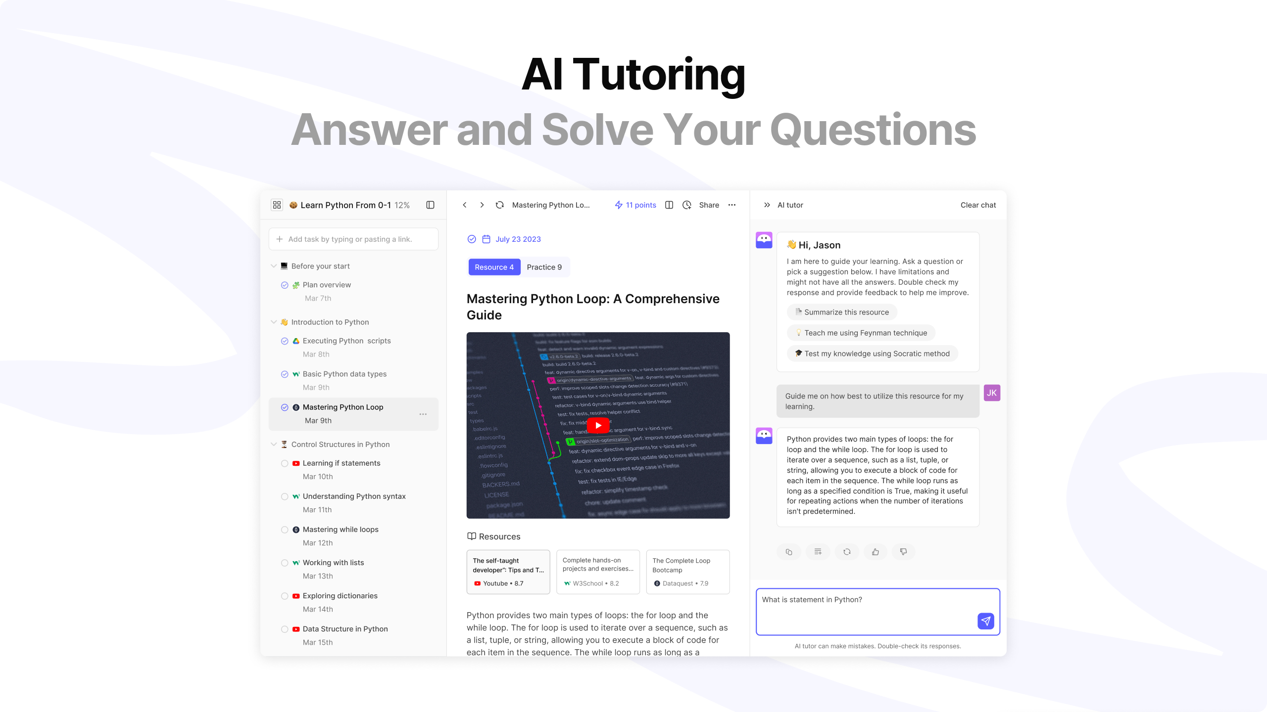 WisdomPlan effectively combines AI technology and community engagement to enhance the self-directed learning experience. Its standout features include AI-generated customized learning paths tailored to the learner's background, preferences, and goals, as well as an AI tutor for real-time assistance. The AI greatly enhances the learning experience by making it more engaging and interactive, allowing learners not only to watch and read the content but also to participate in quizzes and interact with the AI tutor to ask questions and receive personalized support, which significantly deepens the experience closer to real-life teaching.