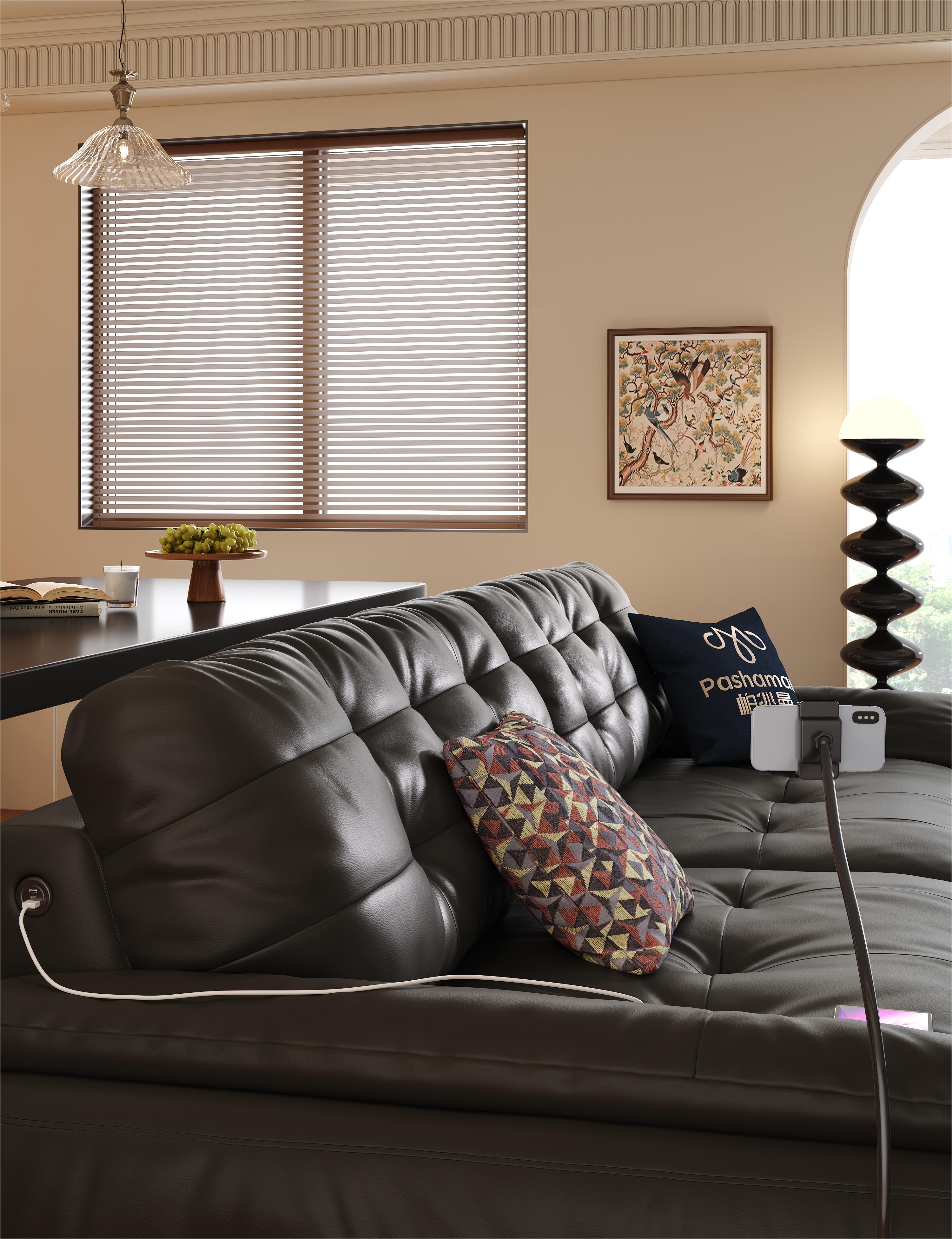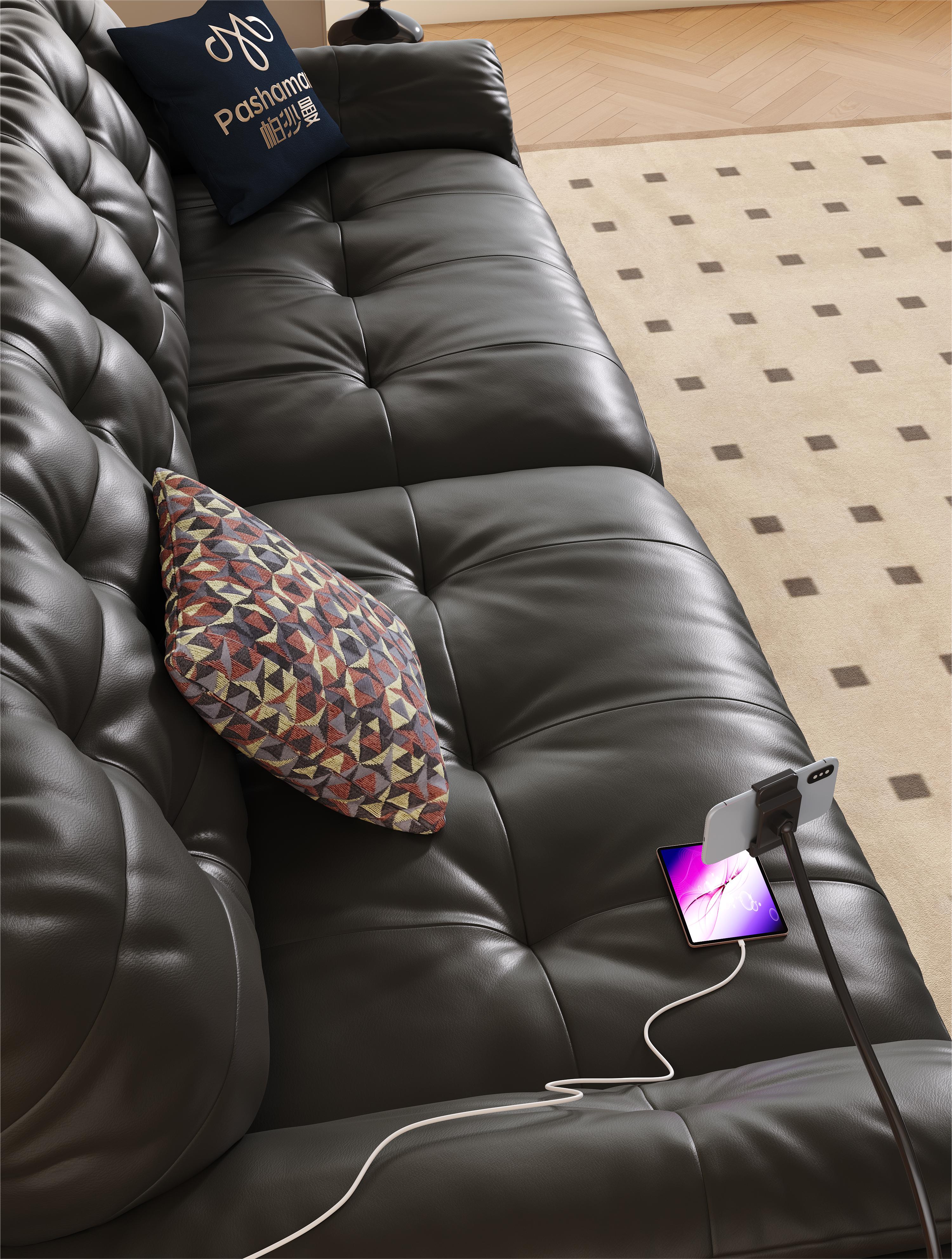 Considering the high dependence of modern people on mobile devices, the sofa specially integrates a 360-degree rotation mobile phone holder and two USB charging ports, allowing users to easily use their mobile phones or tablets without leaving their seats, and solving the charging problem.