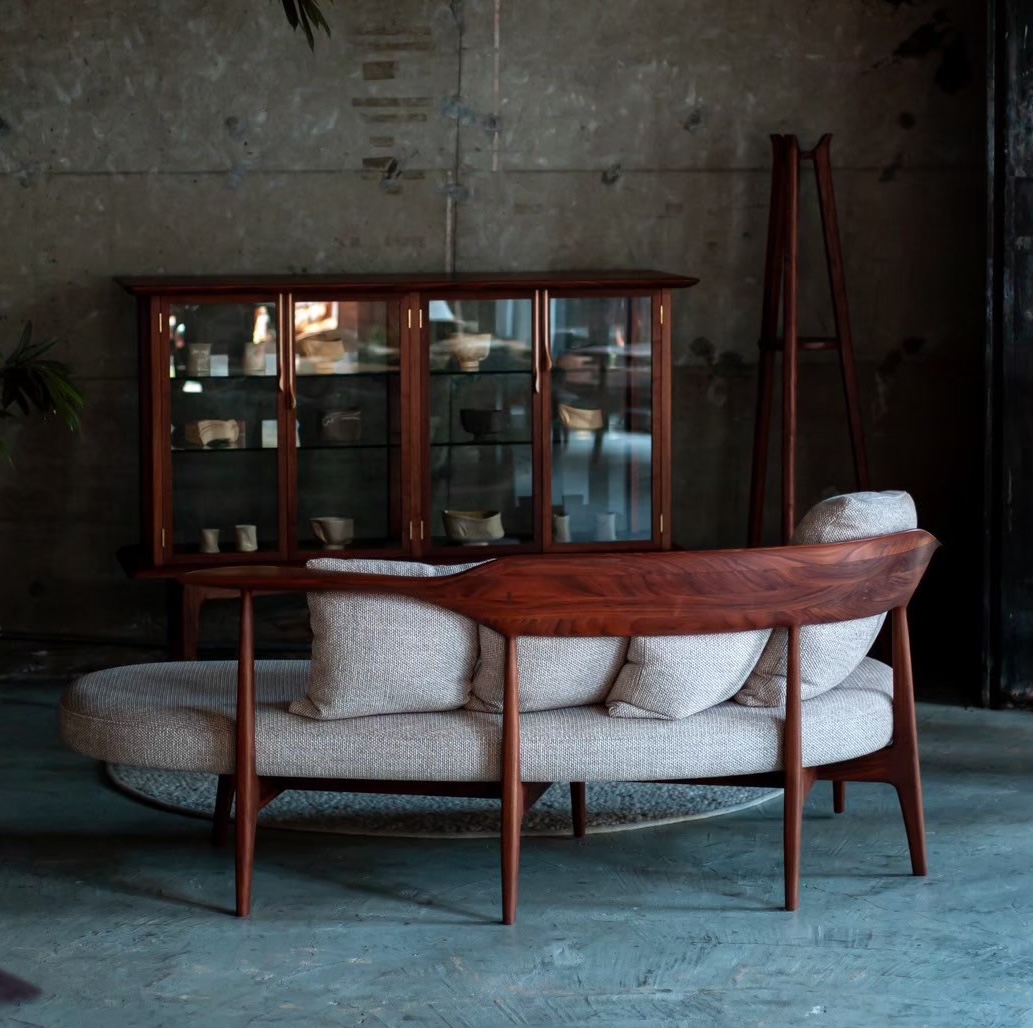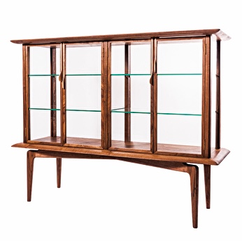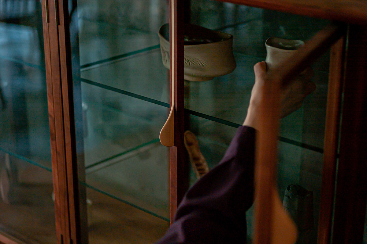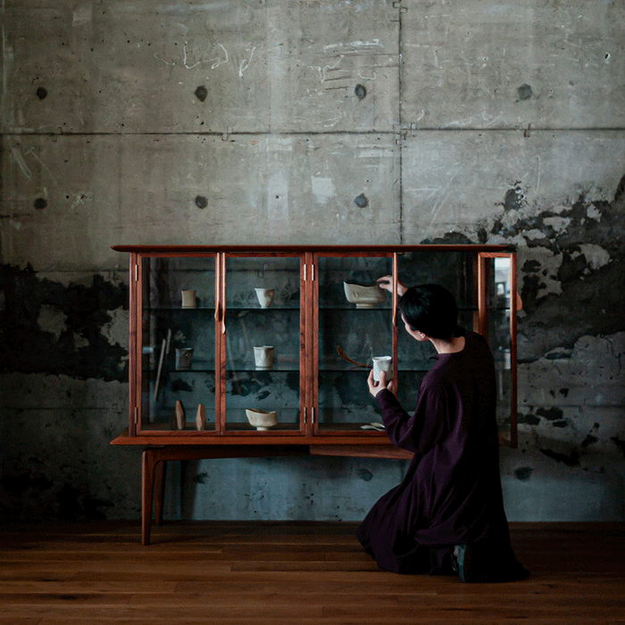 hyuece glass cabinet is a piece of furniture with a strong presence. The top and bottom wood frames, legs and handles are all made from solid wood, hand carved by craftsman using traditional Japanese tools such as blades and planes. Signature handles which are inspired by the rain drops streaming down the window, not only characterize this design but also serve as a functional element. Natural light reach through the glass shelves to complement displayed collections in the most beautiful way.