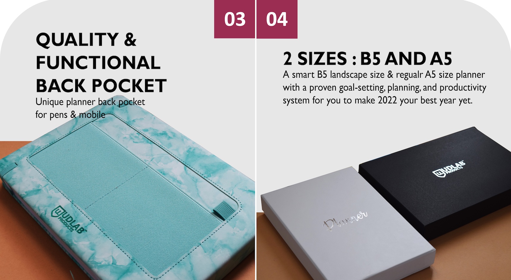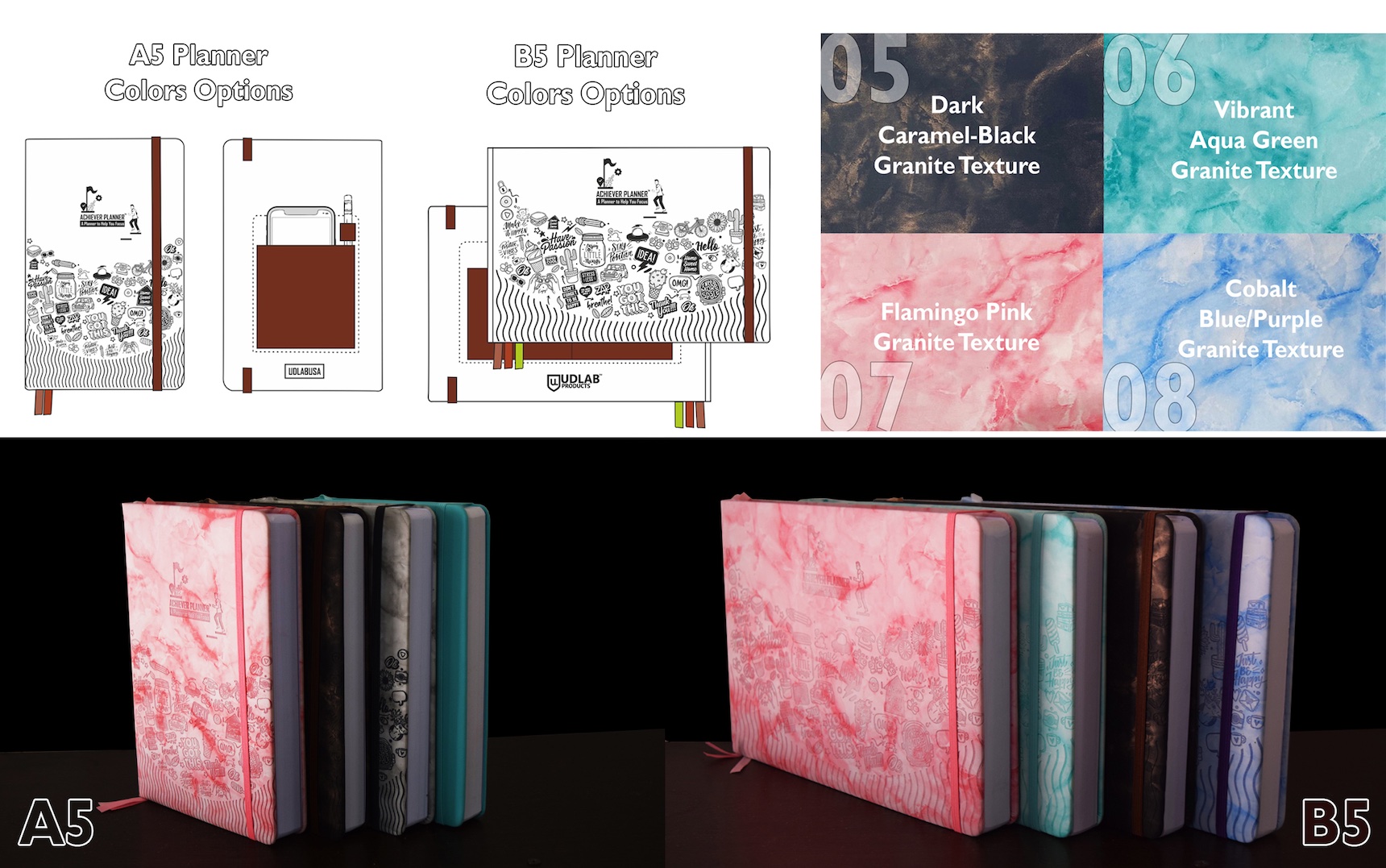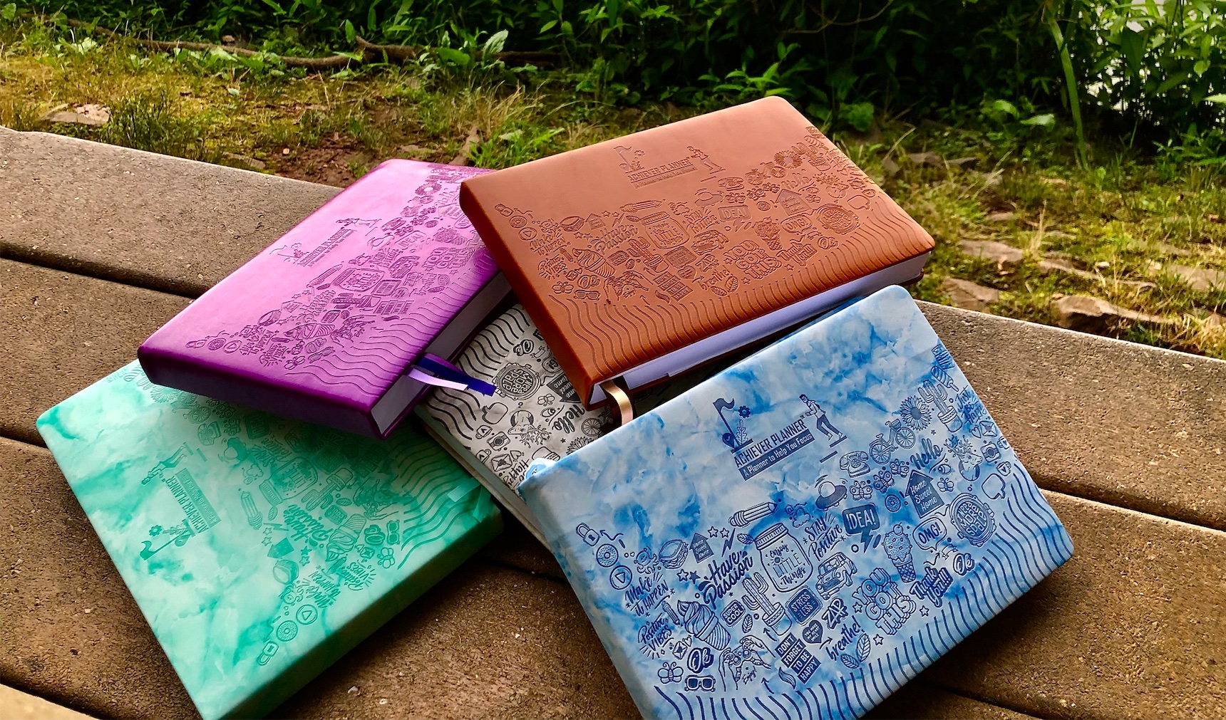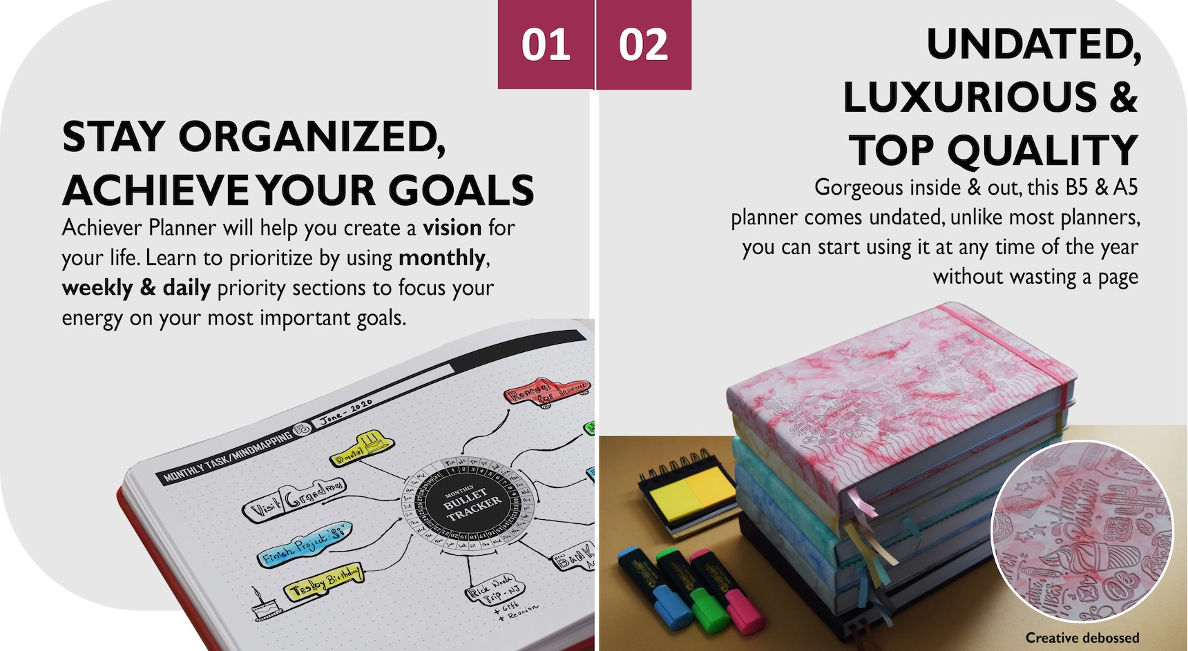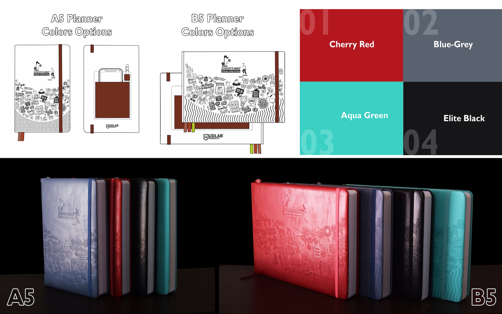 The 'Achiever Planner' is a truly all-in-one undated journal planner designed specifically to address and focus on all the areas of day-to-day life and meticulously plan future goals that will provide students and professionals alike with a way to set goals, keep on top of their daily schedule and more. The planner works on a daily, weekly and monthly basis to help with everyday activities while also allowing a person to create actionable goals that take more time to achieve. The detailed pages of the planner also help with fitness tracking, food planning, habit tracking, financial maintenance and more in one convenient book. The planner comes in two sizes, as a smaller A5 book in portrait mode, or a slightly larger yet smart and equally portable B5 book in landscape mode.