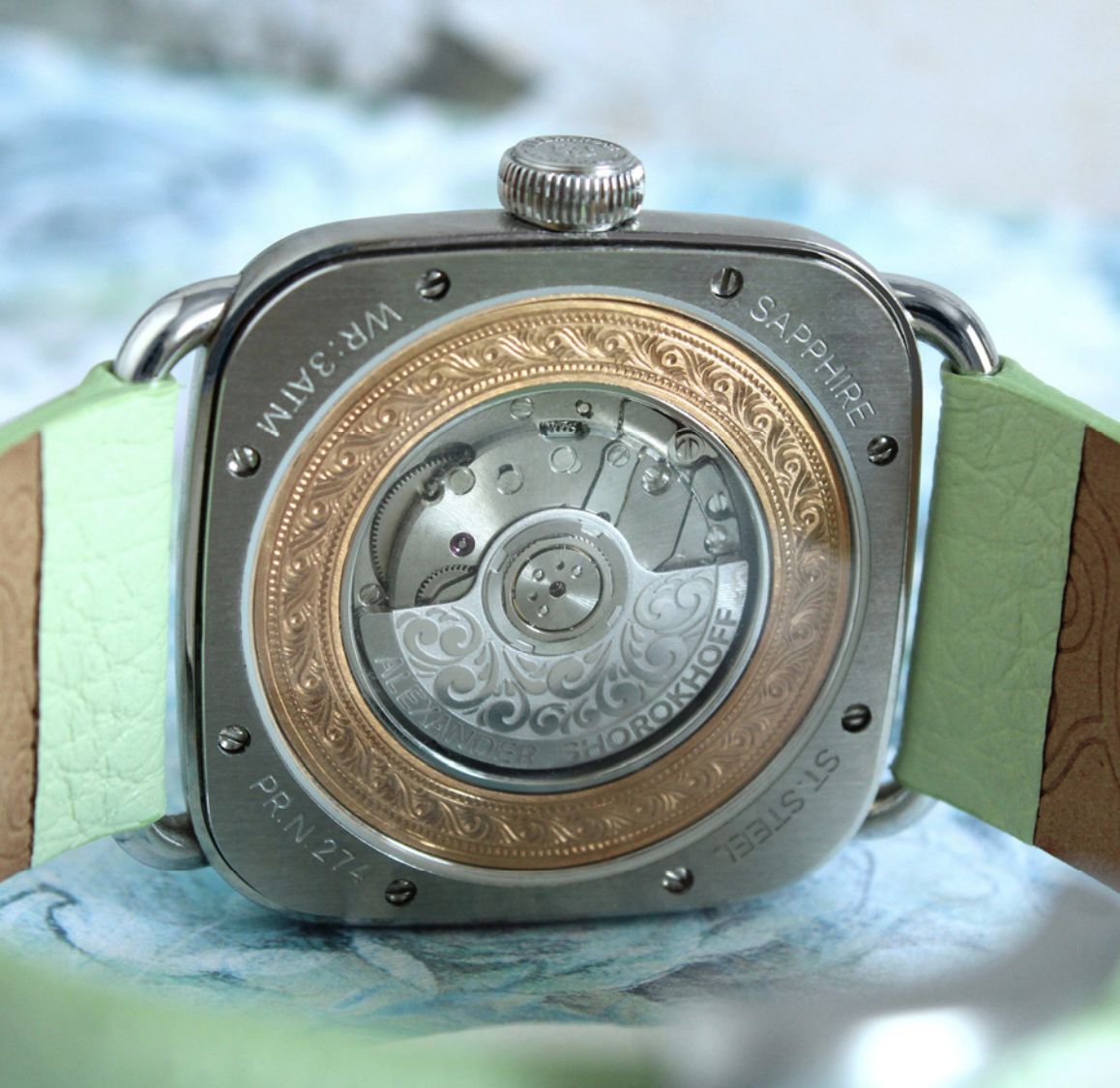 The case is made of stainless steel with a diamond bezel and two sapphire crystals and measures 36 mm x 36 mm. The middle section is brushed, while the bezel and the back are polished. Additionally, the back features an intricately hand-engraved ring. The watch is water-resistant up to 3 ATM.