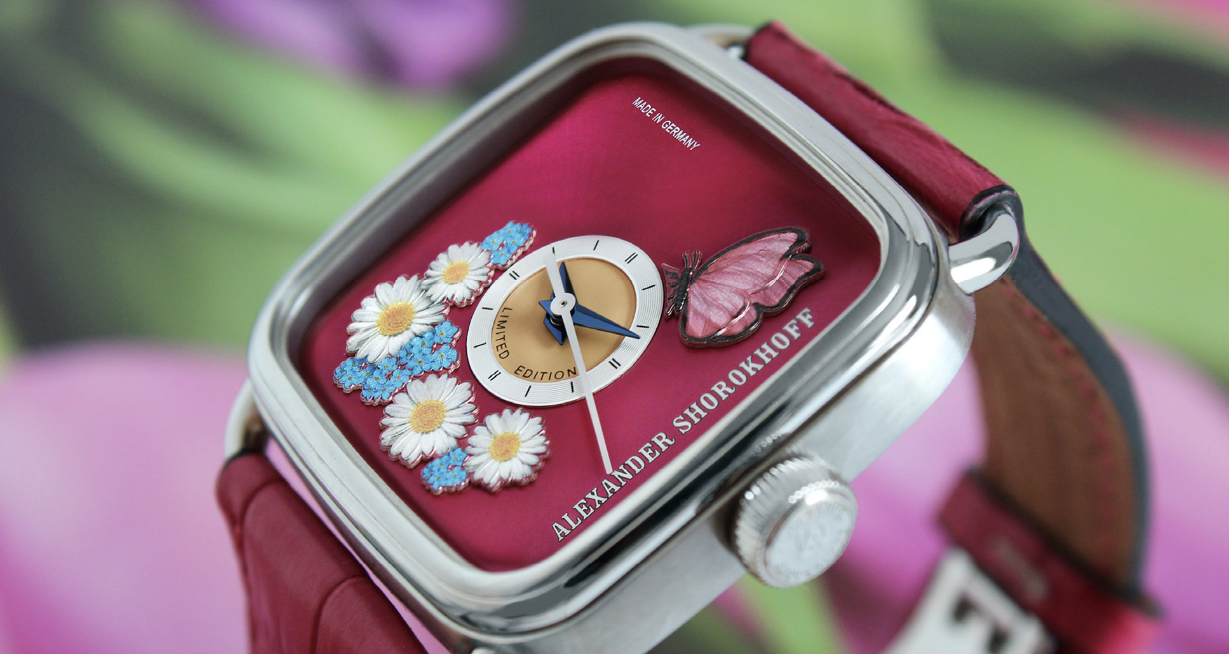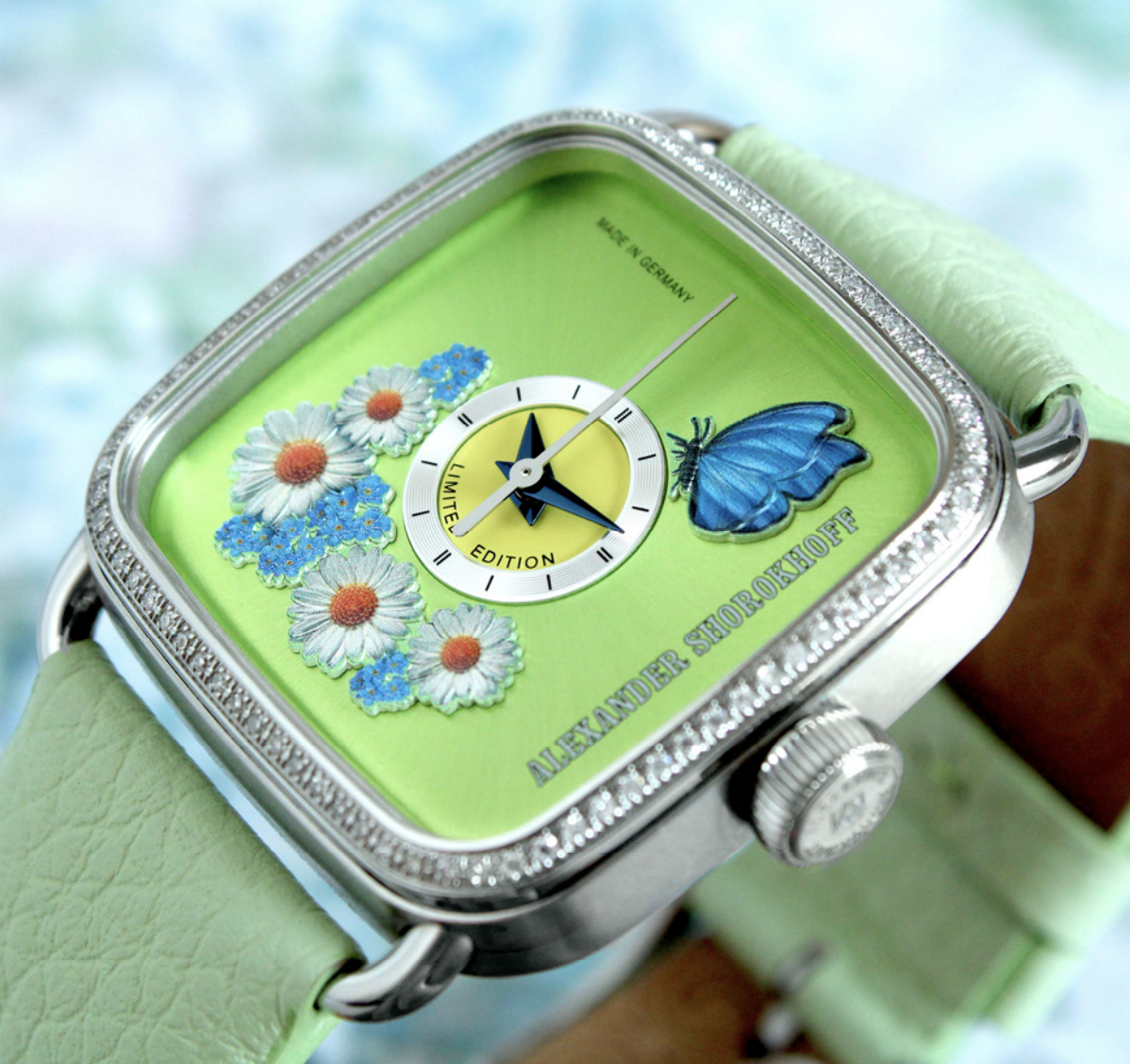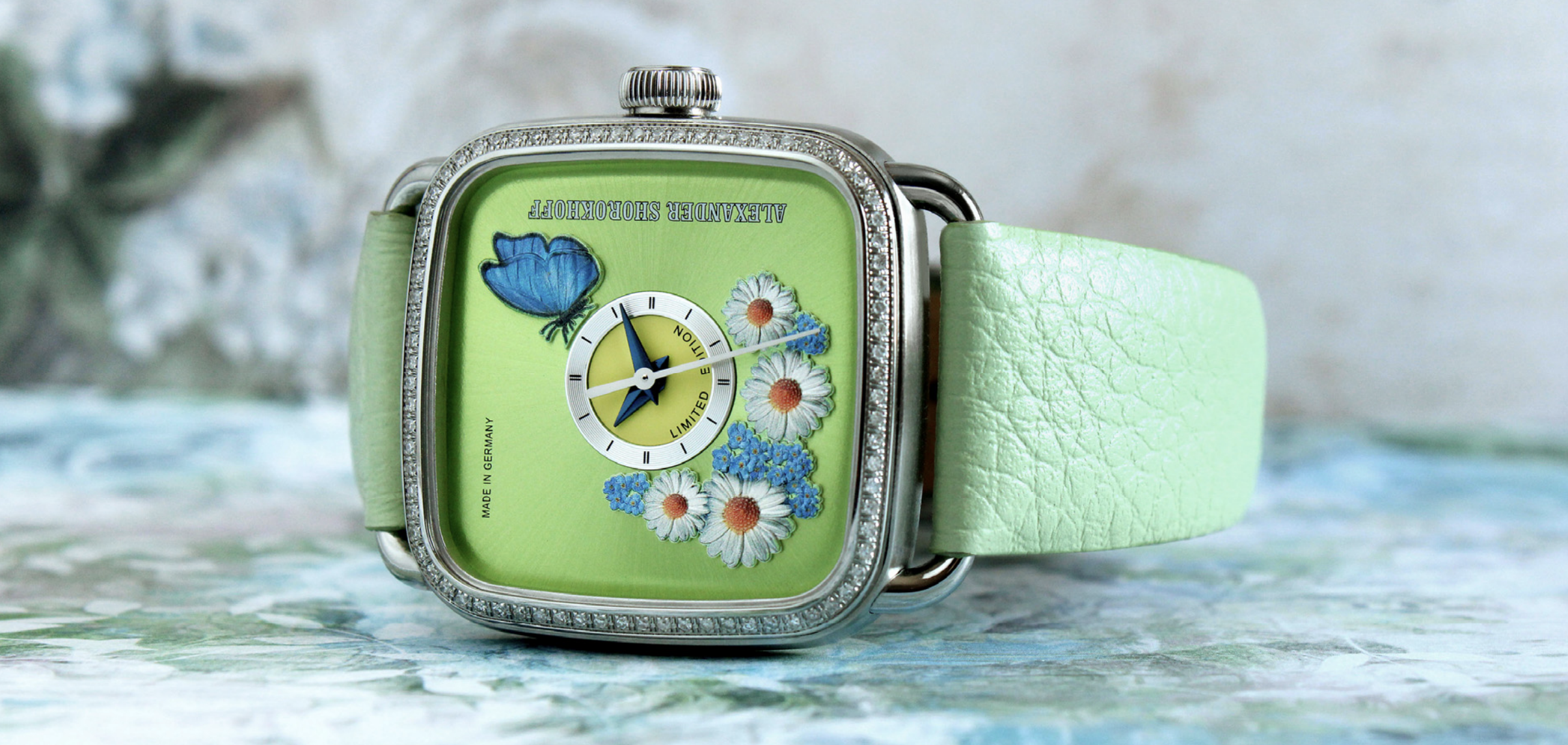 At first glance, one is almost enchanted by the magic embodied in the dial of the "Summer" model. And magic is truly the right word, as it’s important to note the innovative manufacturing process of the dial. Both the small butterfly and the beautiful floral arrangement were crafted as appliqués using intricate 3D work. This creates a stunning depth and presence of the dial, truly unveiling the magic of the watch.