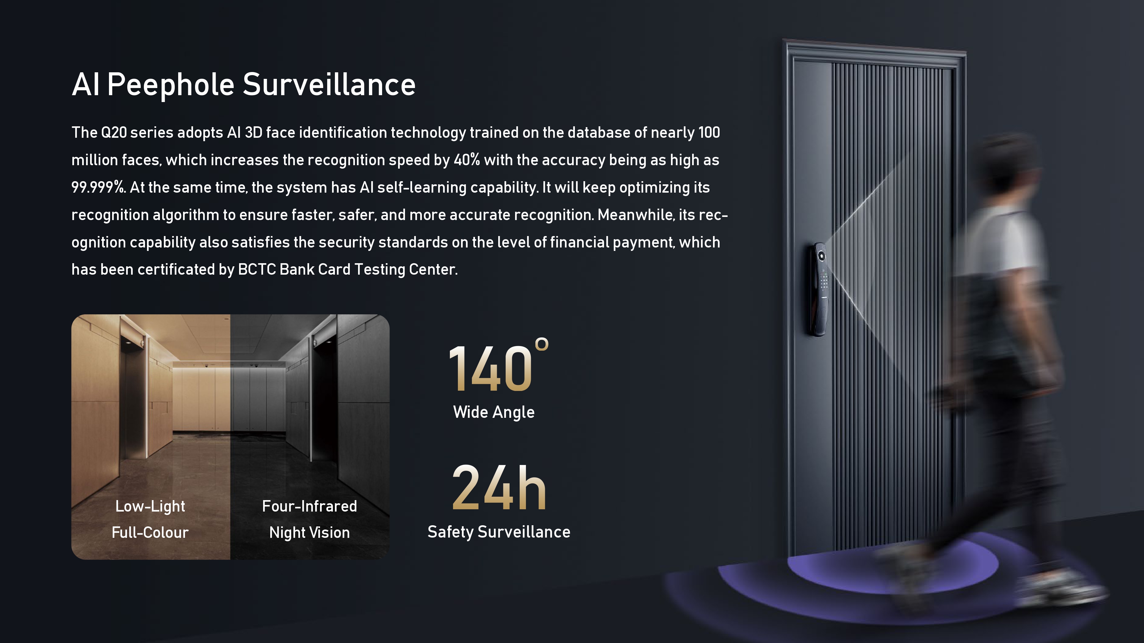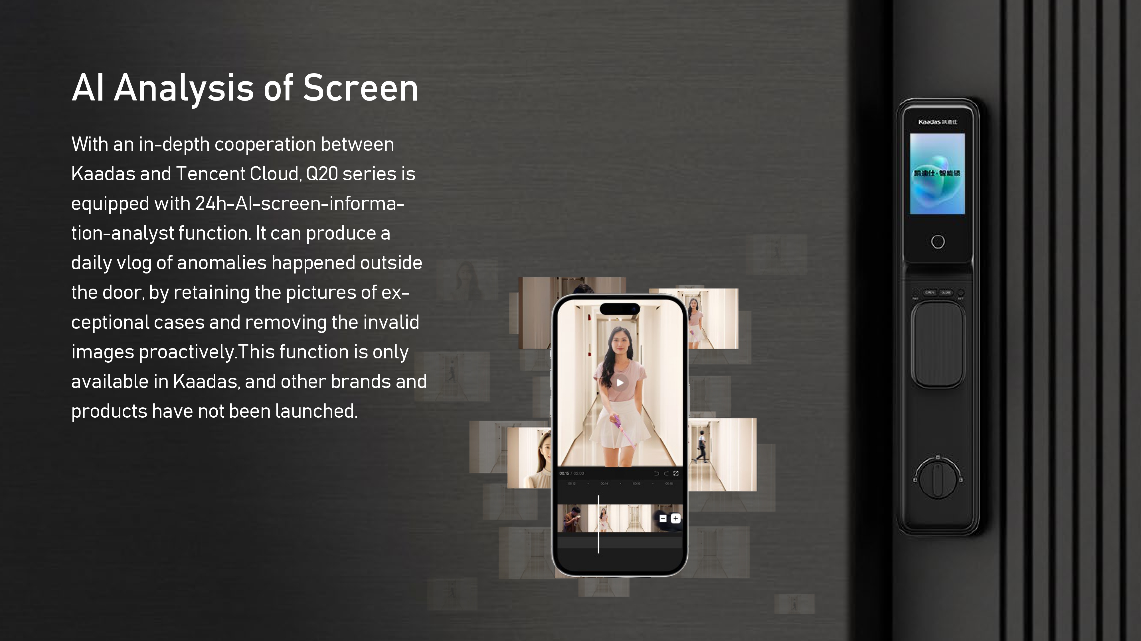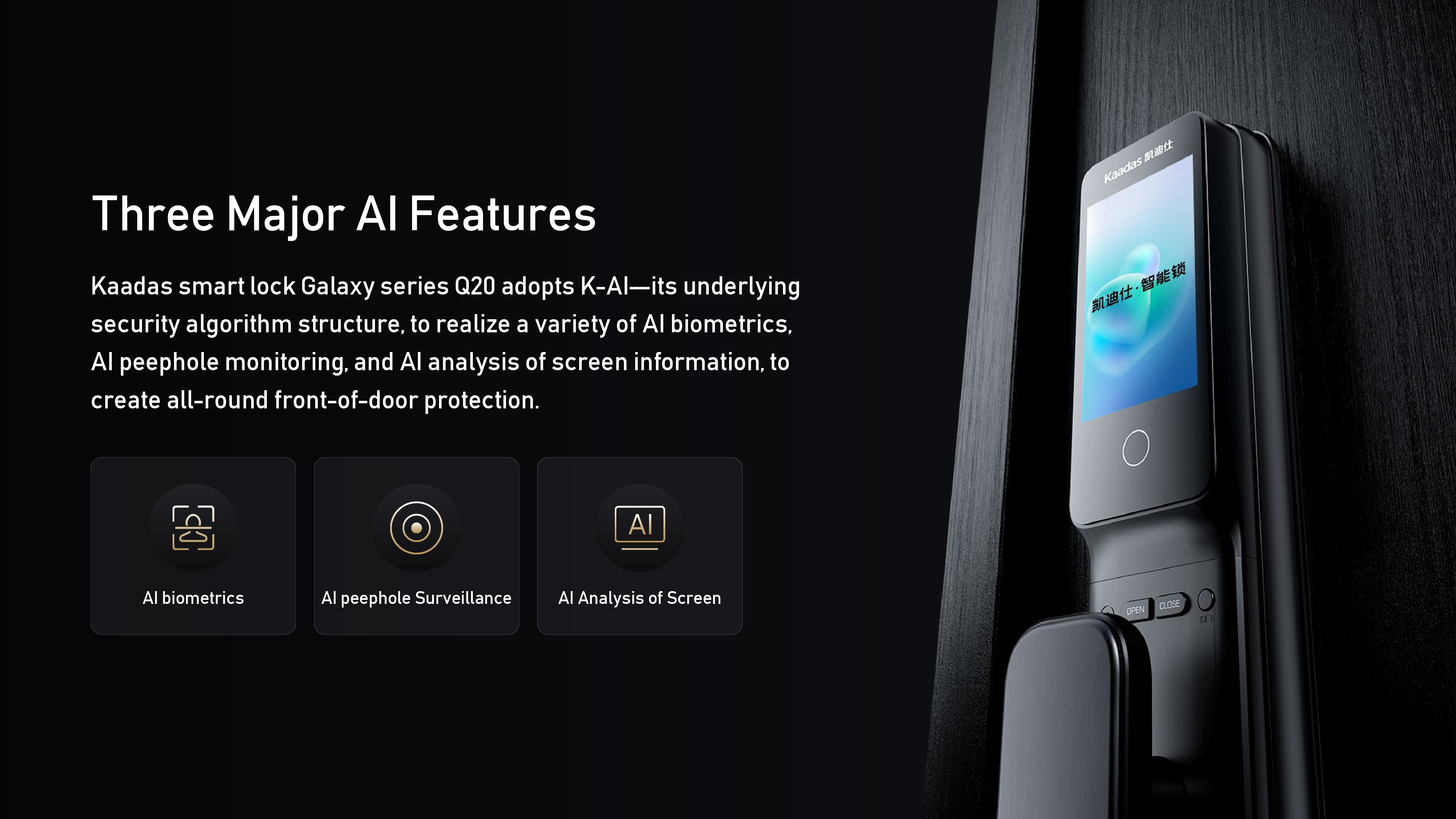 It adopts K-AI—its underlying security algorithm structure, to realize a variety of AI biometrics, AI peephole Surveillance, and AI analysis of screen information, to create all-round front-of-door protection. Equipped with the industry's first 24h-AI-screen-information-analyst function, it can capture anomalies happened in front of the door and generates a daily vlog automatically, to allow users to have a quick view. Users can also control the lock remotely, and receive real-time dynamic notifications from the lock through mobile APP or WeChat applet. In addition, it also supports 7 alarm methods, 10 unlocking methods and a large screen to visualize instant situation of the doorway, bringing users unprecedented convenience and safety experience.
