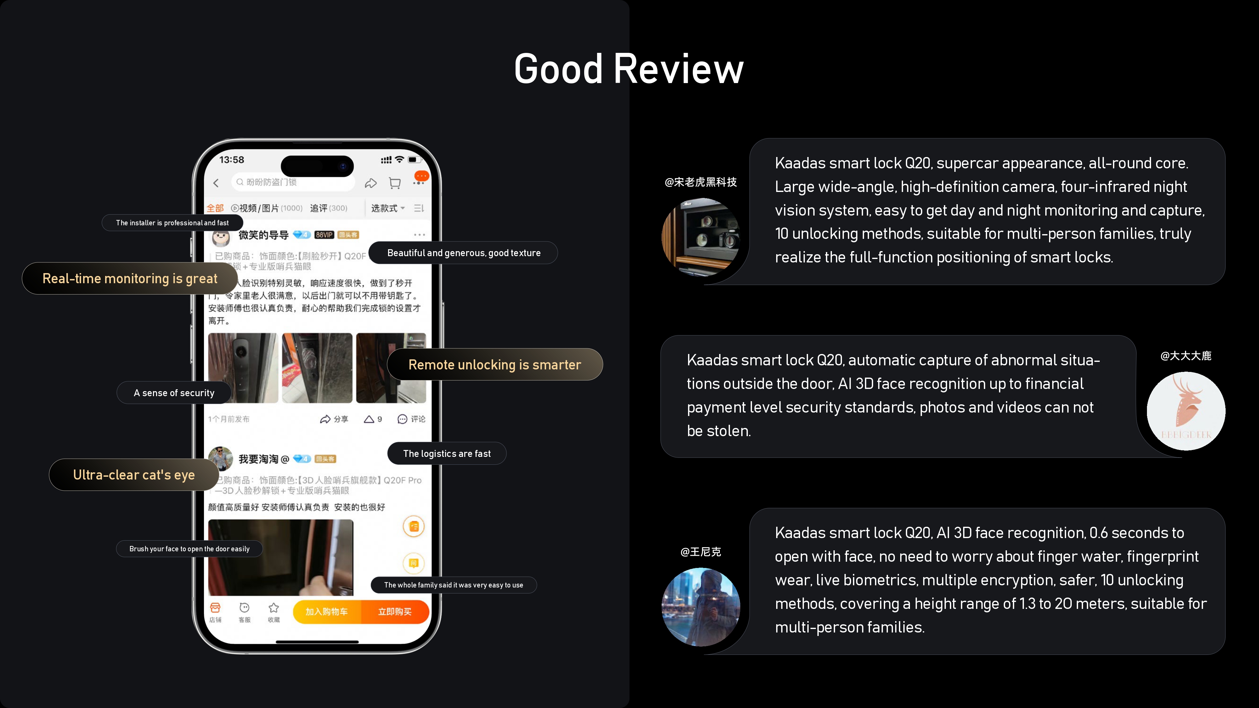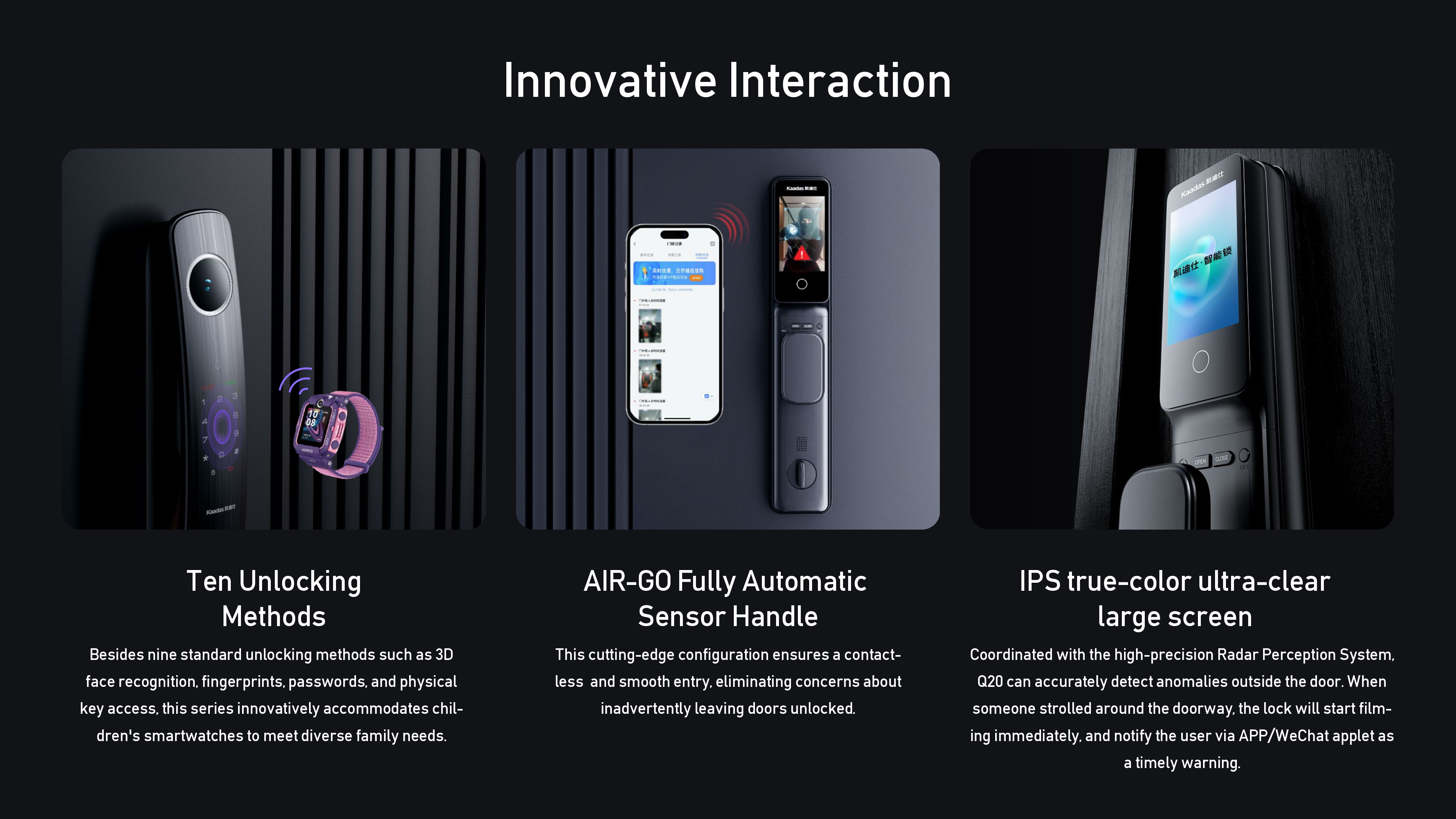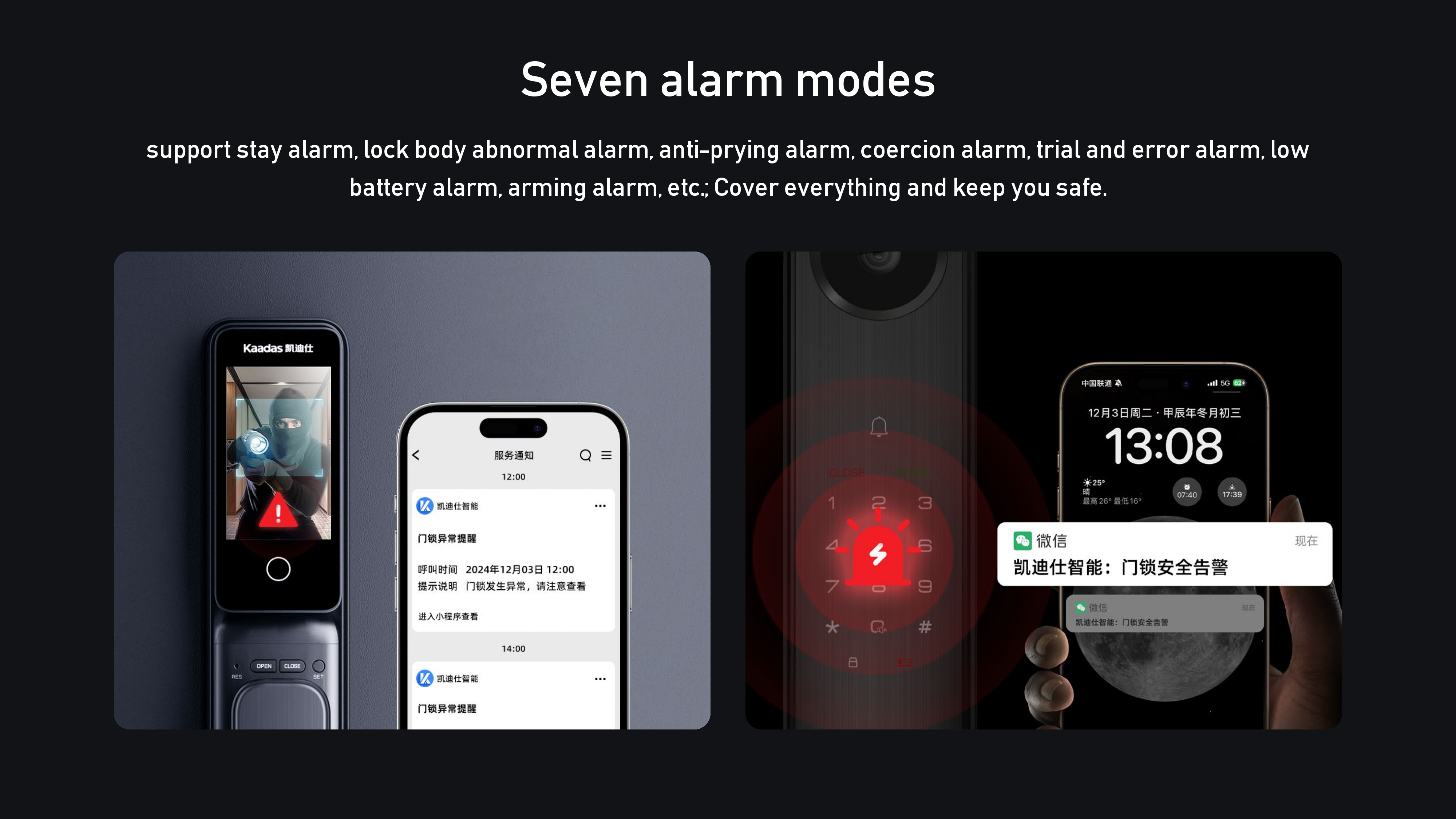 It adopts K-AI—its underlying security algorithm structure, to realize a variety of AI biometrics, AI peephole Surveillance, and AI analysis of screen information, to create all-round front-of-door protection. Equipped with the industry's first 24h-AI-screen-information-analyst function, it can capture anomalies happened in front of the door and generates a daily vlog automatically, to allow users to have a quick view. Users can also control the lock remotely, and receive real-time dynamic notifications from the lock through mobile APP or WeChat applet. In addition, it also supports 7 alarm methods, 10 unlocking methods and a large screen to visualize instant situation of the doorway, bringing users unprecedented convenience and safety experience.