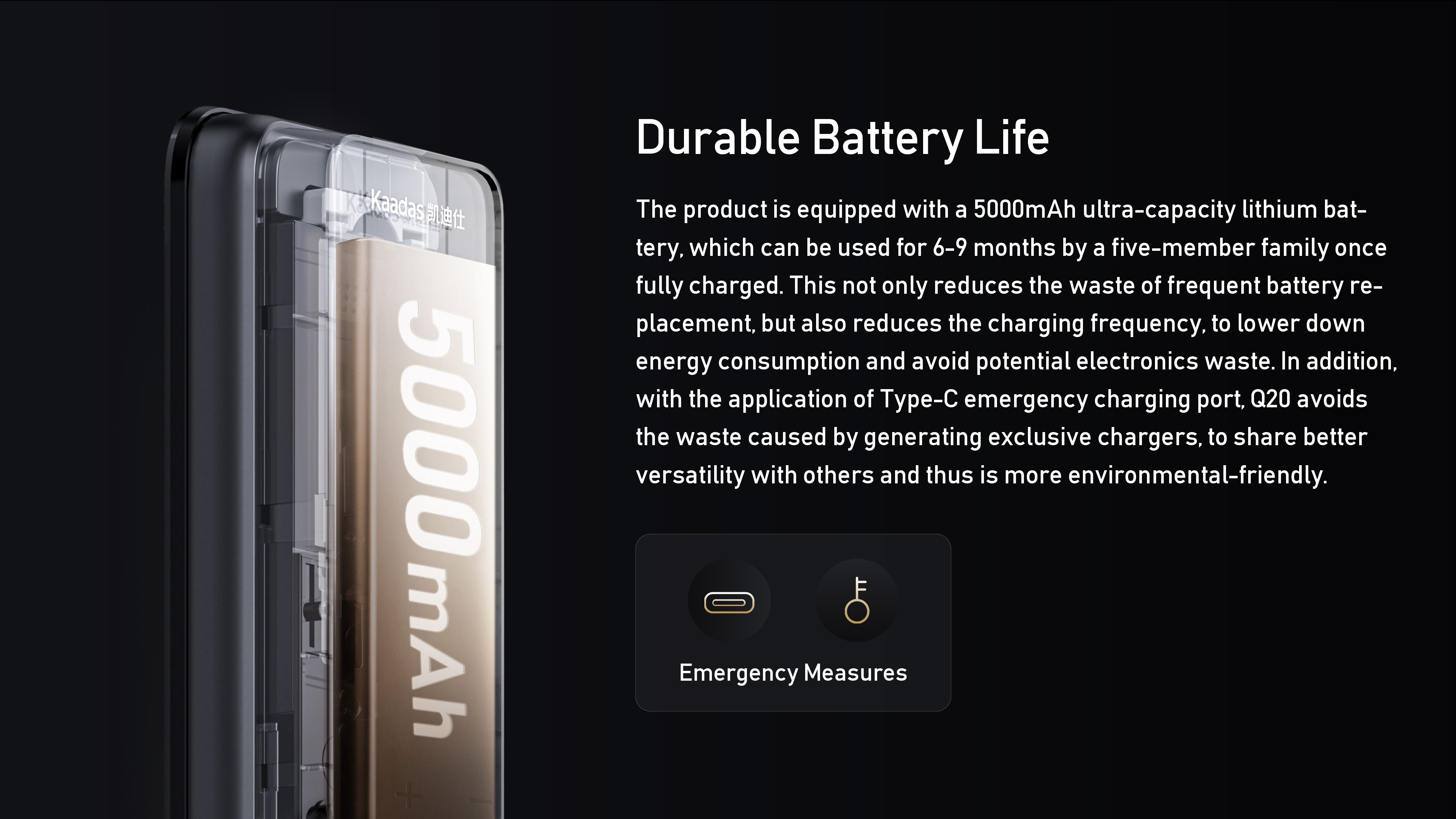 The product is equipped with a 5000mAh ultra-capacity lithium battery, which can be used for 6-9 months by a five-member family once fully charged. This not only reduces the waste of frequent battery replacement, but also reduces the charging frequency, to lower down energy consumption and avoid potential electronics waste.