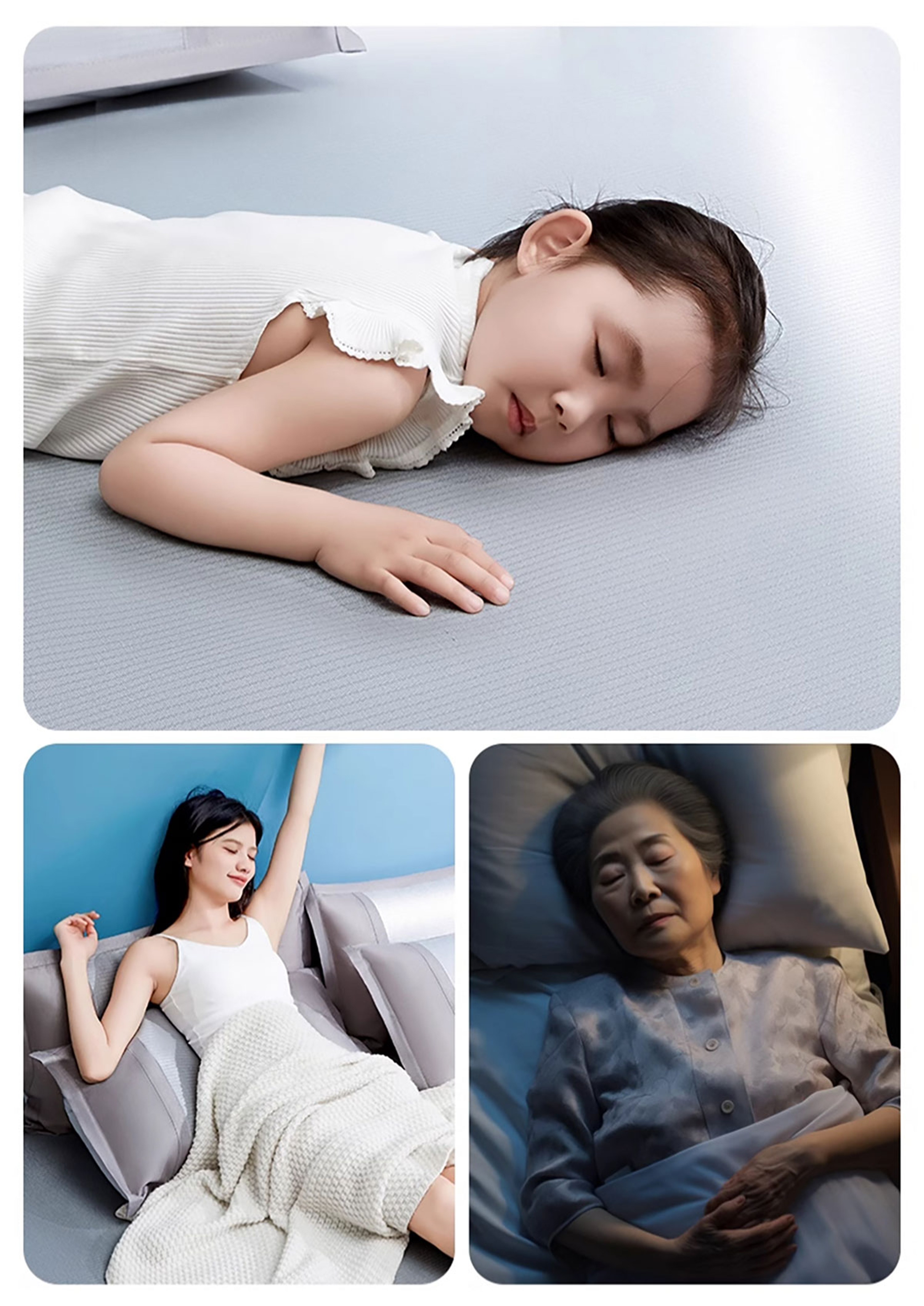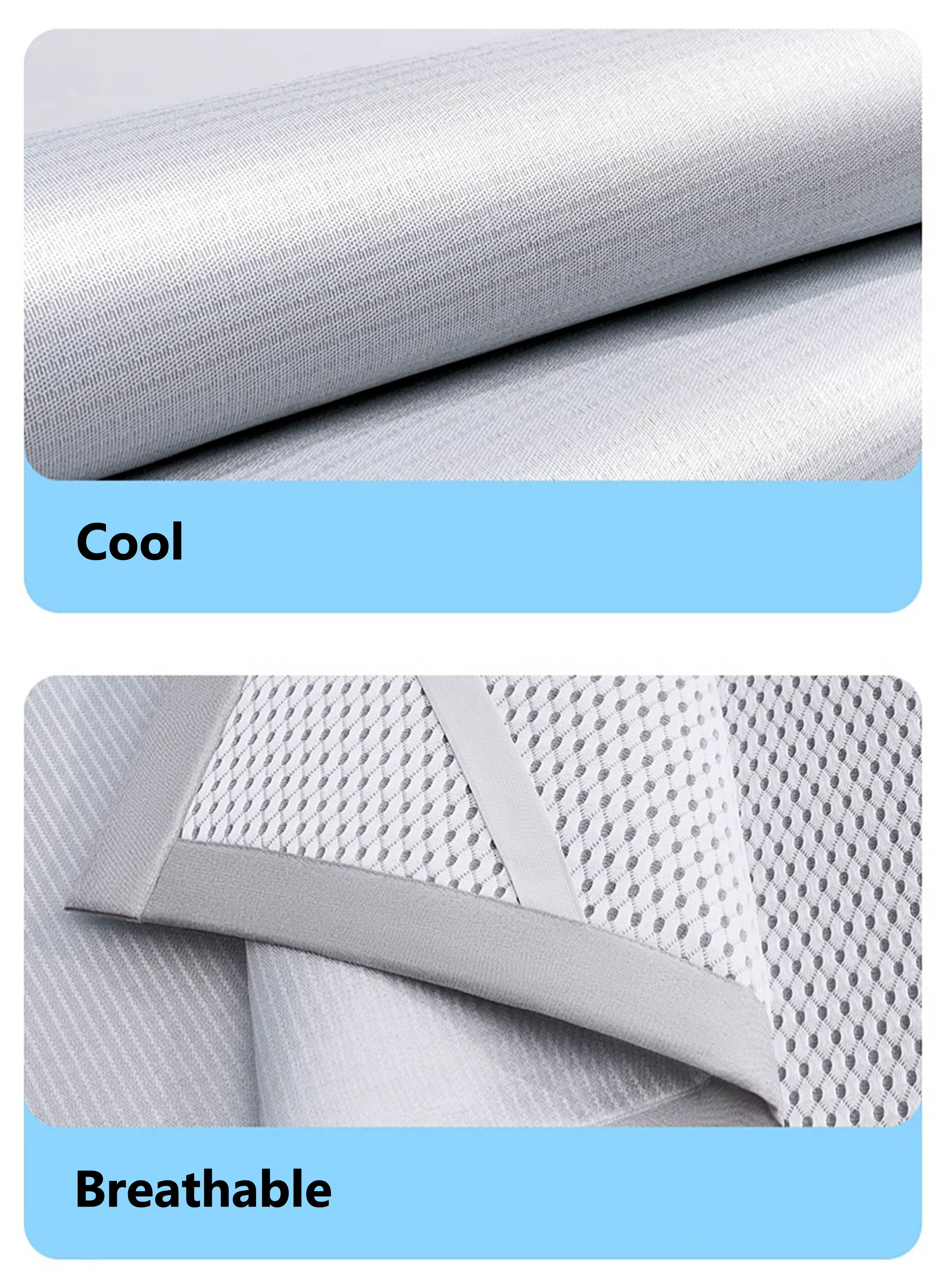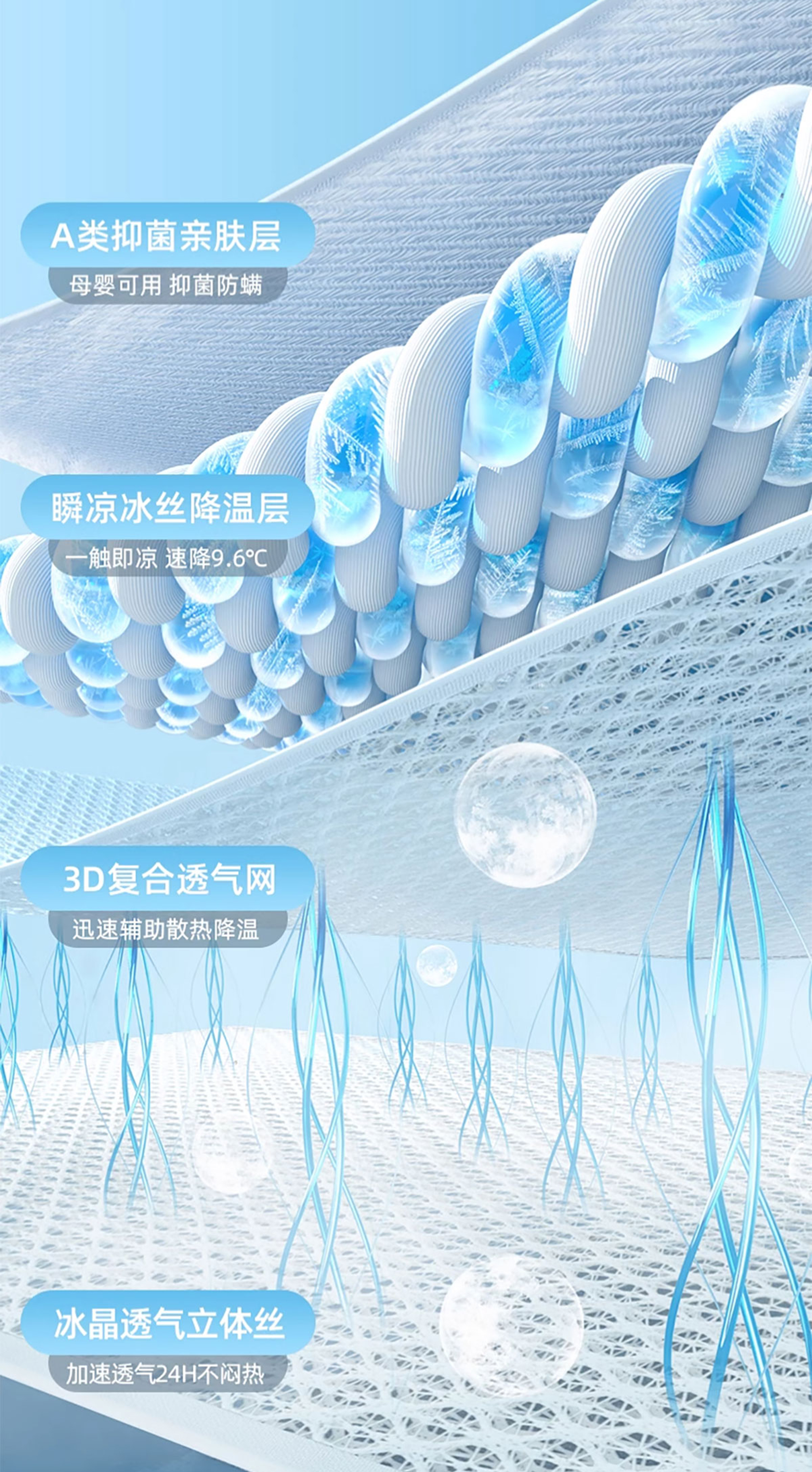 This product employs a high-density weaving technique to skillfully combine polyester fibers with regenerated cellulose fibers, resulting in superior cooling performance, excellent breathability, and good hygiene. Its bottom features a specially designed dual-layer mesh structure to ensure a cool and breathable micro-environment for the skin. This enables users to immediately feel coolness upon contact with the mat, offering them a comfortable sleeping experience. Moreover, the product with outstanding moisture-wicking properties facilitates quick sweat evaporation, making the skin dry and crisp for a long time. To meet hygienic requirements, it utilizes the A-class infant-friendly fabric, which is antibacterial and mite-proof, effectively preventing issues like allergies and itches. Additionally, the mat, made from eco-friendly materials, minimizes environmental pollution during its production and application, successfully practicing the idea of sustainable development.