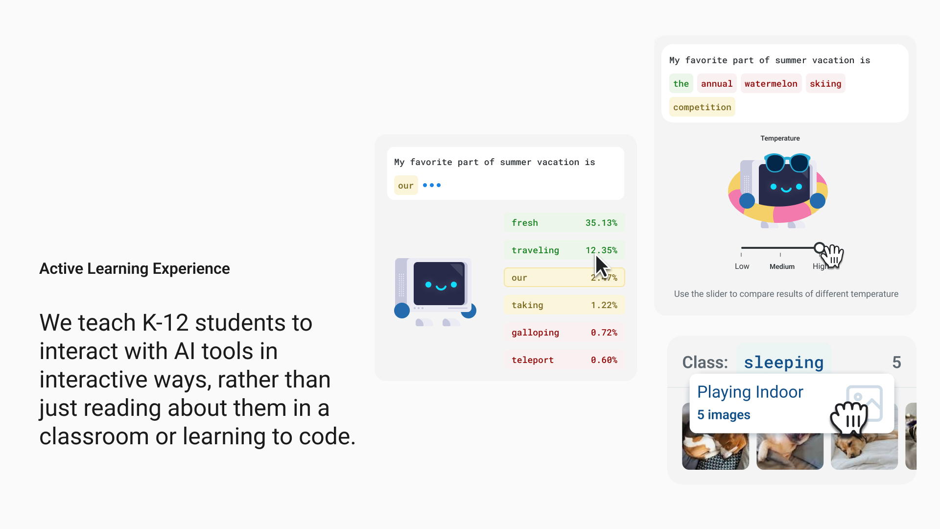 ActiveAI outperforms conventional “tell-and-practice” methods by providing an engaging, hands-on learning experience that requires no advanced technical expertise from teachers or students. Through rigorously controlled classroom studies, ActiveAI has demonstrated significant improvements in students’ understanding of AI concepts and their self-reported confidence. Since its launch in 2024, the platform has been adopted by eight partner schools and currently supports over 5,000 active learners. Developed by a team of designers and learning scientists from Carnegie Mellon University and National Tsing Hua University, ActiveAI’s work has led to five peer-reviewed publications in leading academic conferences.
