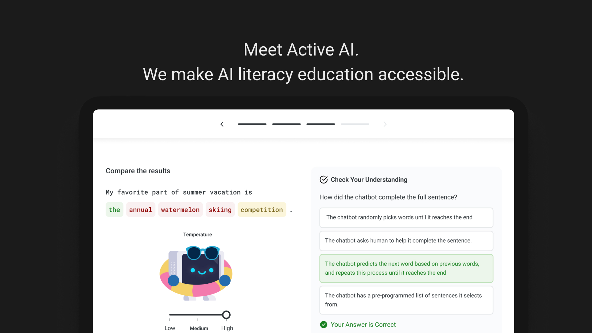 By making K–12 AI literacy education widely accessible, ActiveAI is shaping a new generation of innovators, critical thinkers, and responsible digital citizens. Students gain the skills and confidence to critically and ethically engage with AI technologies, understanding both their transformative potential and inherent limitations.