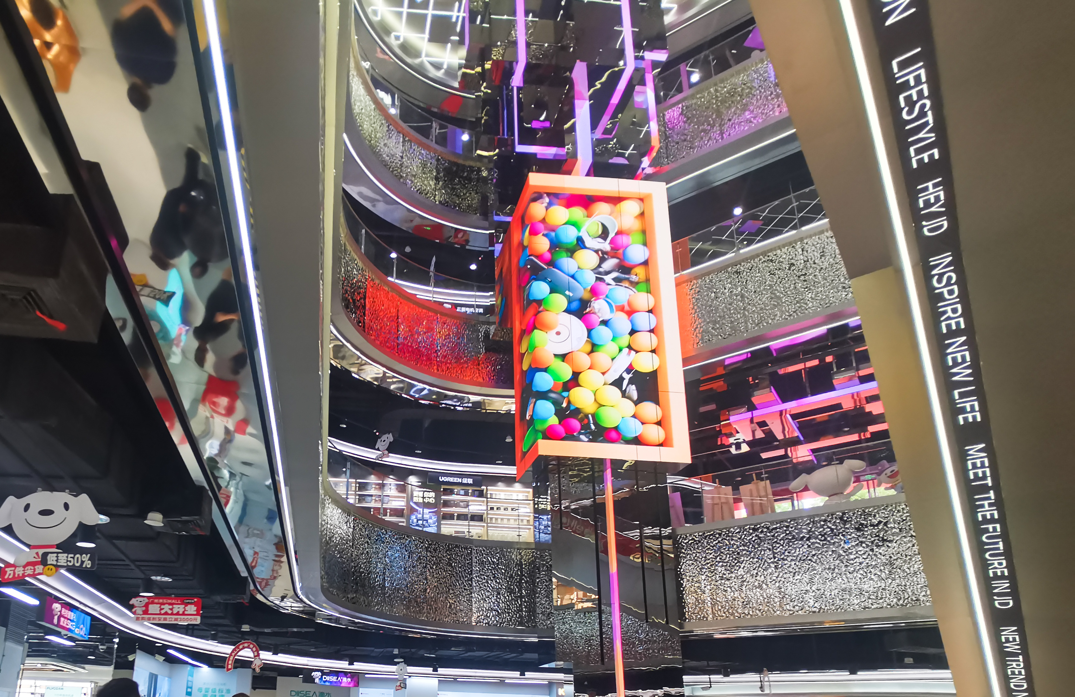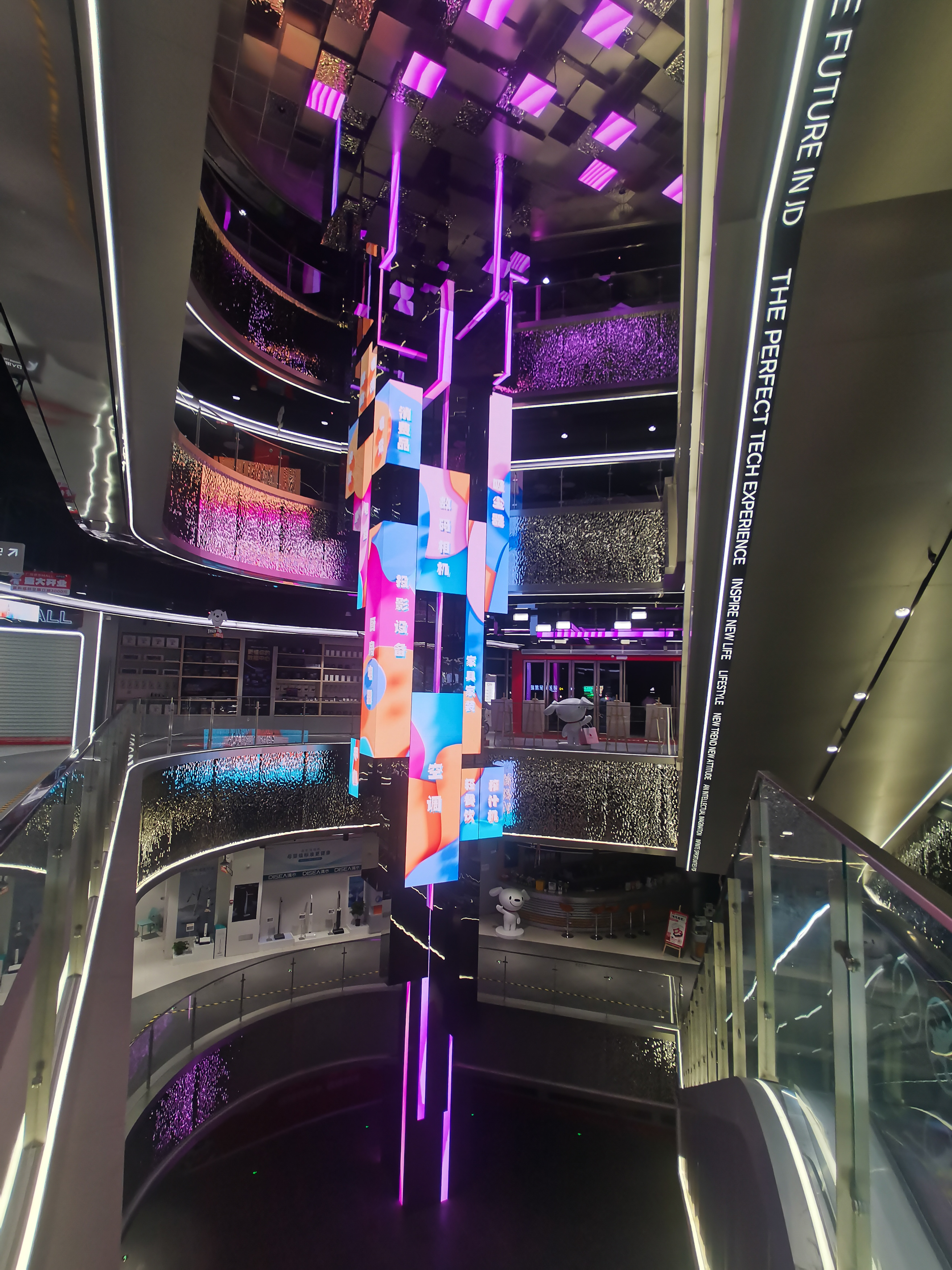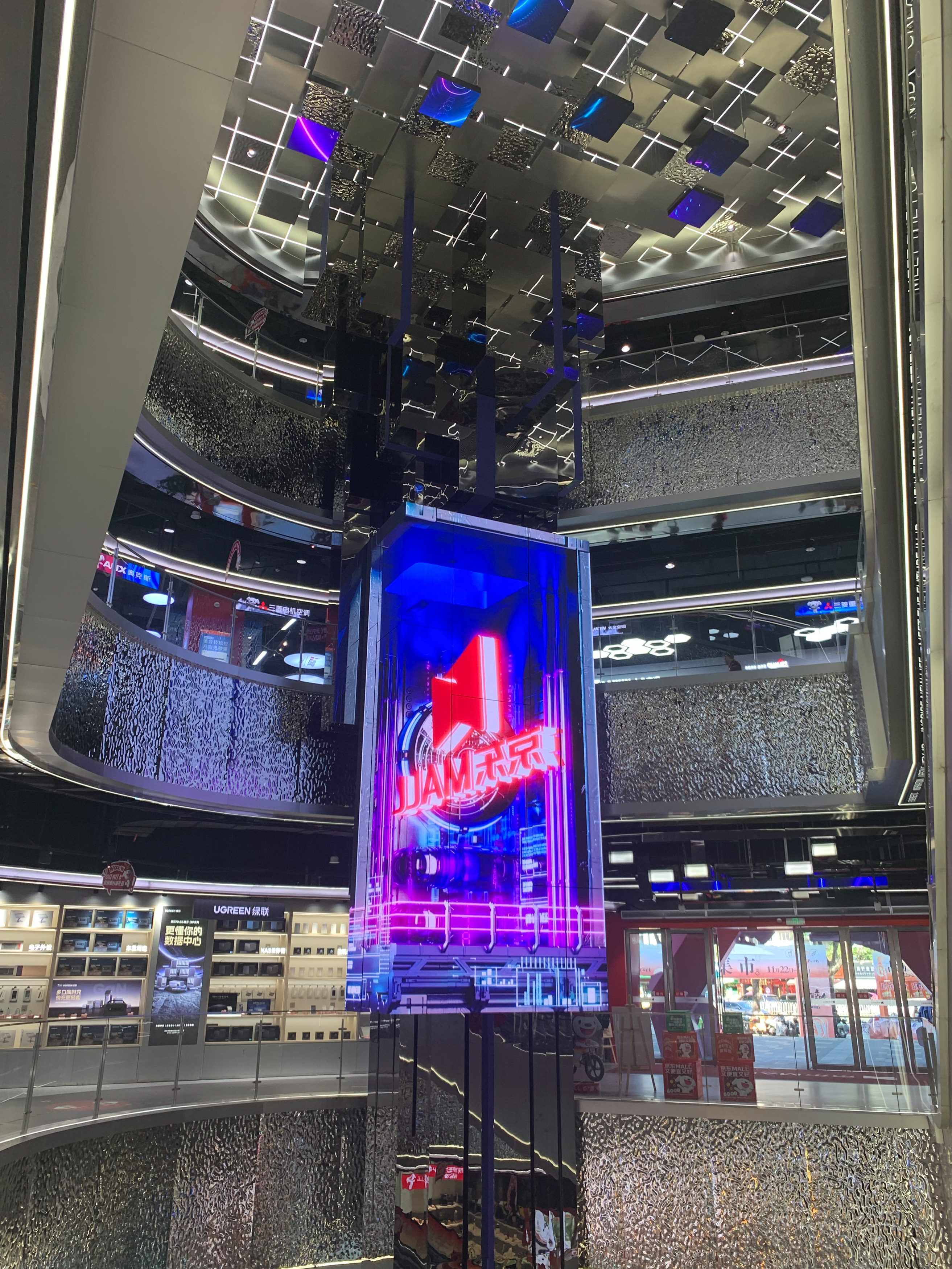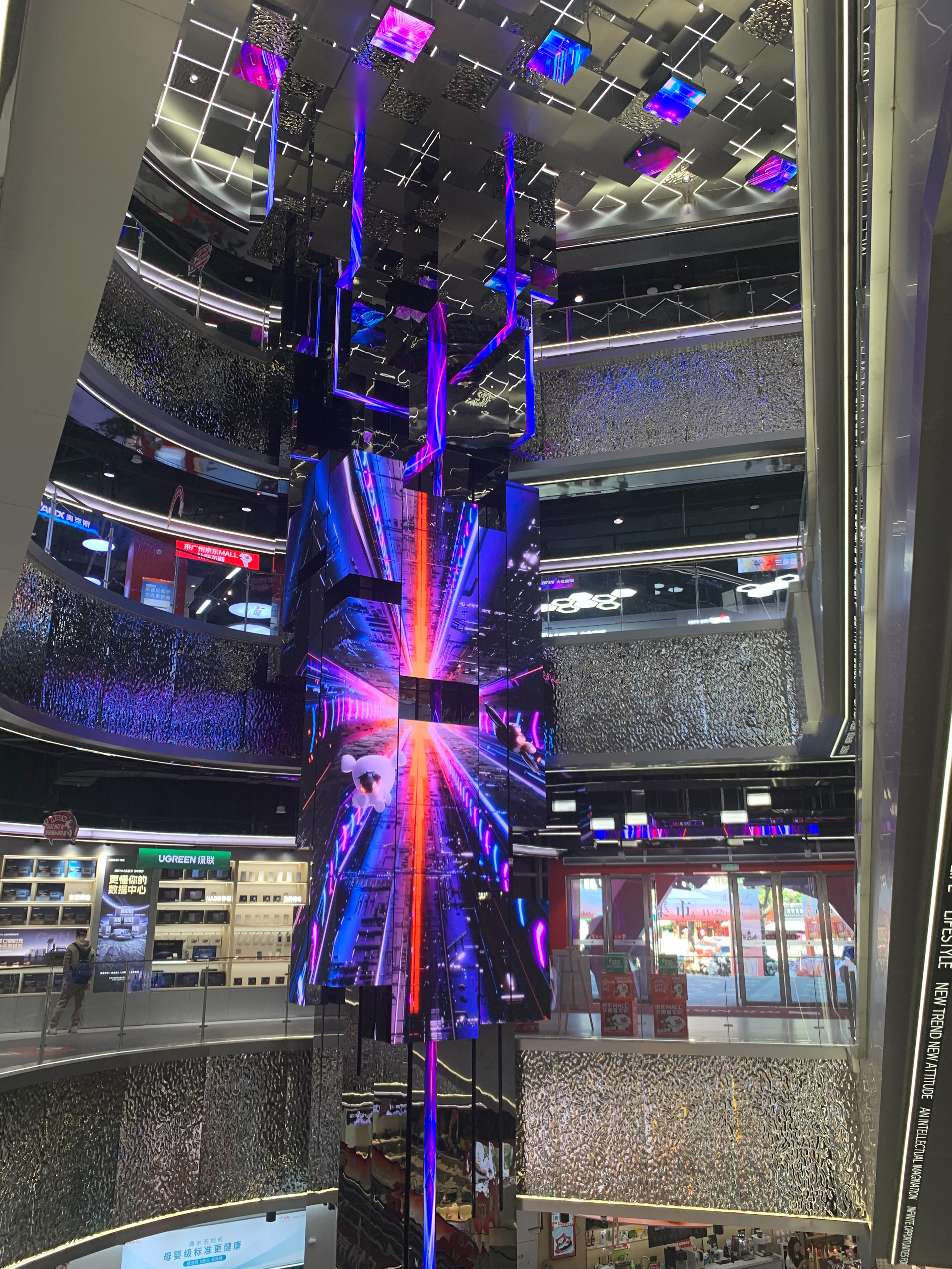 The project is located in Guangzhou City, China, Haizhu District, Industrial Avenue North, No. 110, Guangzhou Jingdong MALL shopping mall, which is a very creative intelligent lifting LED screen, consists of 11 pieces of up and down movement of the LED screen composition, 11 screens, which also includes 4 pieces of 90 ° corner of the LED screen, the screen's movement of the track for the 12m up and down range of movement, can be independently controlled by each movement of the LED screen units The movement of the screen track is 12m up and down, and each movement LED screen unit can be controlled independently to move any position on the track. In the mechanical device structure, our main movement structure materials are made of aviation aluminum profiles; mechanical device control, using PLC braking control + logic control nodules control mode, with the screen anti-collision, anti-deorbit, intelligent correction and other functions, is the whole set of devices more stable and reliable; in the display of video content, we are in the production of video to fully take into account the screen's movement In terms of video content display, we give full consideration to the movement of the screen in the video production, the screen picture and the screen position with the movement of the display, so that visitors feel more vivid and interesting.