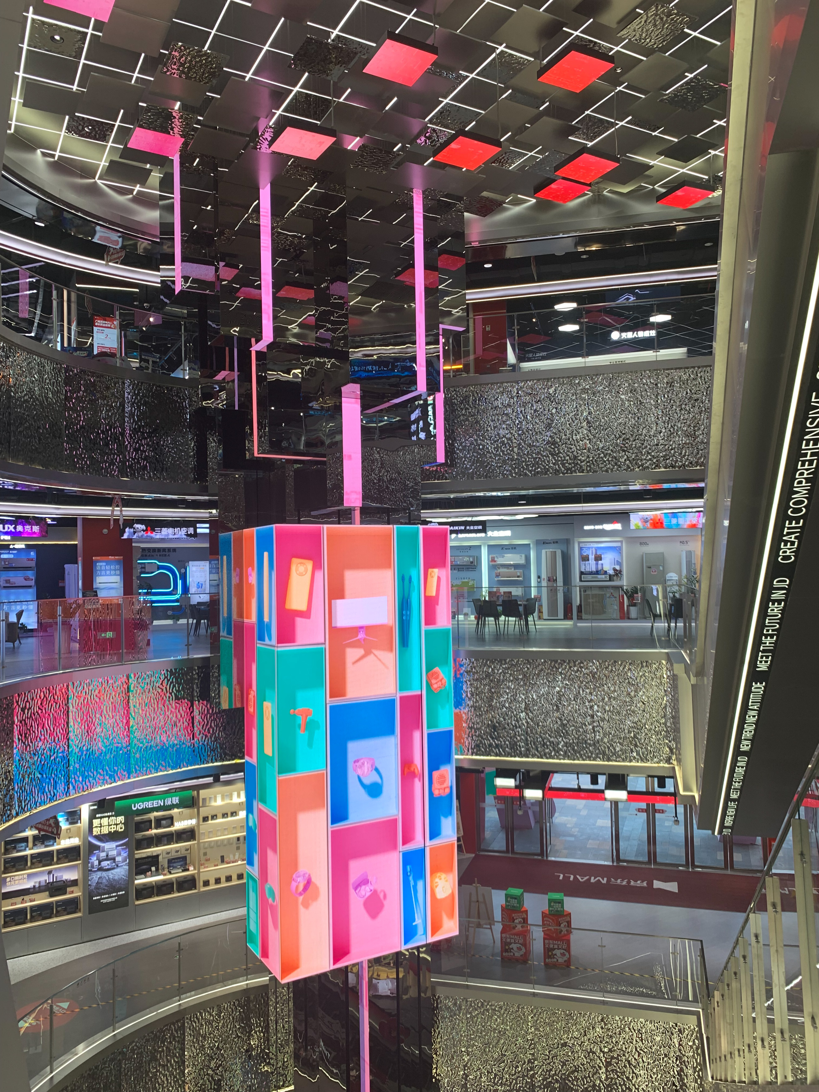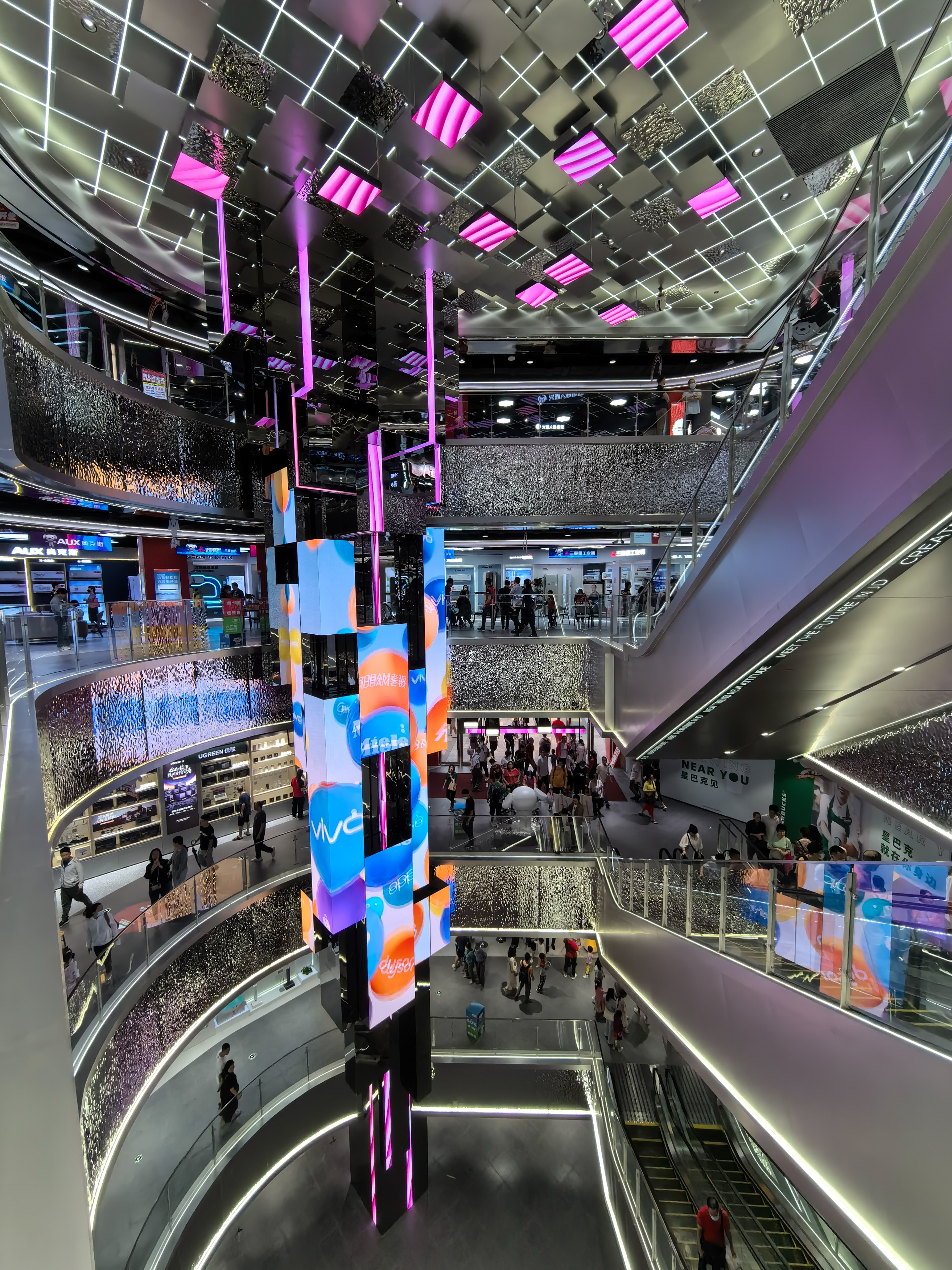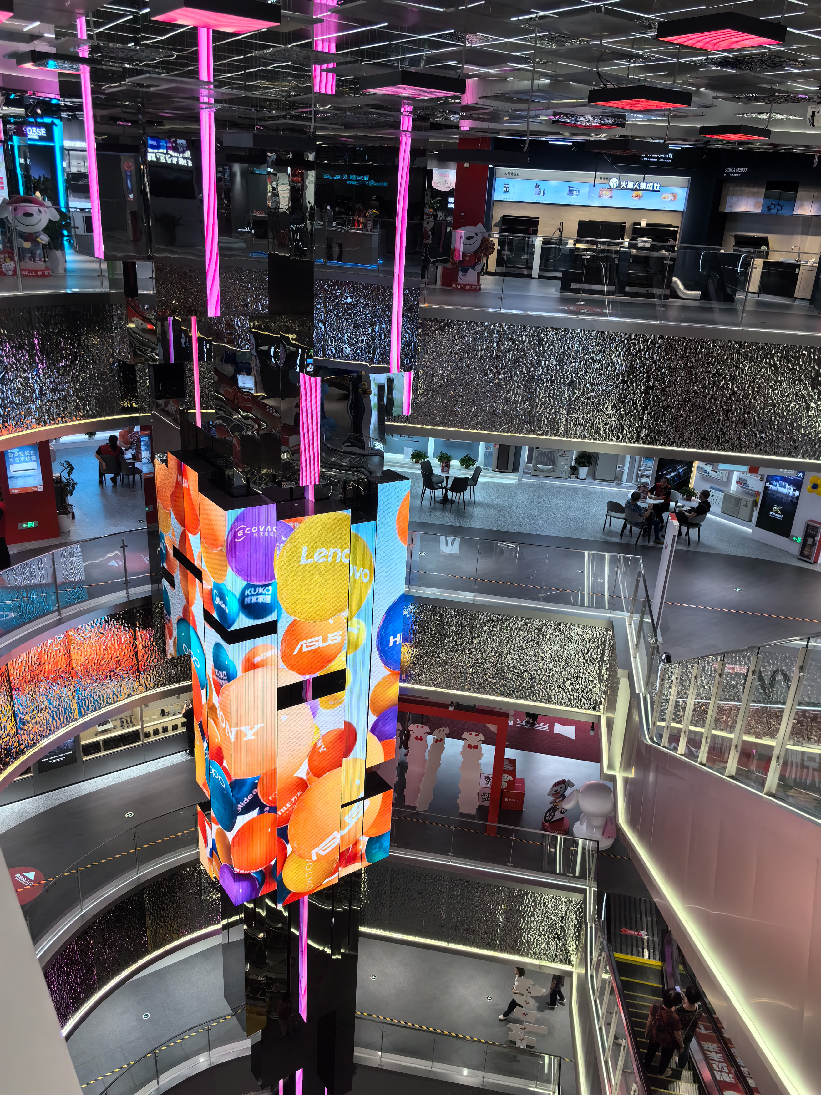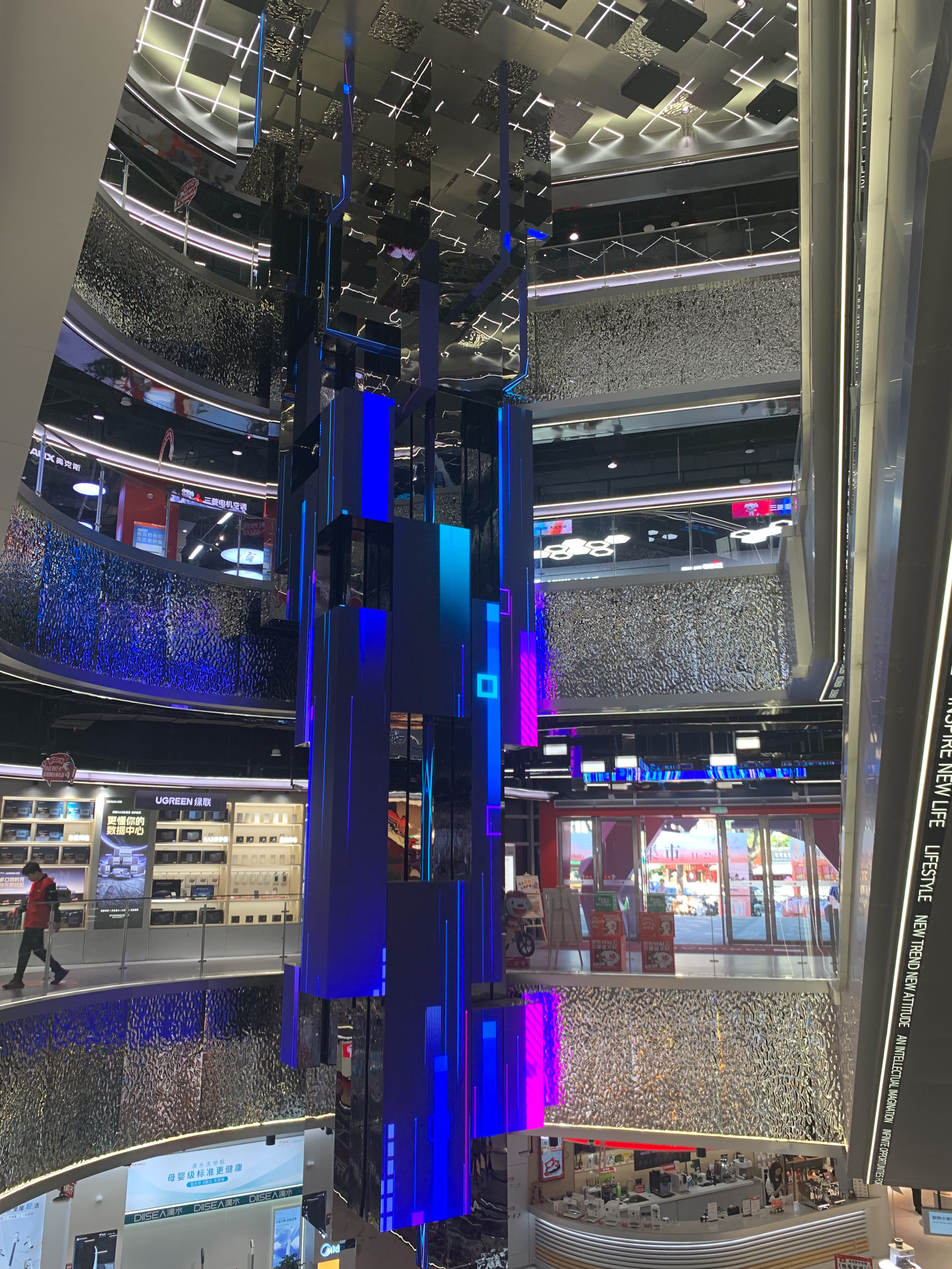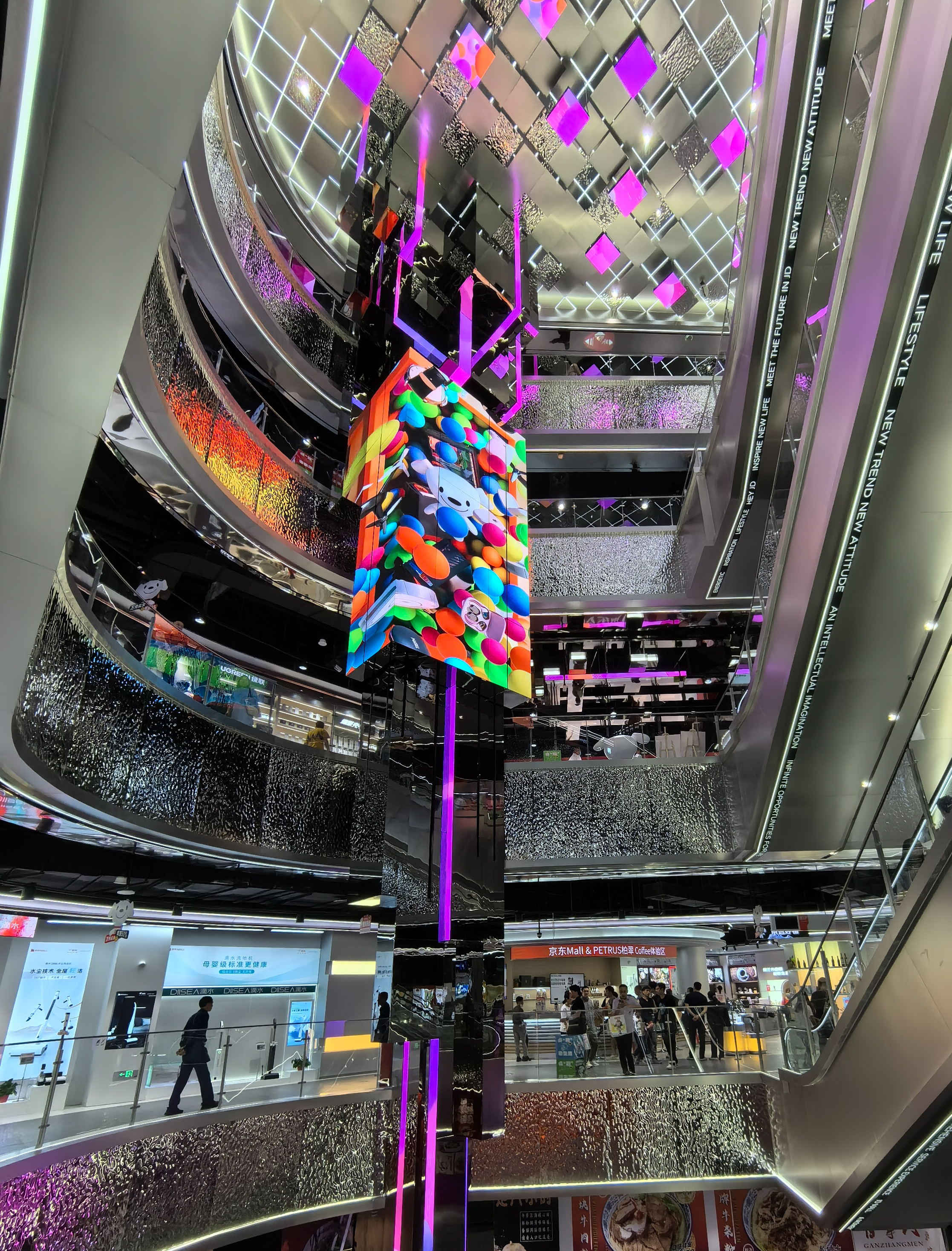 The project is located in Guangzhou City, China, Haizhu District, Industrial Avenue North, No. 110, Guangzhou Jingdong MALL shopping mall, which is a very creative intelligent lifting LED screen, consists of 11 pieces of up and down movement of the LED screen composition, 11 screens, which also includes 4 pieces of 90 ° corner of the LED screen, the screen's movement of the track for the 12m up and down range of movement, can be independently controlled by each movement of the LED screen units The movement of the screen track is 12m up and down, and each movement LED screen unit can be controlled independently to move any position on the track. In the mechanical device structure, our main movement structure materials are made of aviation aluminum profiles; mechanical device control, using PLC braking control + logic control nodules control mode, with the screen anti-collision, anti-deorbit, intelligent correction and other functions, is the whole set of devices more stable and reliable; in the display of video content, we are in the production of video to fully take into account the screen's movement In terms of video content display, we give full consideration to the movement of the screen in the video production, the screen picture and the screen position with the movement of the display, so that visitors feel more vivid and interesting.