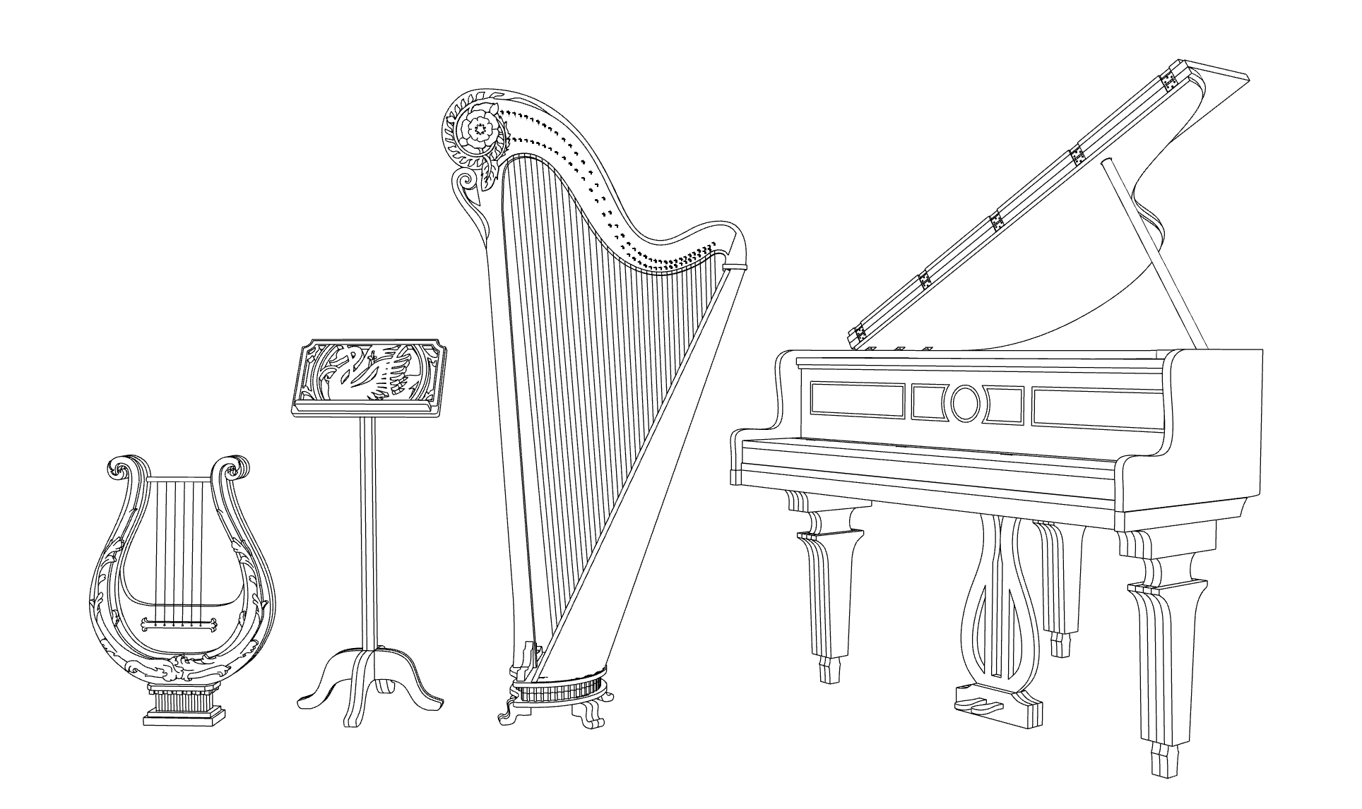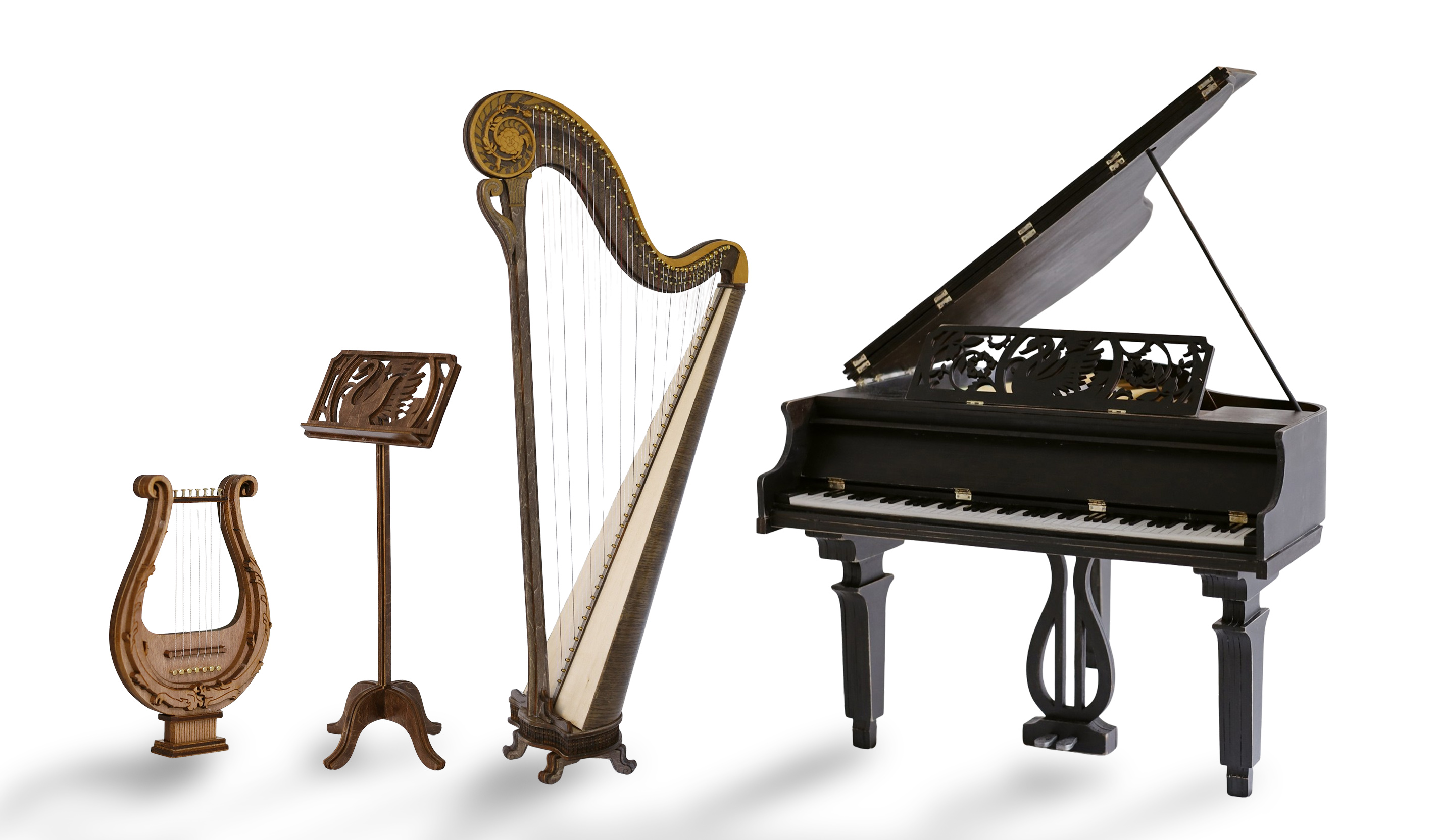 "Mini Sonata" is a captivating collection of four meticulously crafted miniature classical instruments: a lyre, a music stand, a harp, and a grand piano. Unlike typical 1:12 scale models, these stunning replicas are scaled at 1:4, offering an impressive level of detail and making them a striking addition to any home.