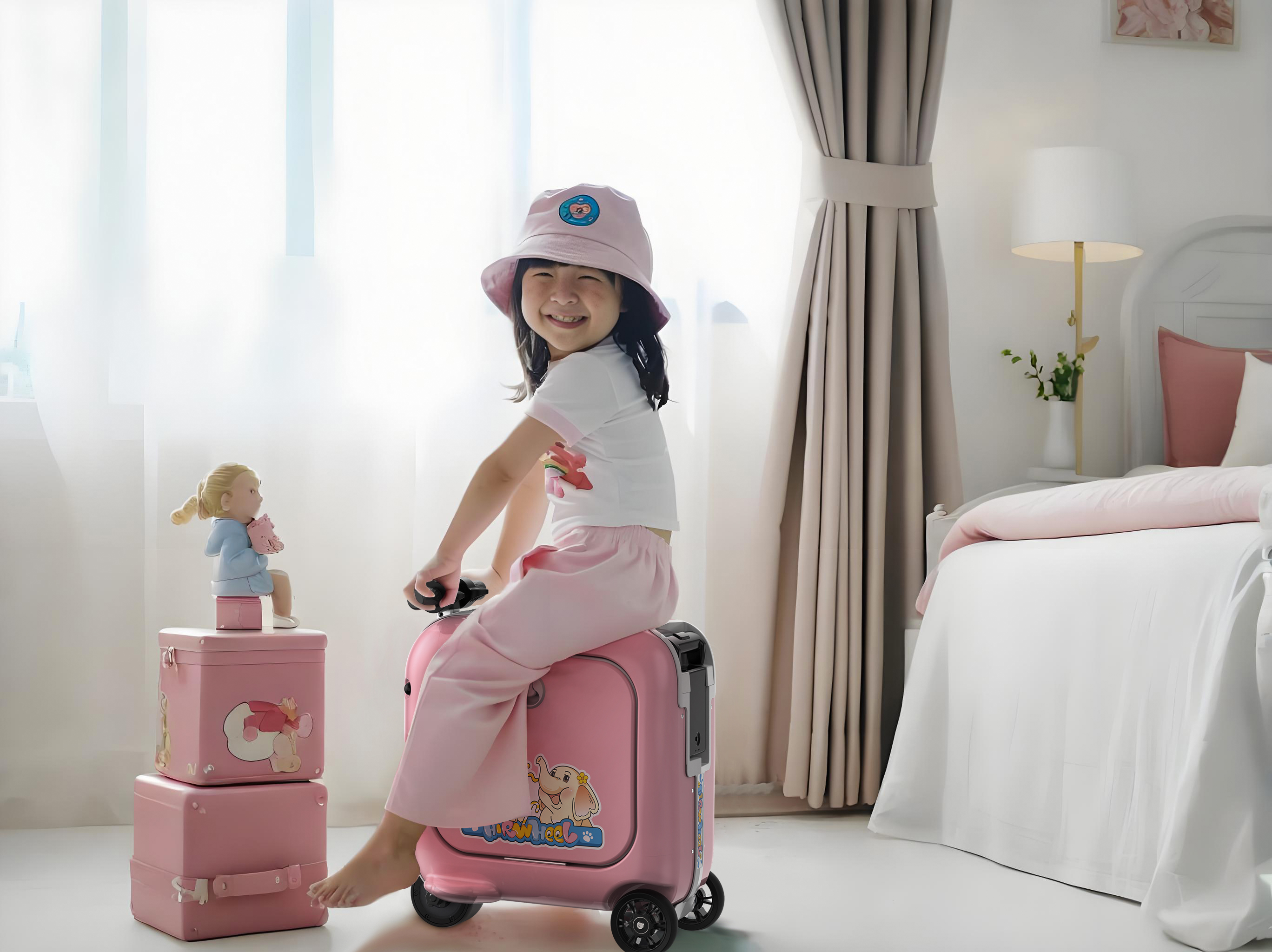 This boardable electric suitcase designed for children aged 0-8 years old is a clever fusion of luggage and electric riding tools, with a childish appearance that is both playful and practical. Equipped with a safe and stable electric drive system, the maximum speed of 8km/h, sensitive brakes to ensure safety, 20L large-capacity space to meet the storage needs, lightweight high-strength material scratch-resistant and wear-resistant, 4.8kg weight is convenient to carry. Built-in Bluetooth stereo and LED ambient light add fun to the journey, and the lithium battery meets the aviation specification, so it can be boarded directly. The universal wheel is smooth and quiet, brushless motor is efficient and durable, easy and steady riding, making the parent-child travel more worry-free and enjoyable.