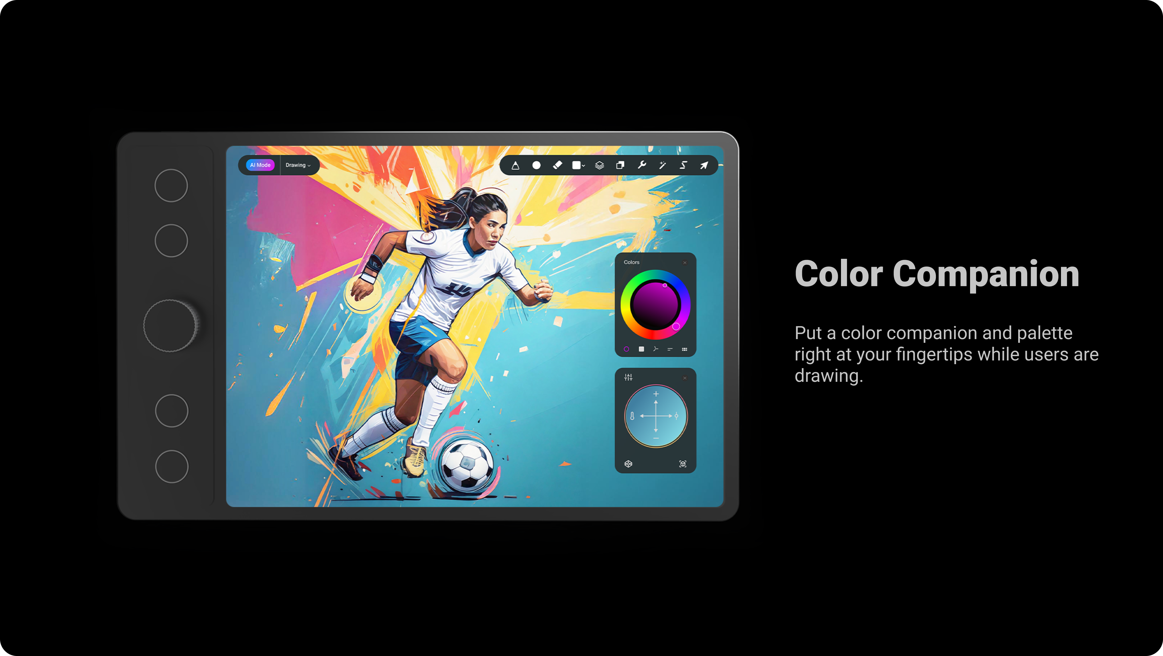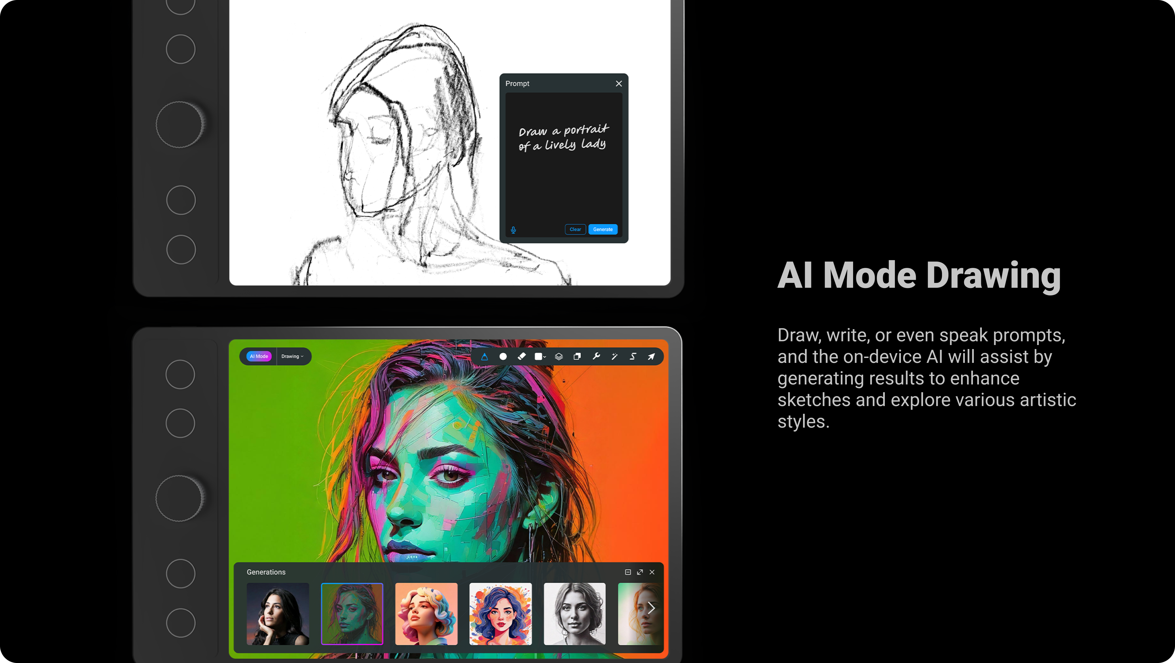 By default, the tablet operates as a standard drawing device, allowing users to sketch freely. To switch to AI Mode, users can simply press the button on the left-hand side of the tablet. In AI Mode, users can draw, write, or even speak prompts, and the on-device AI will assist by generating results to enhance sketches and explore various artistic styles.