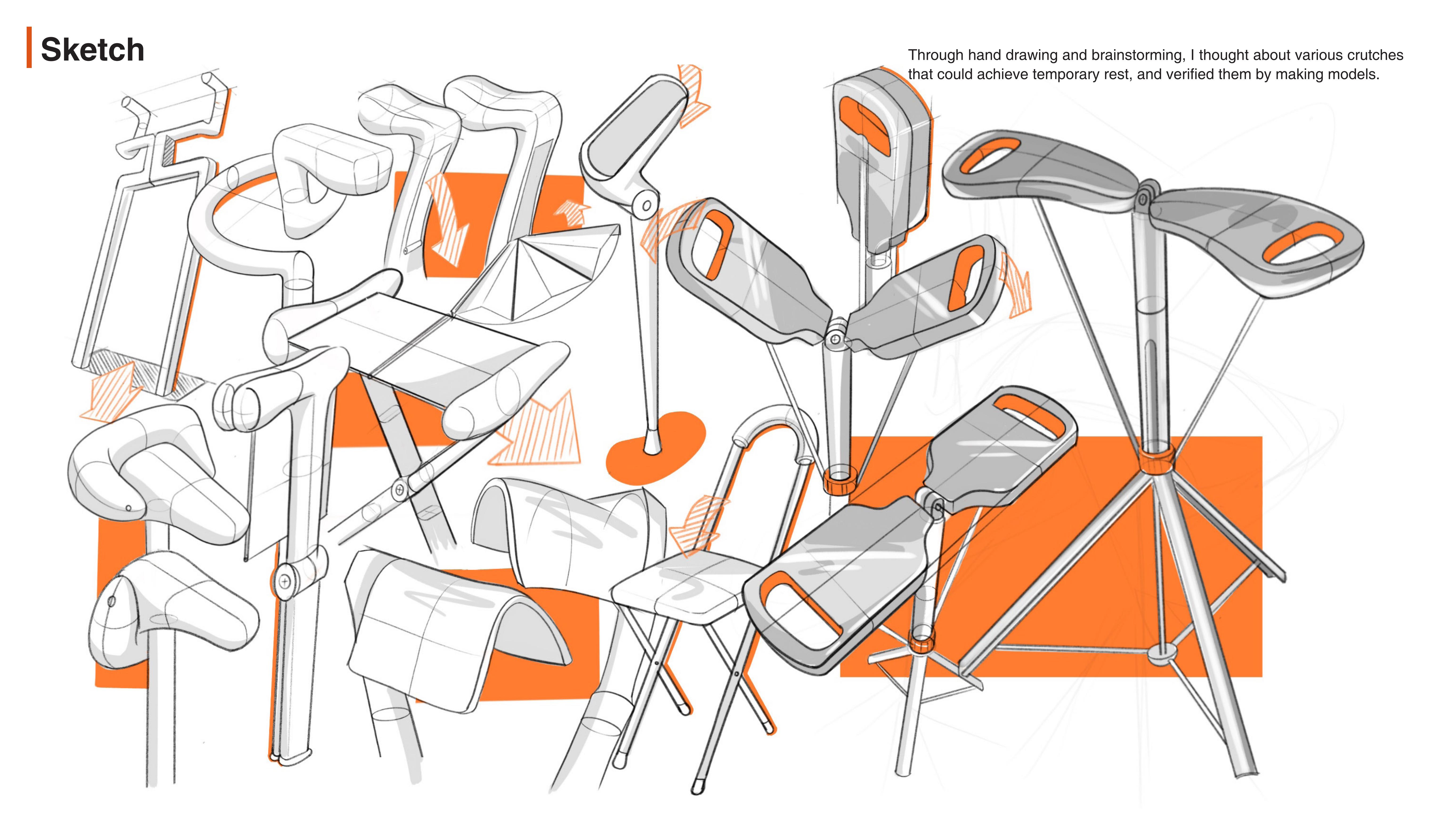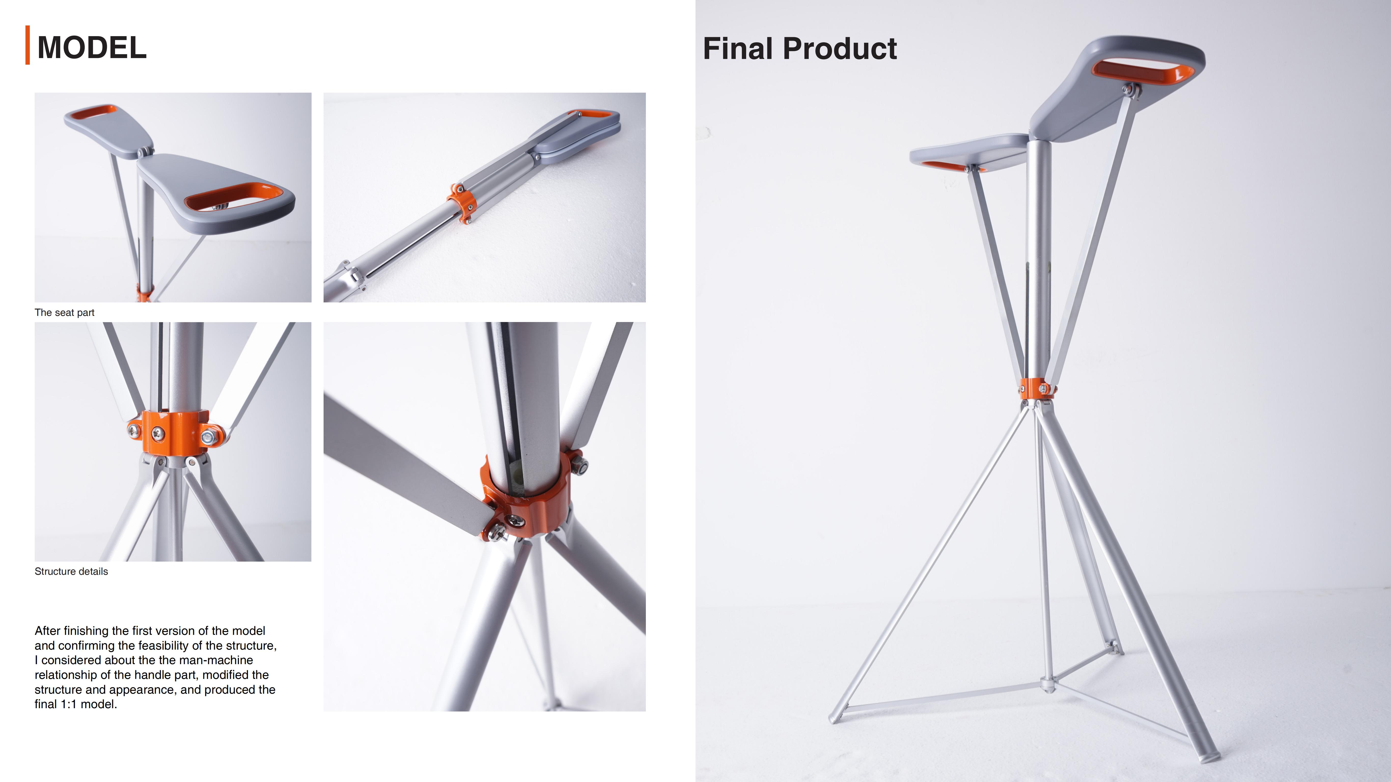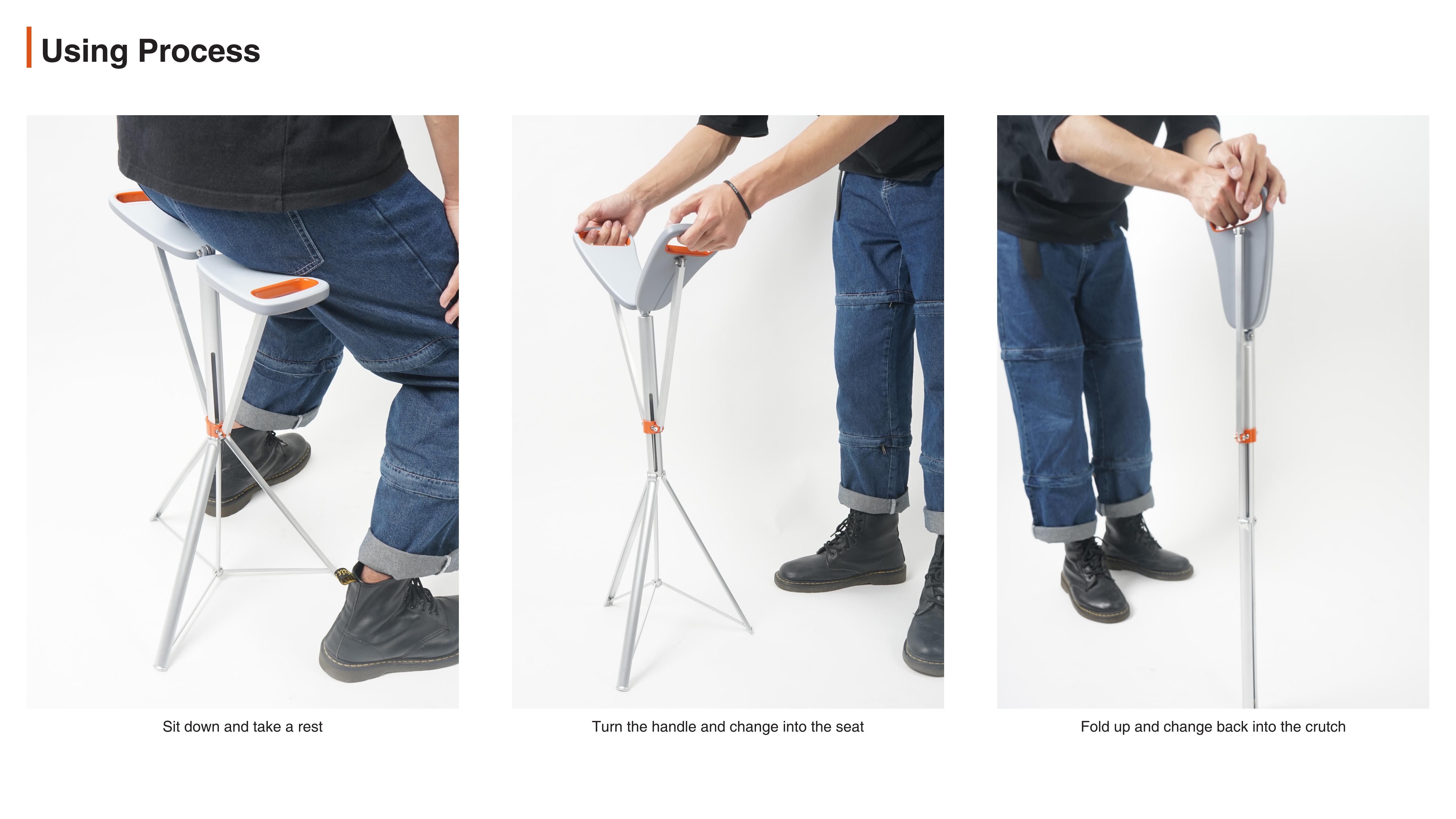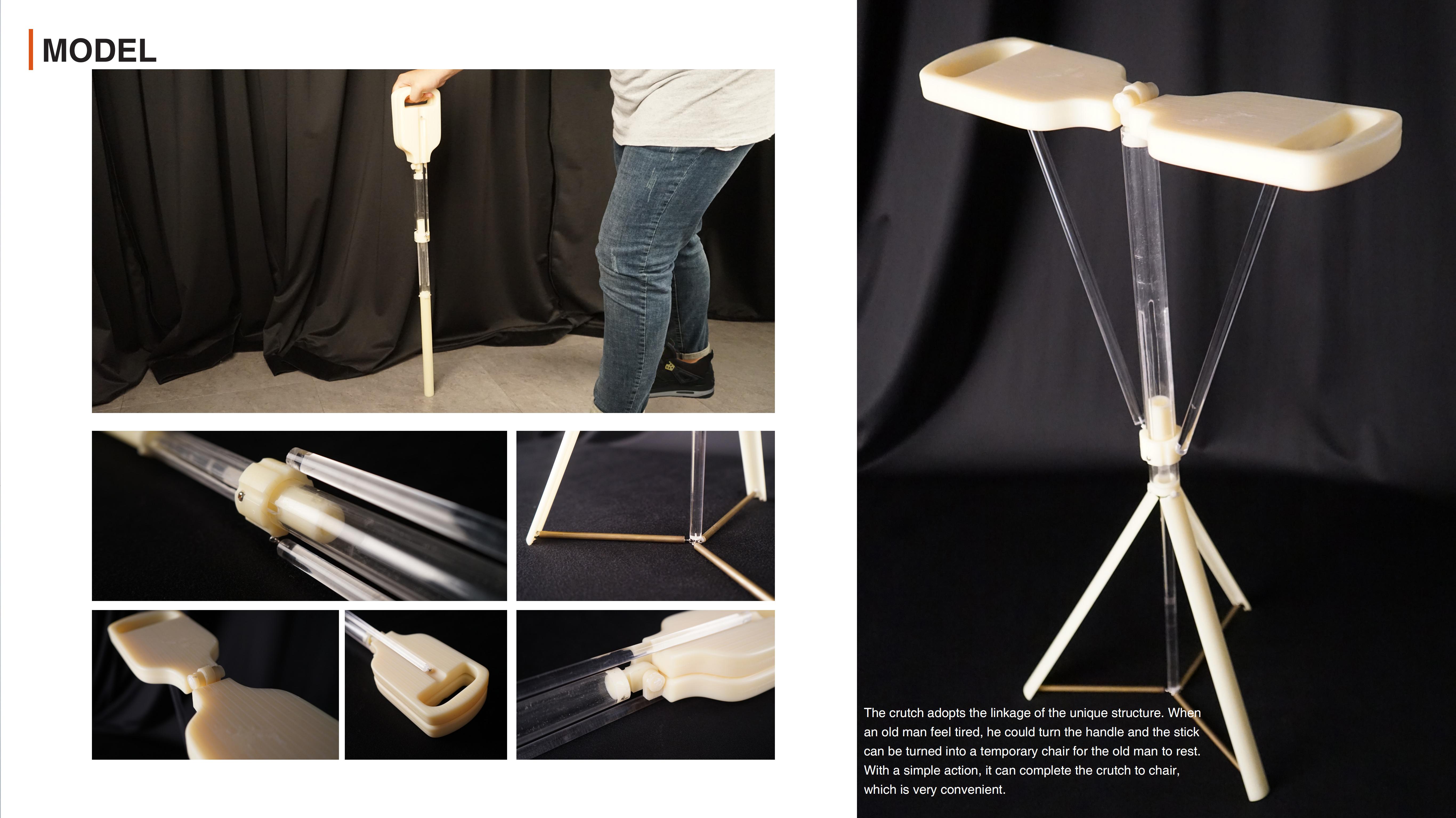 The crutch adopts the linkage of the unique structure. When an old man feel tired, he could turn the handle and the stick can be turned into a temporary chair for the old man to rest. With a simple action, it can complete the crutch to chair, which is very convenient. The handle is also ergonomic and comfortable for walking and switching.