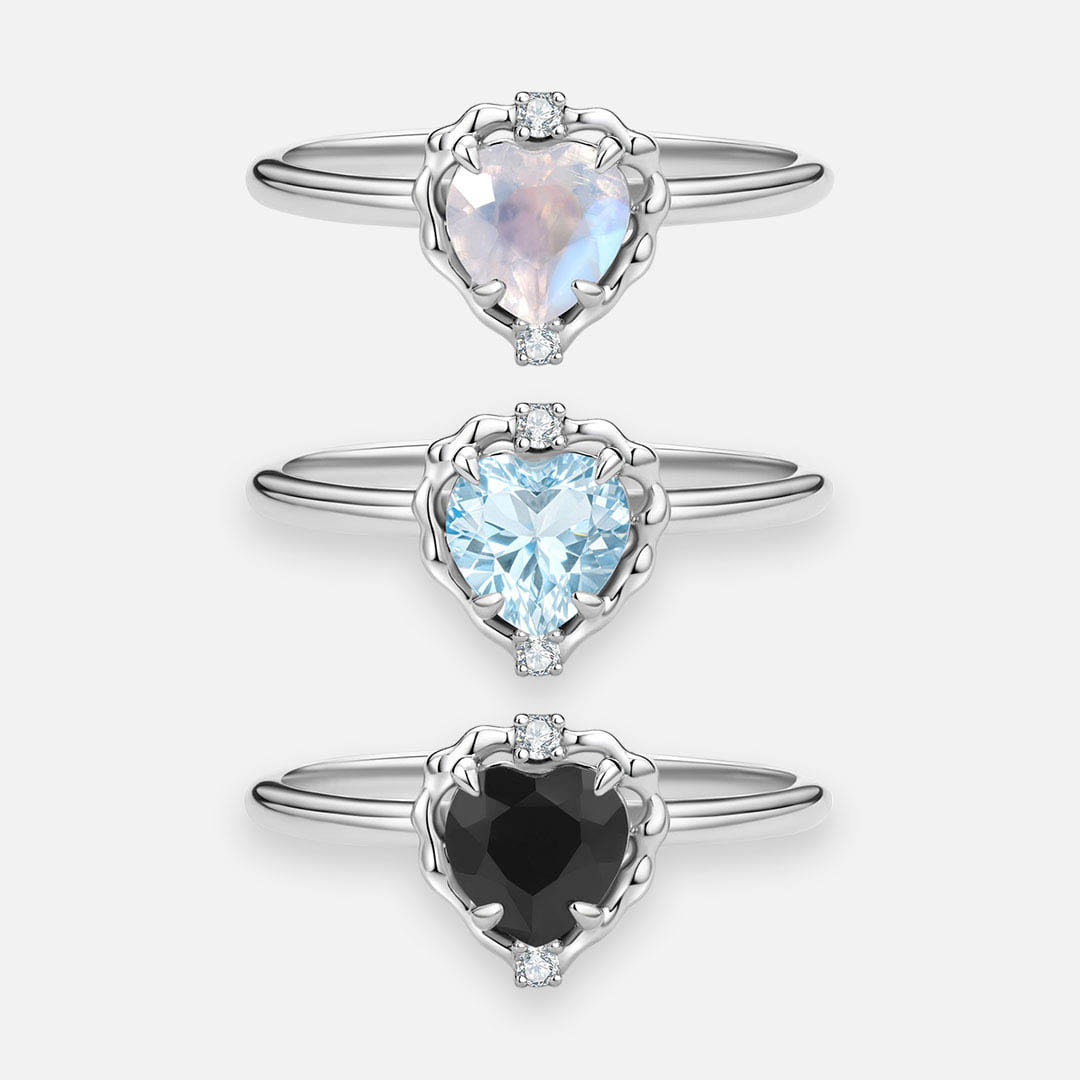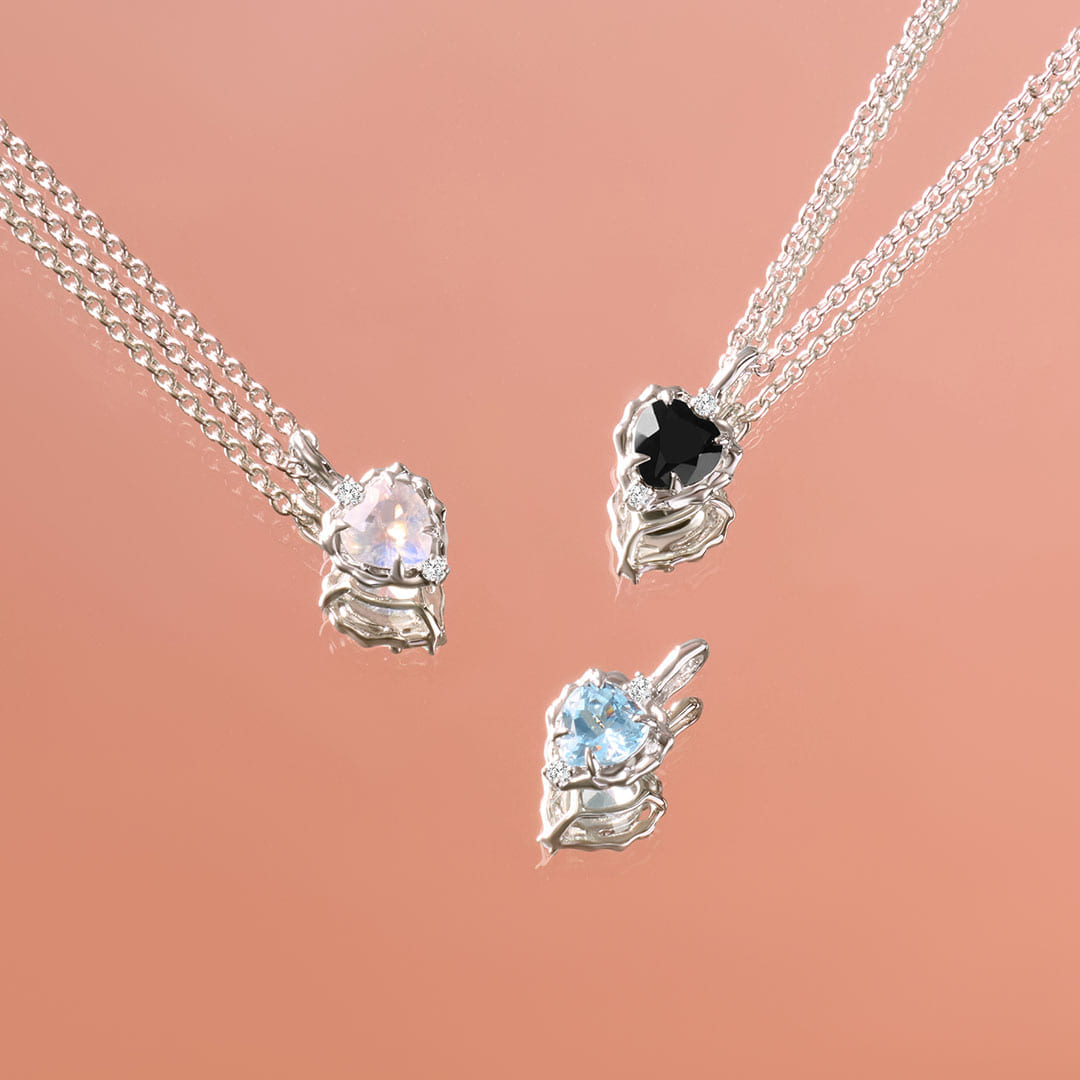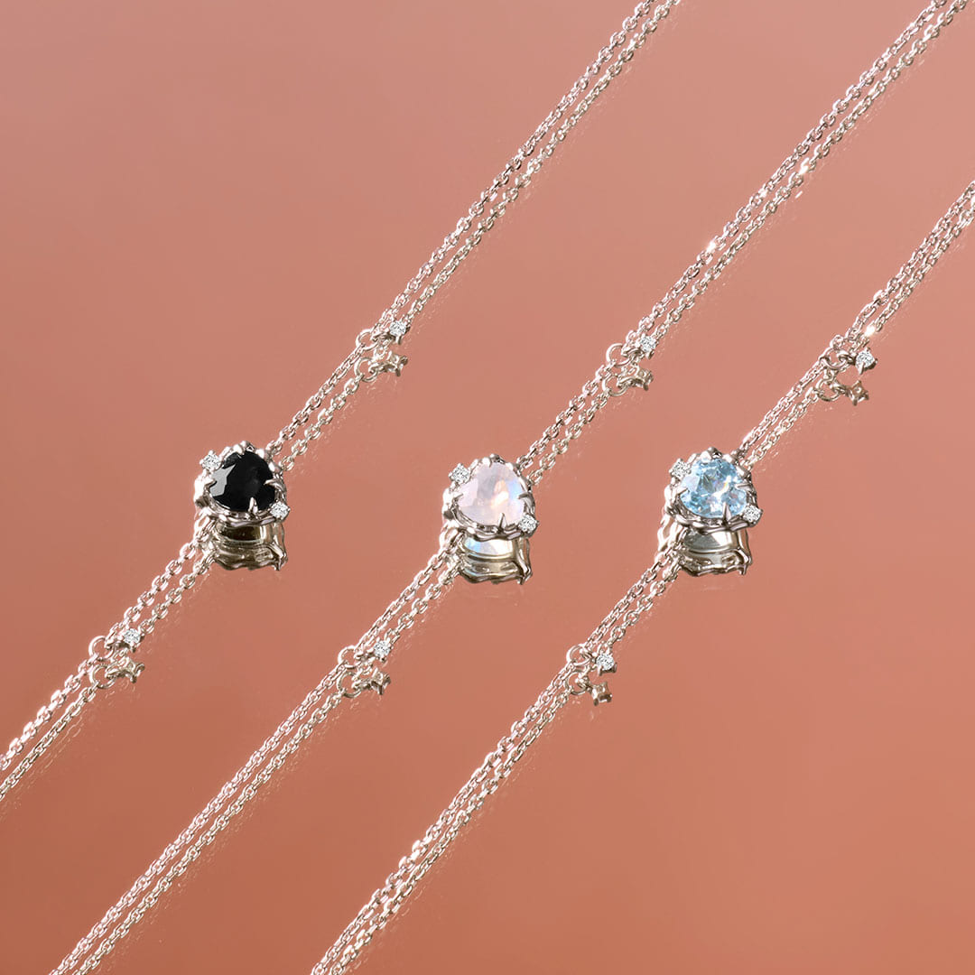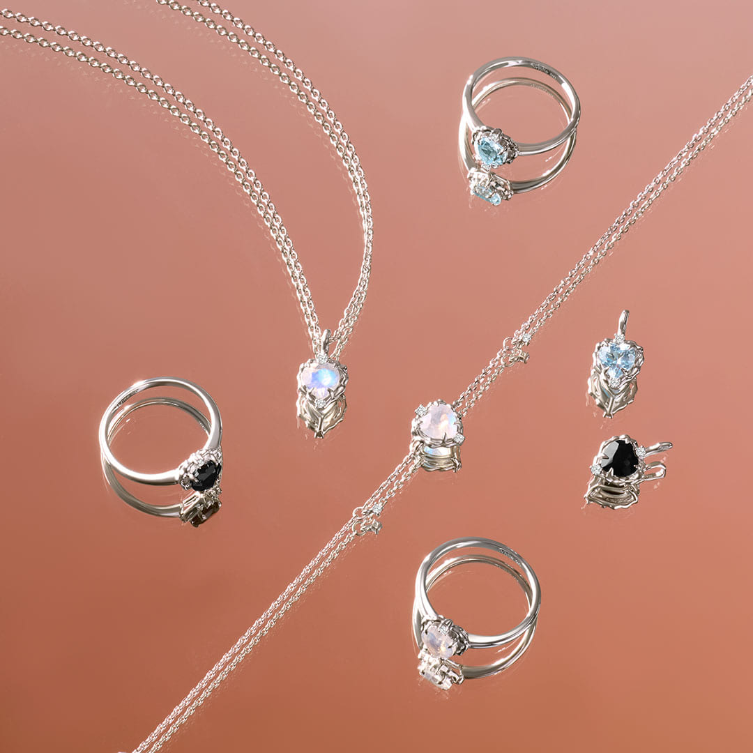 The Wavy Heart collection is inspired by water, using its fluid form to represent the emotions and connections between people. The collection is crafted from 925 silver and a variety of natural gemstones, including moonstone, topaz, and obsidian. The main part of the collection design uses wavy curves to wrap around the heart-shaped gemstones, symbolizing the softness and strength of our hearts. These design elements remind us that love and connection are the most precious parts of life.