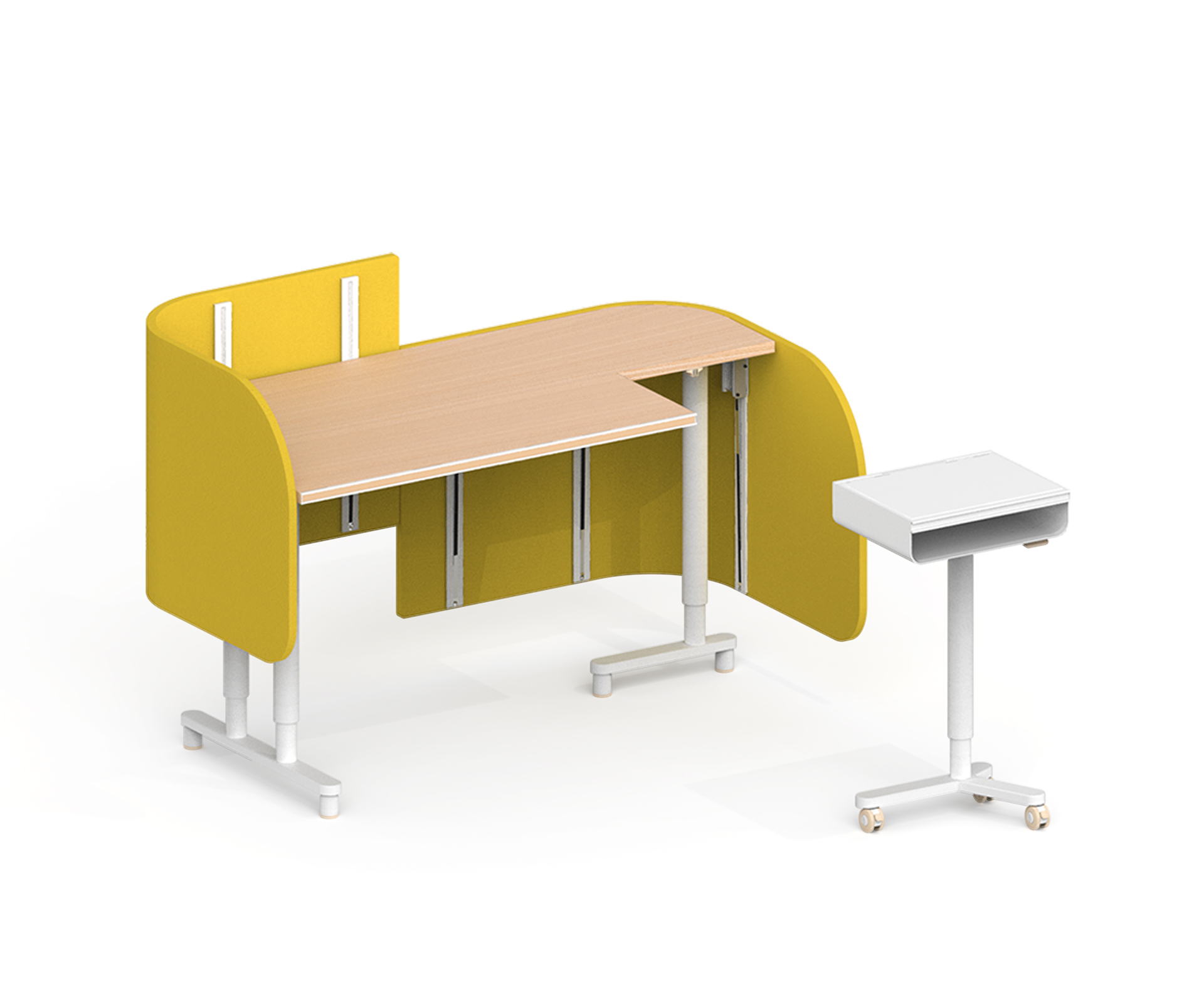 A primary challenge in open offices is the lack of defined personal space, which becomes inconvenient when moving between areas or attending meetings. The Moving Desk offers a practical solution by providing an adjustable partition that allows users to create a personal space, while still facilitating easy communication with nearby colleagues. The partition, made of PET-based acoustic felt, helps to reduce noise, contributing to a more focused work environment.