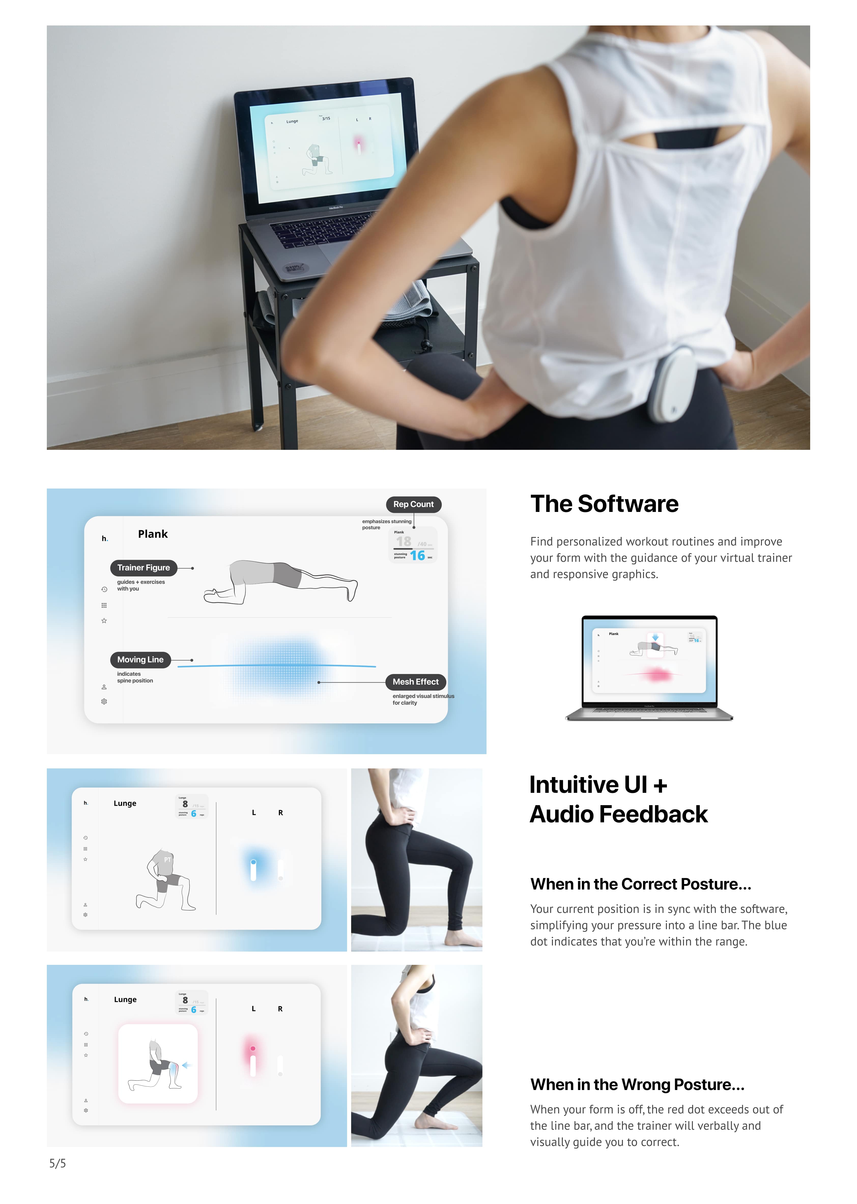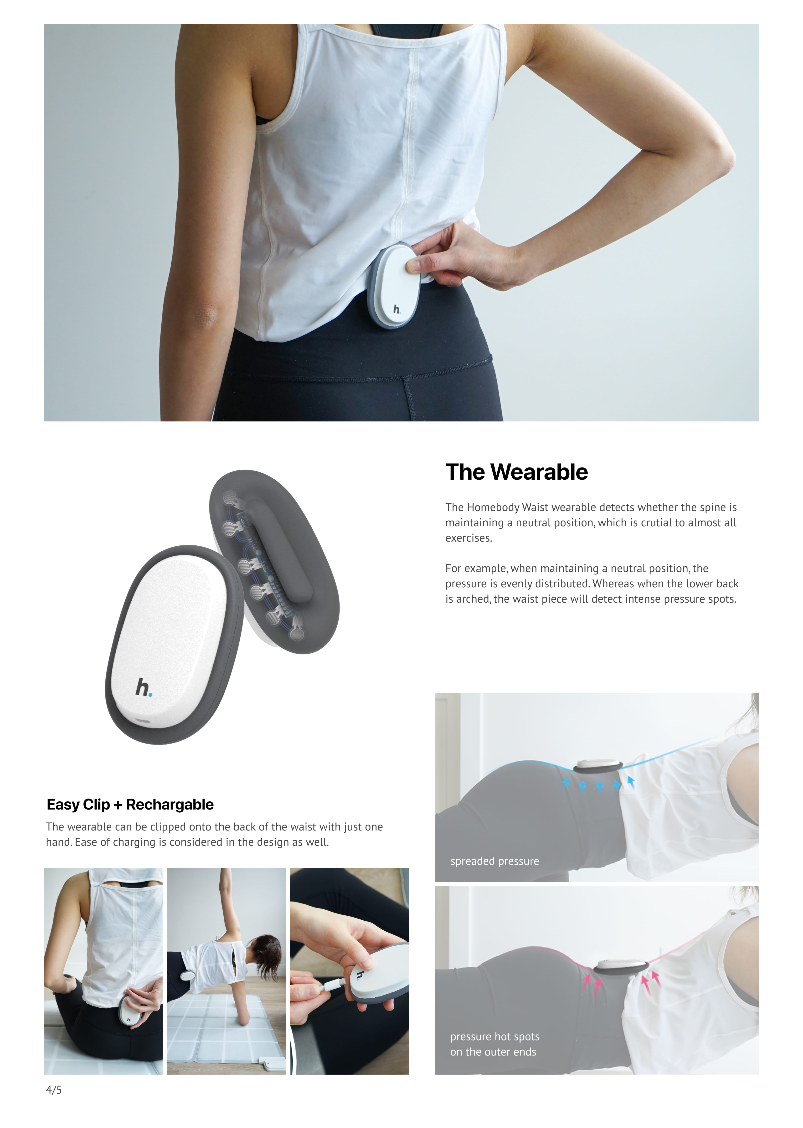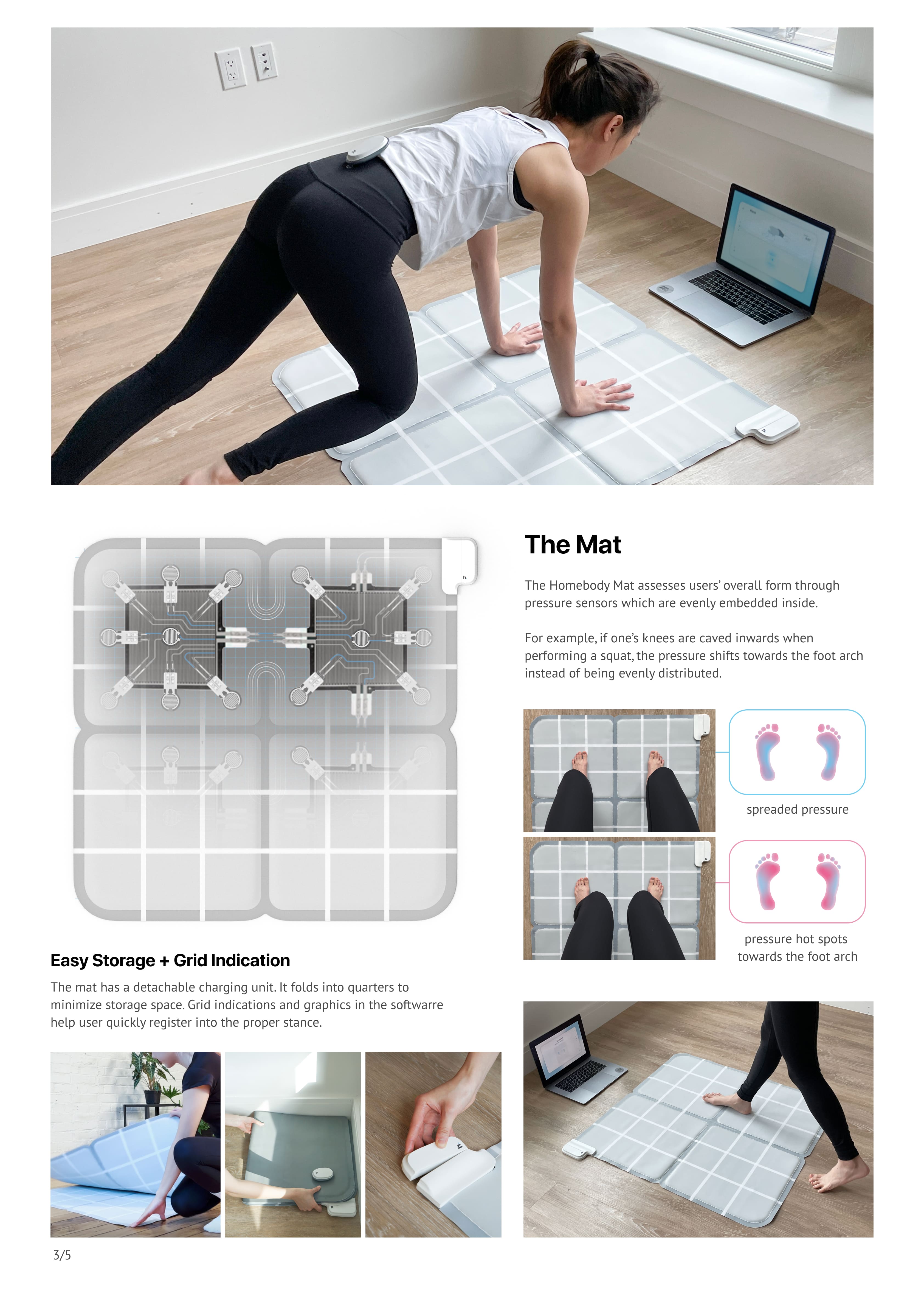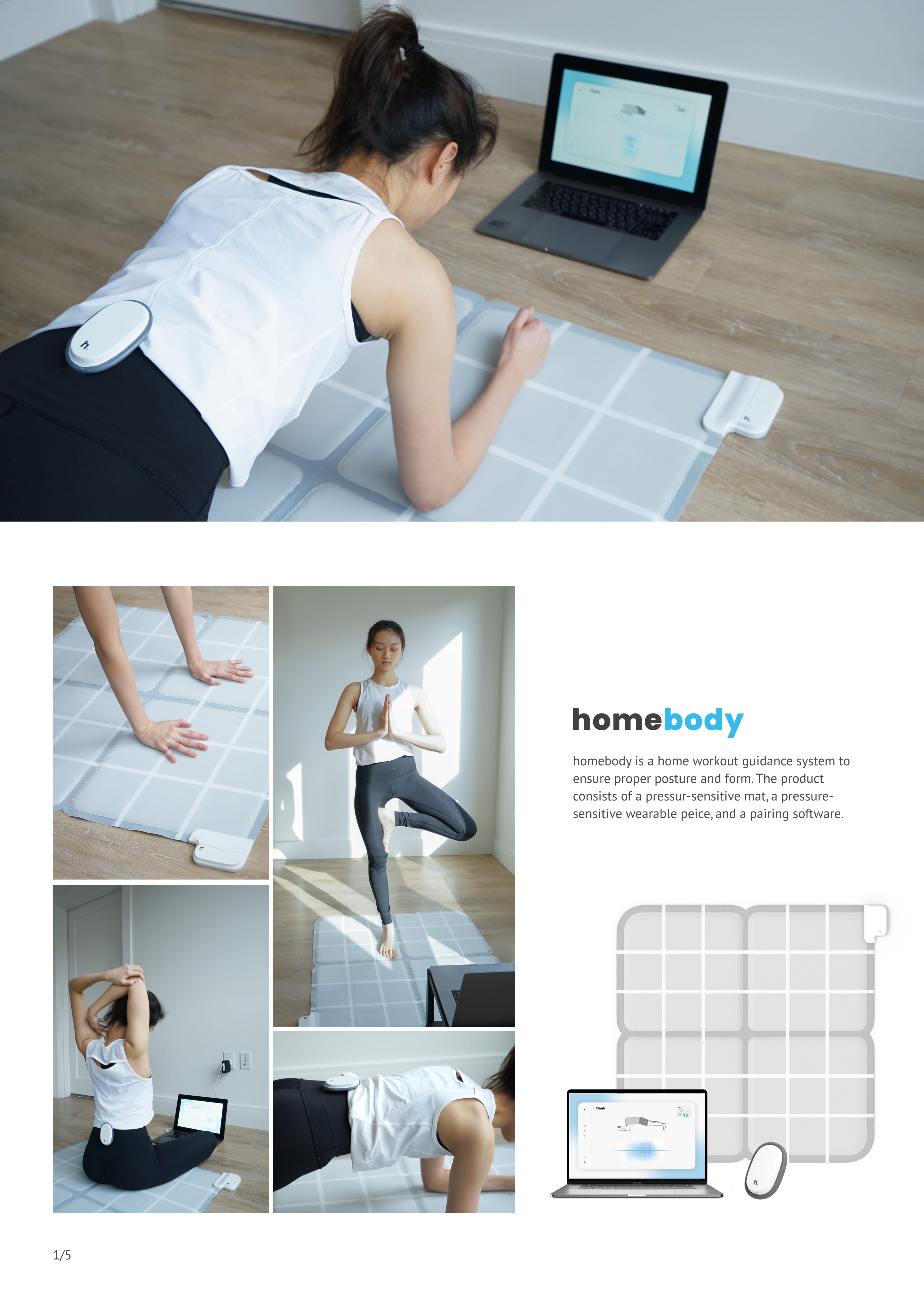 Homebody is a home workout guidance system to ensure proper postures. The product consists of a pressure sensitive mat, a pressure sensitive wearable piece, and a pairing software providing responsive graphics. In current home workout settings, vague instructions are provided, but there is no immediate feedback on whether or not the person is doing it correctly. Users are the only ones keeping themselves accountable. That doesn't necessarily lead to a quality workout and may even cause injuries. The Homebody Mat assesses users' overall form through pressure sensors which are evenly embedded inside. The Homebody Waist wearable detects whether the spine is maintaining a neutral position, which is crucial to almost all exercises. The software provides personalized workout routines and improve your form with the guidance of your virtual trainer, using color and intuitive graphic, as well as voice and audio feedback to best assist all workout scenarios- standing, laid down, or facing side ways.