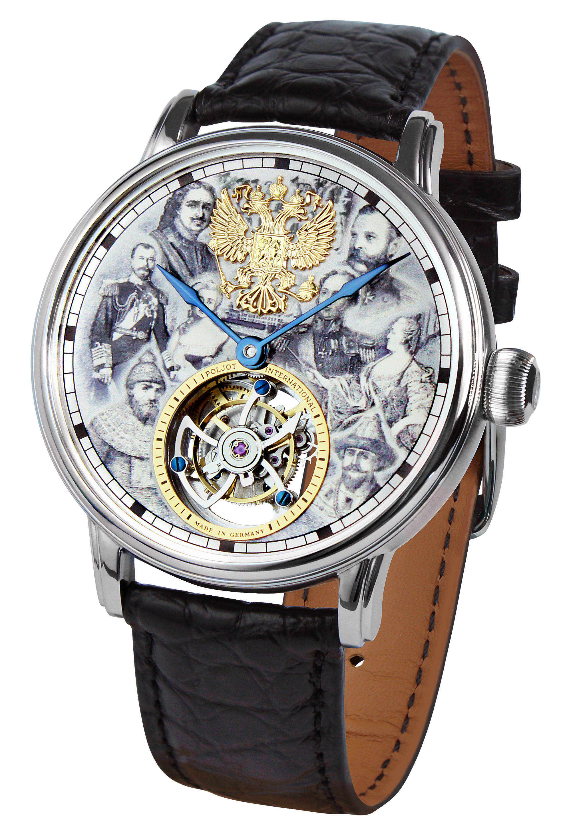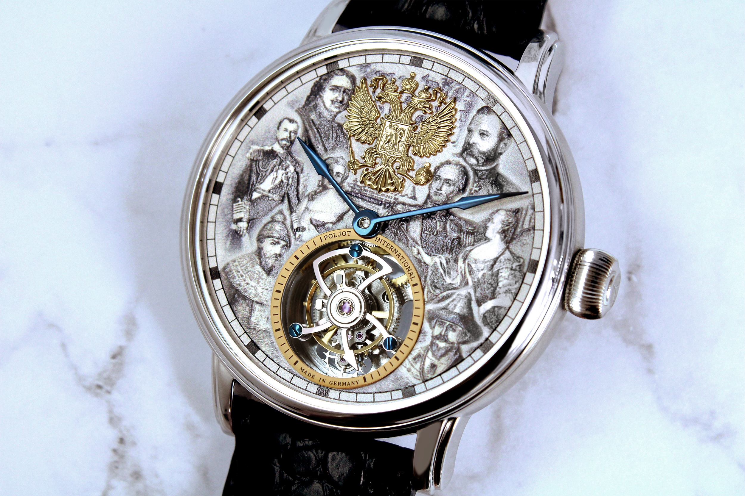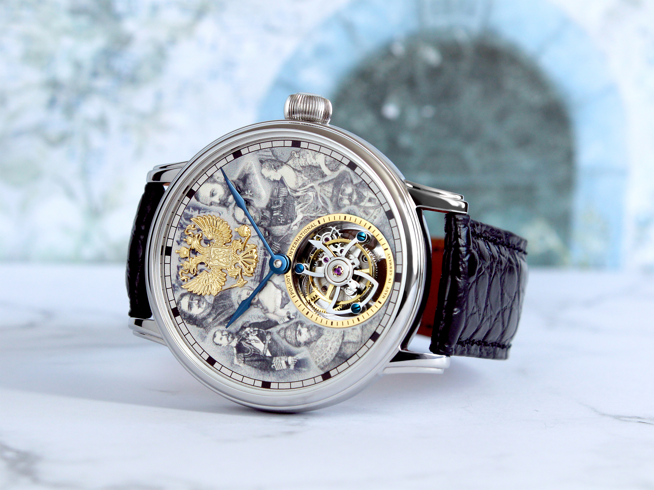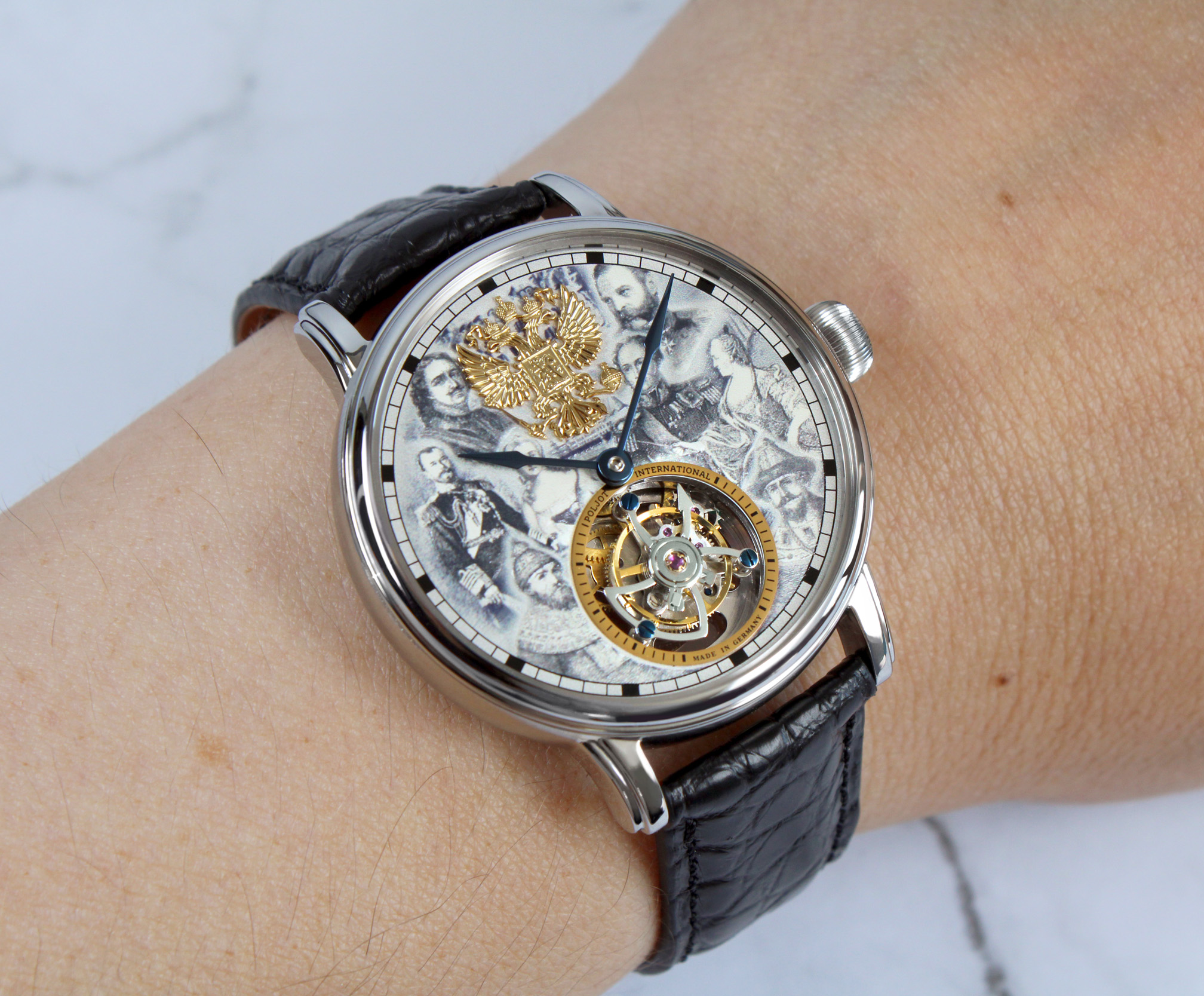 To appropriately honor these significant figures, their depiction was crafted using a high-precision 3D printing process, applied in multiple layers on the dial. This technique is new to the Poljot-International brand and was used for the first time in this special tourbillon, making this model truly unique. To enhance the overall design, the Romanov family crest was created as a high-quality applique, earning its rightful place at the 12 o’clock position.