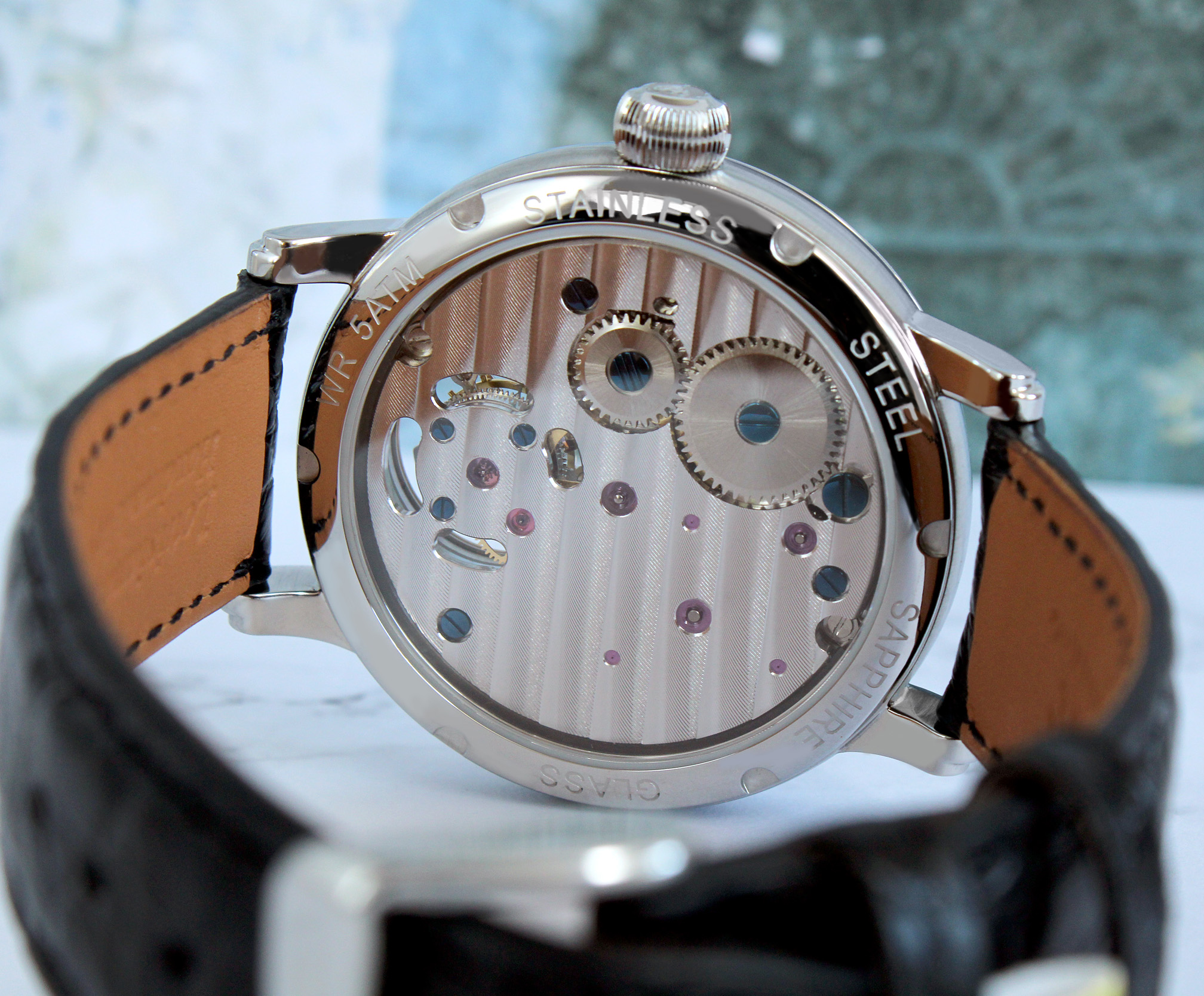 The 3400.PTS movement was chosen as the ideal mechanism, offering essential functions such as hour, minute, and second indications, along with the striking tourbillon cage prominently positioned at 6 o’clock. The seconds are displayed via the innovative “Tourbillon Bridge” by Poljot-International, designed in the shape of an arrow. The movement’s bridges are adorned with Geneva stripes and decorated with blued screws. The movement provides a power reserve of at least 72 hours when fully wound, allowing the watch to be wound only every three days.