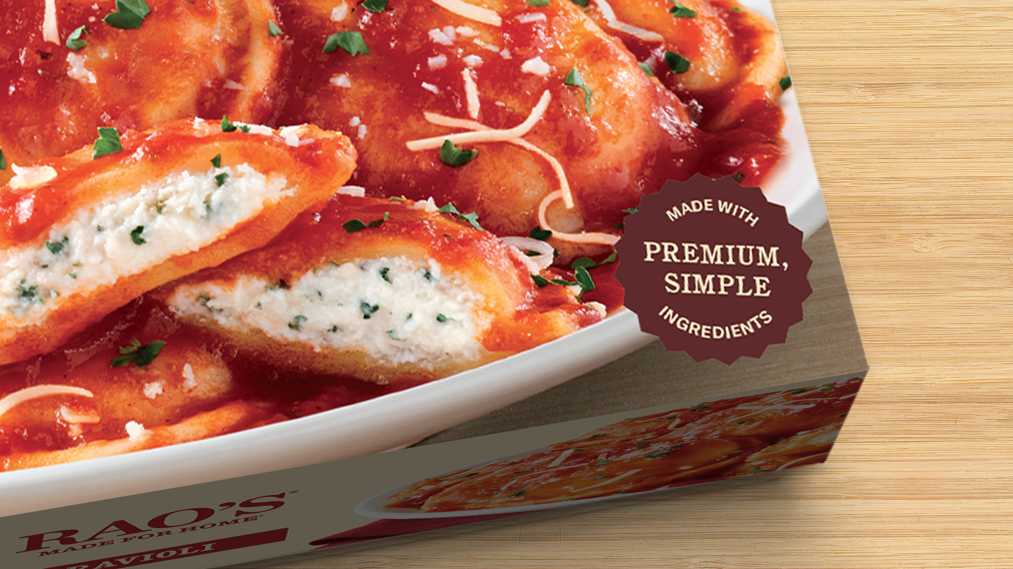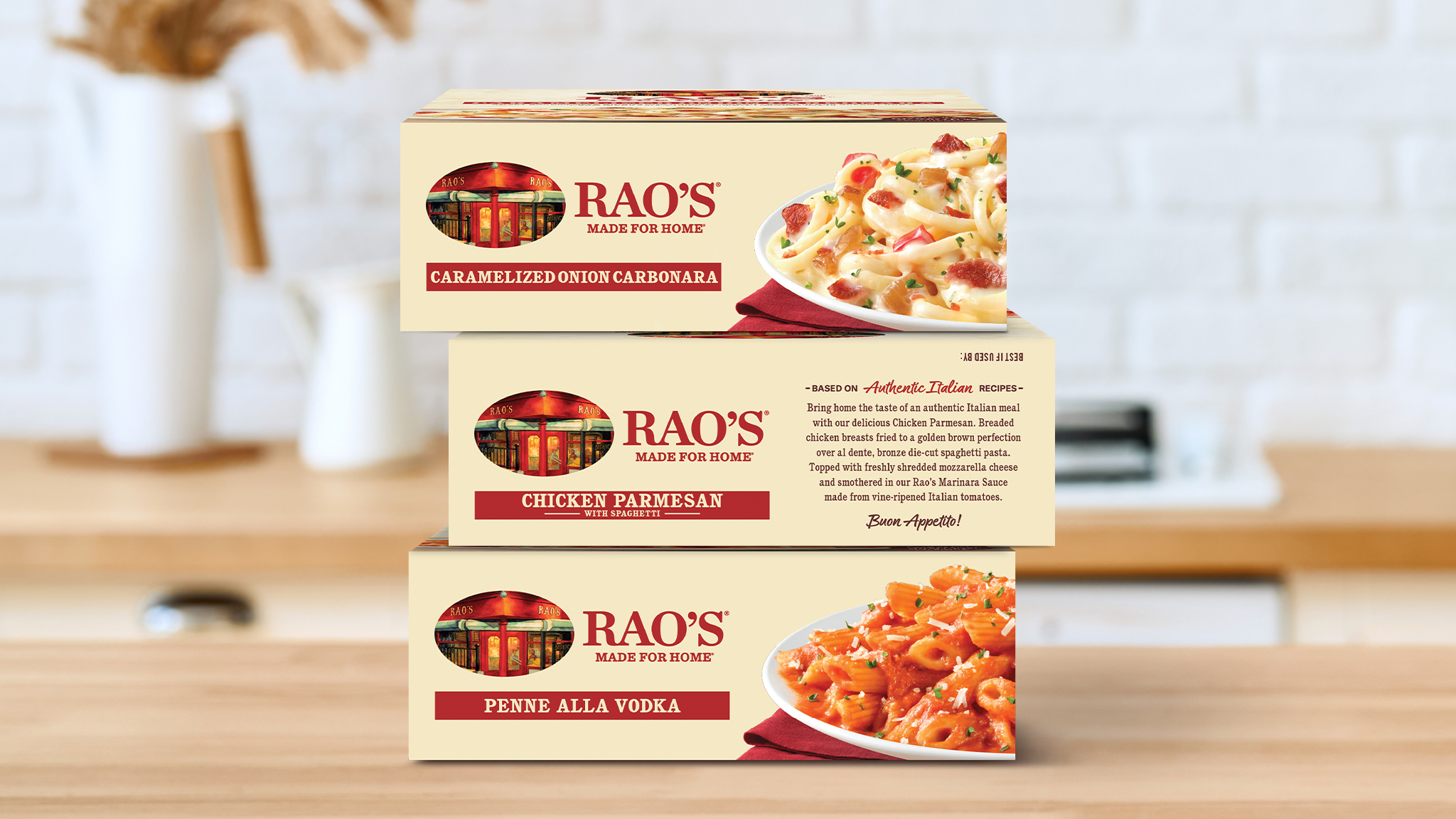 To set the stage for our food photography, we designed a backdrop inspired by the warmth and rustic charm of Tuscany. Rich, kitchen-inspired textures bring authenticity, while Rao’s Made for Home signature cream color reinforces brand recognition and deepens the connection to its Italian-inspired recipes. The background flows seamlessly across the primary display panel, providing a cohesive yet neutral canvas that lets the food and brand elements stand out. The result? A powerful brand-blocking effect that links every box on the shelf, amplifying recognition and commanding attention in the freezer aisle.