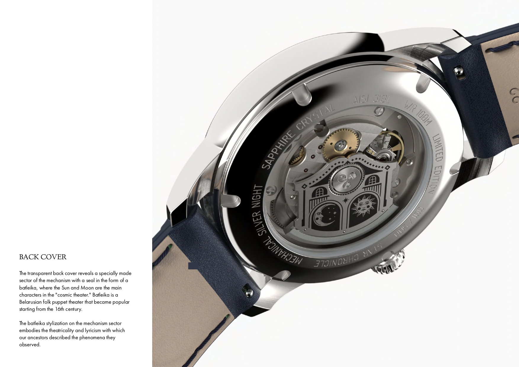 The transparent back cover reveals a specially made sector of the movement with a seal in the form of a batleika, where the Sun and Moon appear as the main characters of the “cosmic theater”. The decoration of the mechanism in the form of a batleika — a medieval puppet theater — personifies the theatricality and lyricism with which the ancestors described the phenomena they observed.