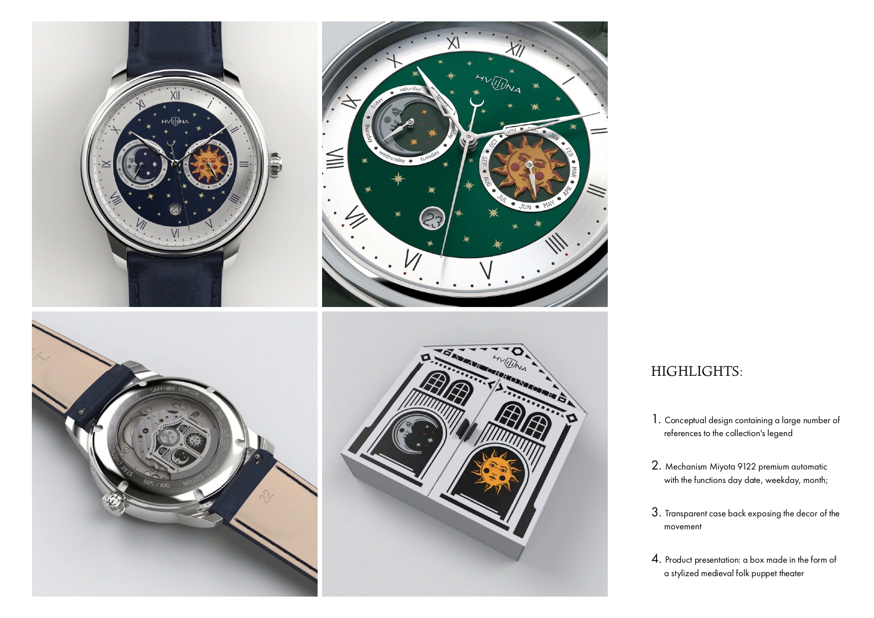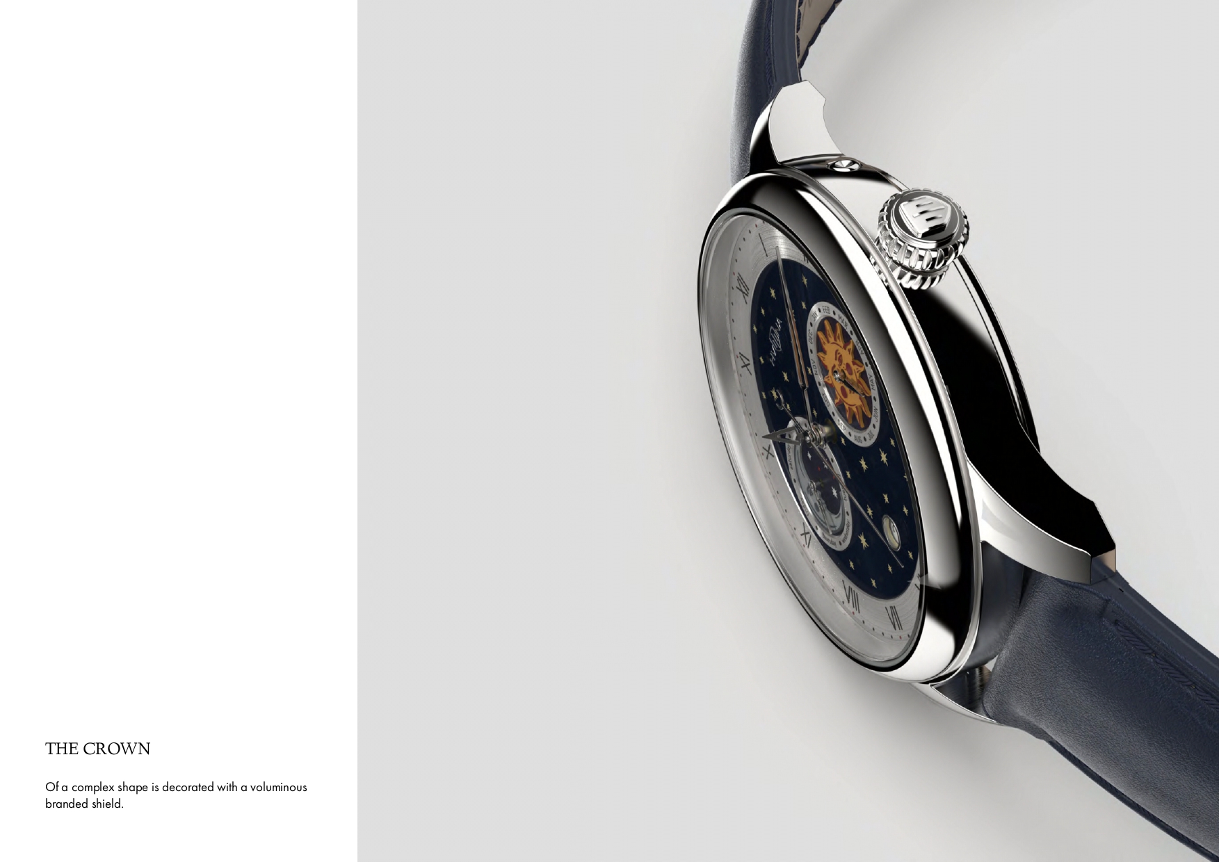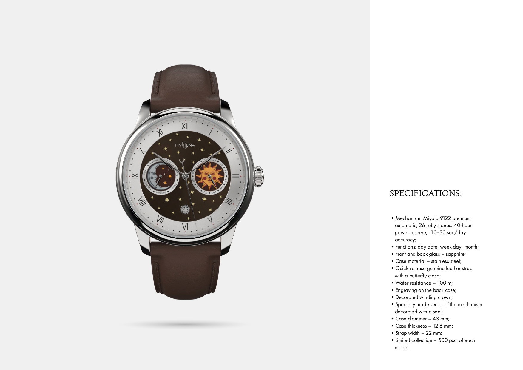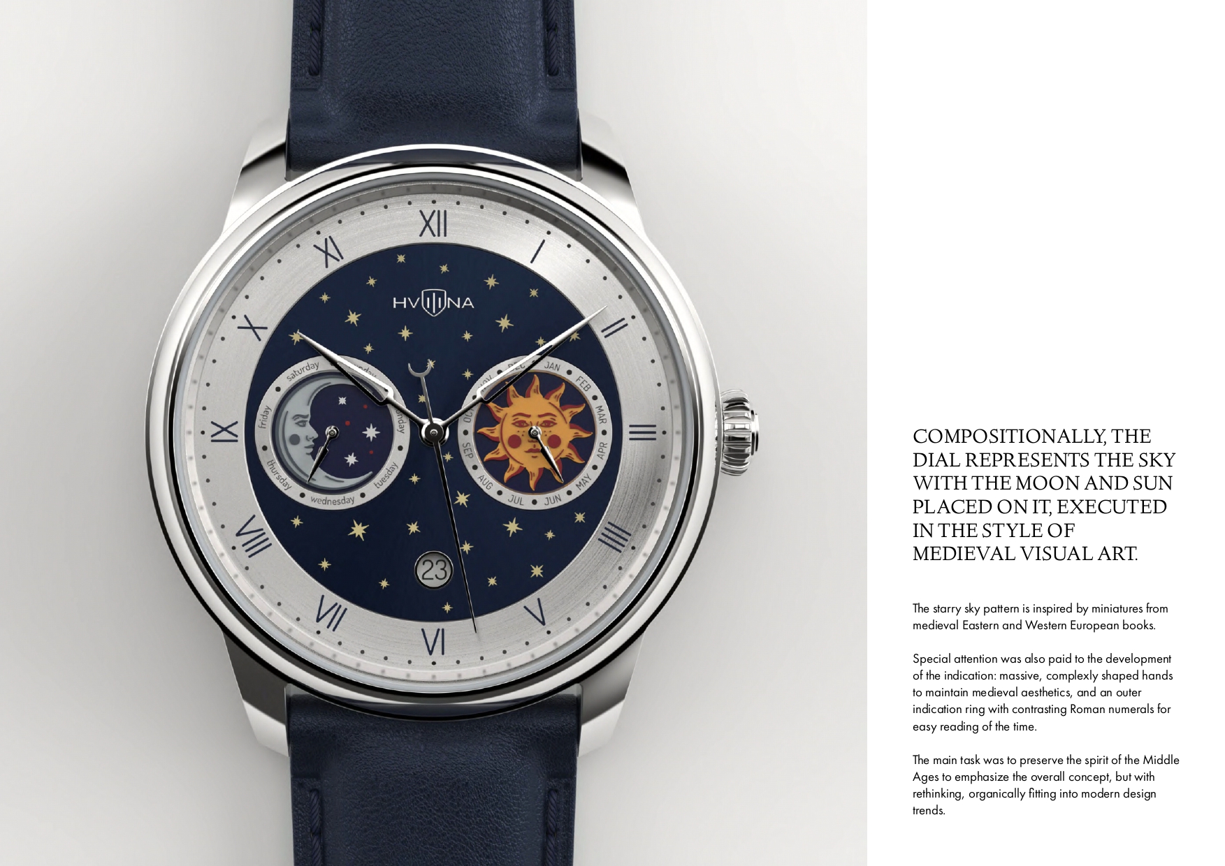 As a visual image of the Moon and Sun on the dial of the watch, a stylisation of the image of the original 16th century coat of arms of Francis Skorina — a figure that has become synonymous with Eastern European bookmaking — was developed.