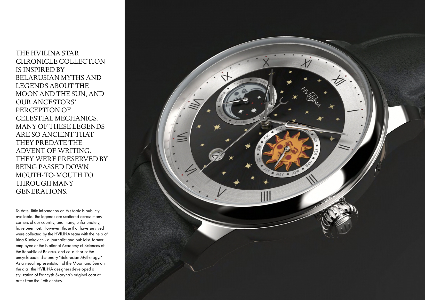 The STAR CHRONICLE MECHANICAL watch is inspired by Belarusian myths and legends about the Sun and the Moon and our ancestors’ perception of celestial mechanics. Some of the legends are so ancient that they began to exist even before the advent of writing. They were preserved by being passed down mouth-to-mouth to through many generations.