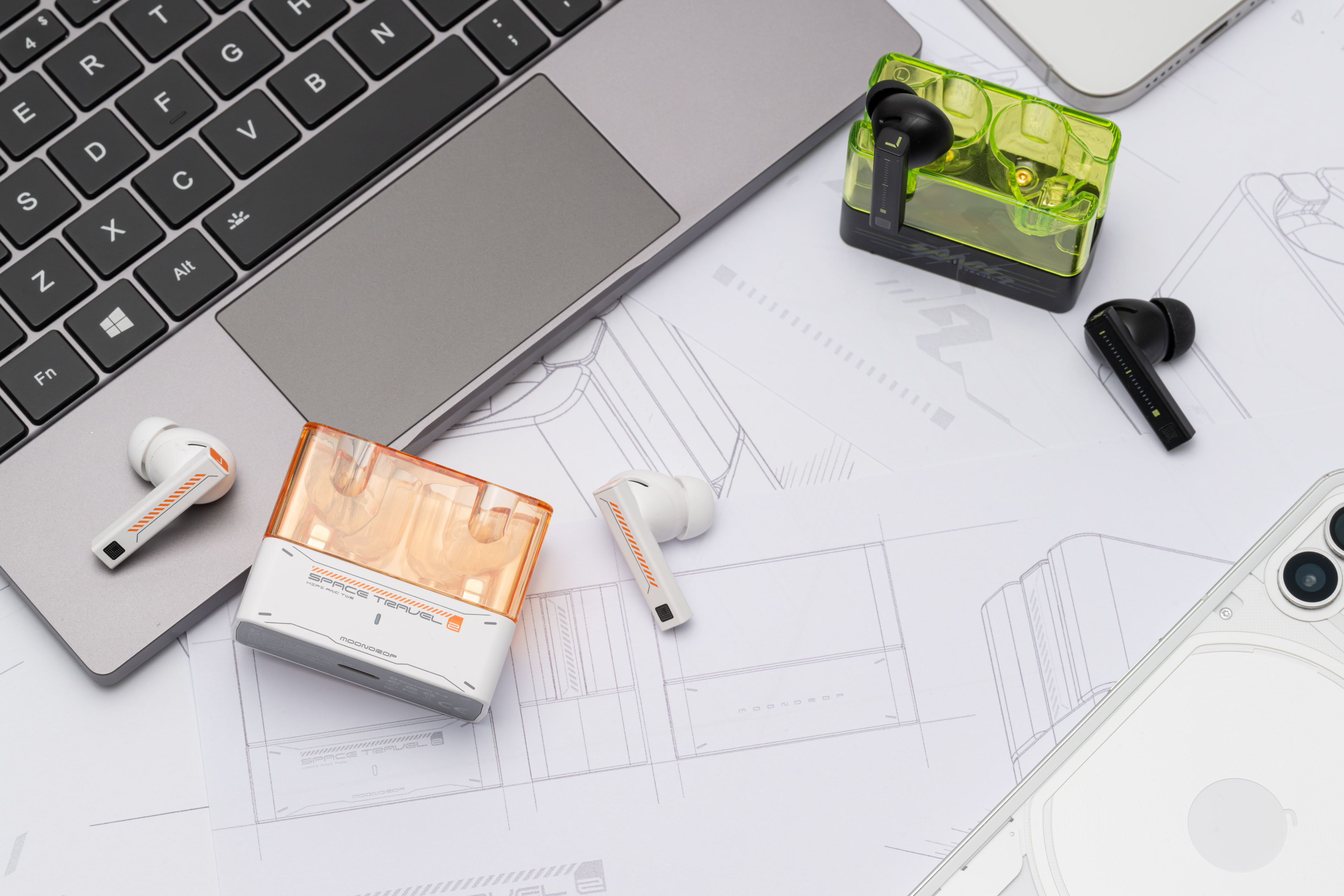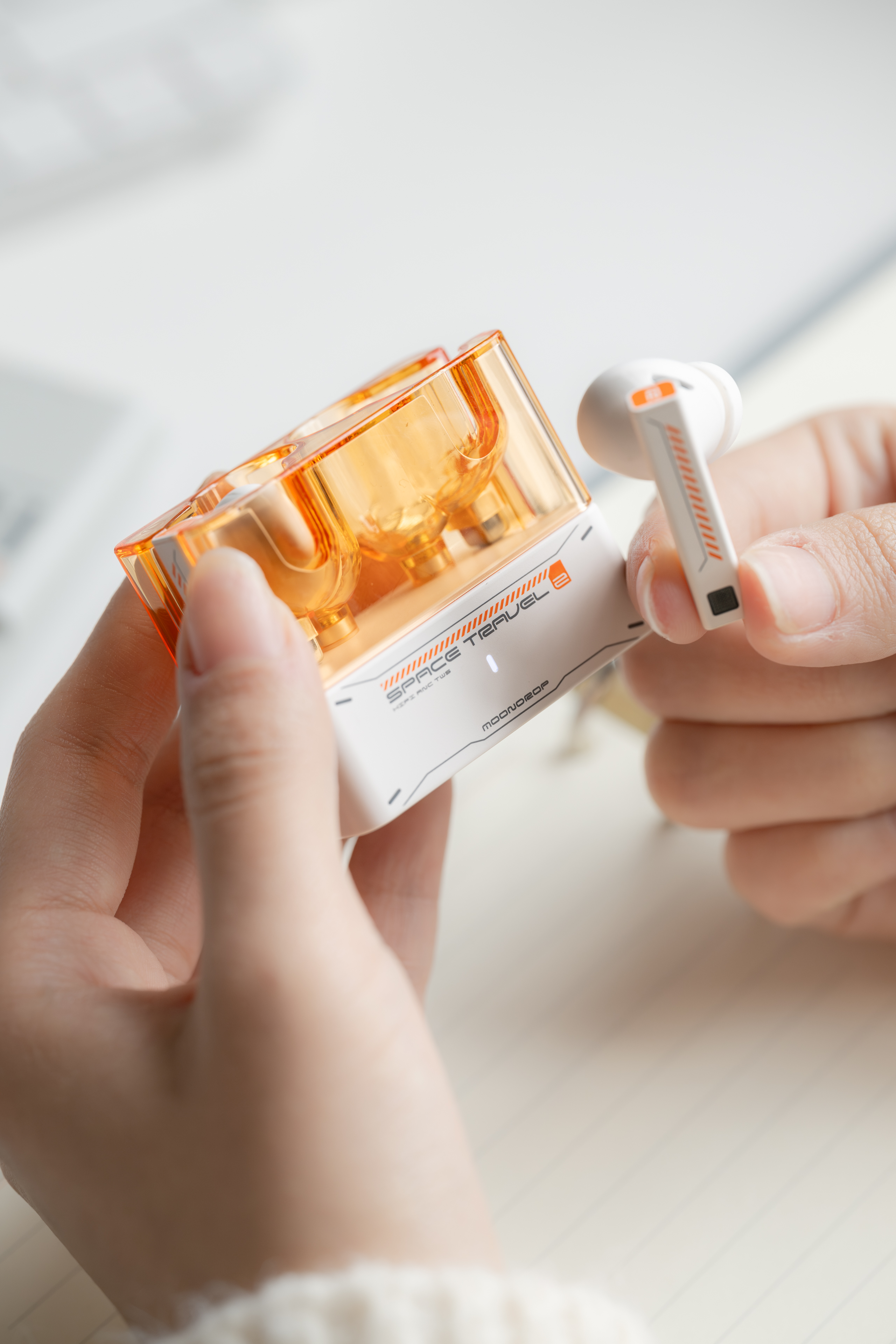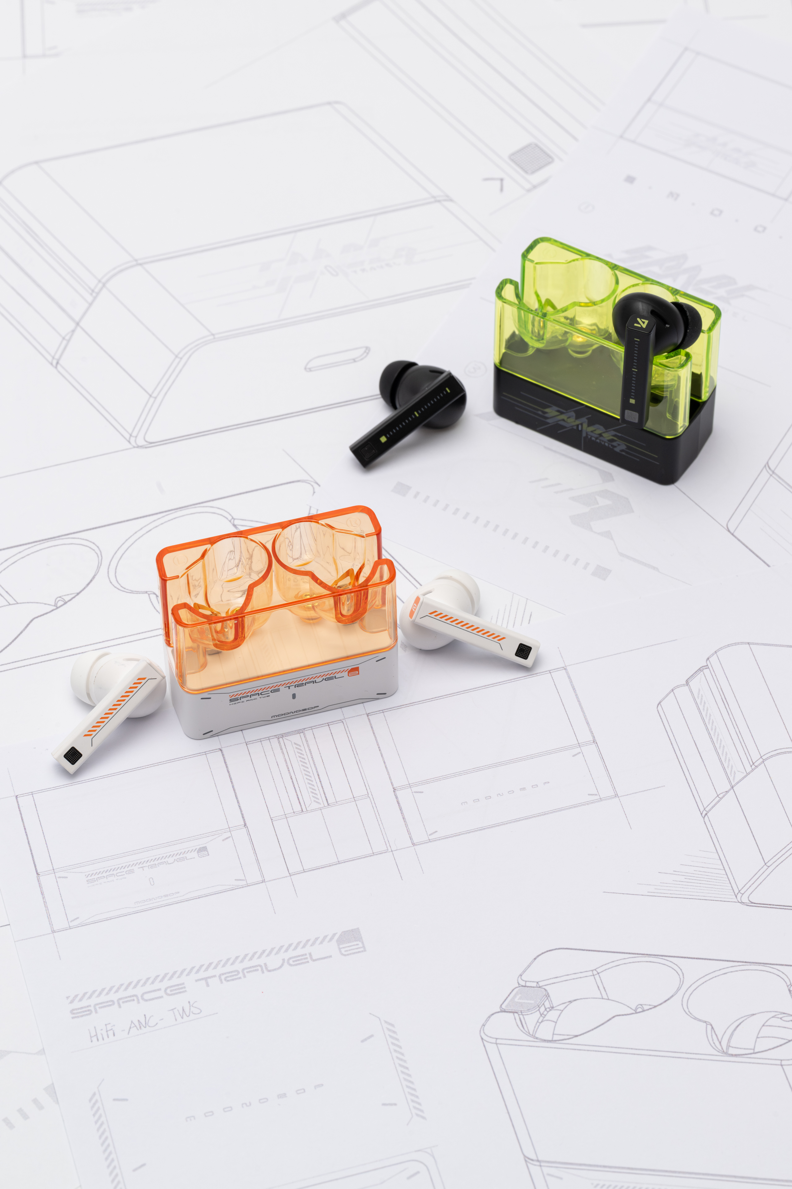 The Space Travel2 ANC TWS is inspired from the geometric shapes, transparent cockpits, and sleek lines characteristic of classic sci-fi films, leaving a distinctly retro-futuristic impression. Throughout the design phase, the designers aim to revive the concept of future headphone product as envisioned in historical literature, rather than merely focusing on a superficial futuristic appearance. The designer intends to reimagine past interpretations of high-tech everyday objects by reflecting on earlier visions of the future. This approach emphasizes the importance of harmonizing advanced technology with the practicality required for daily use, which is evident in the overall design.