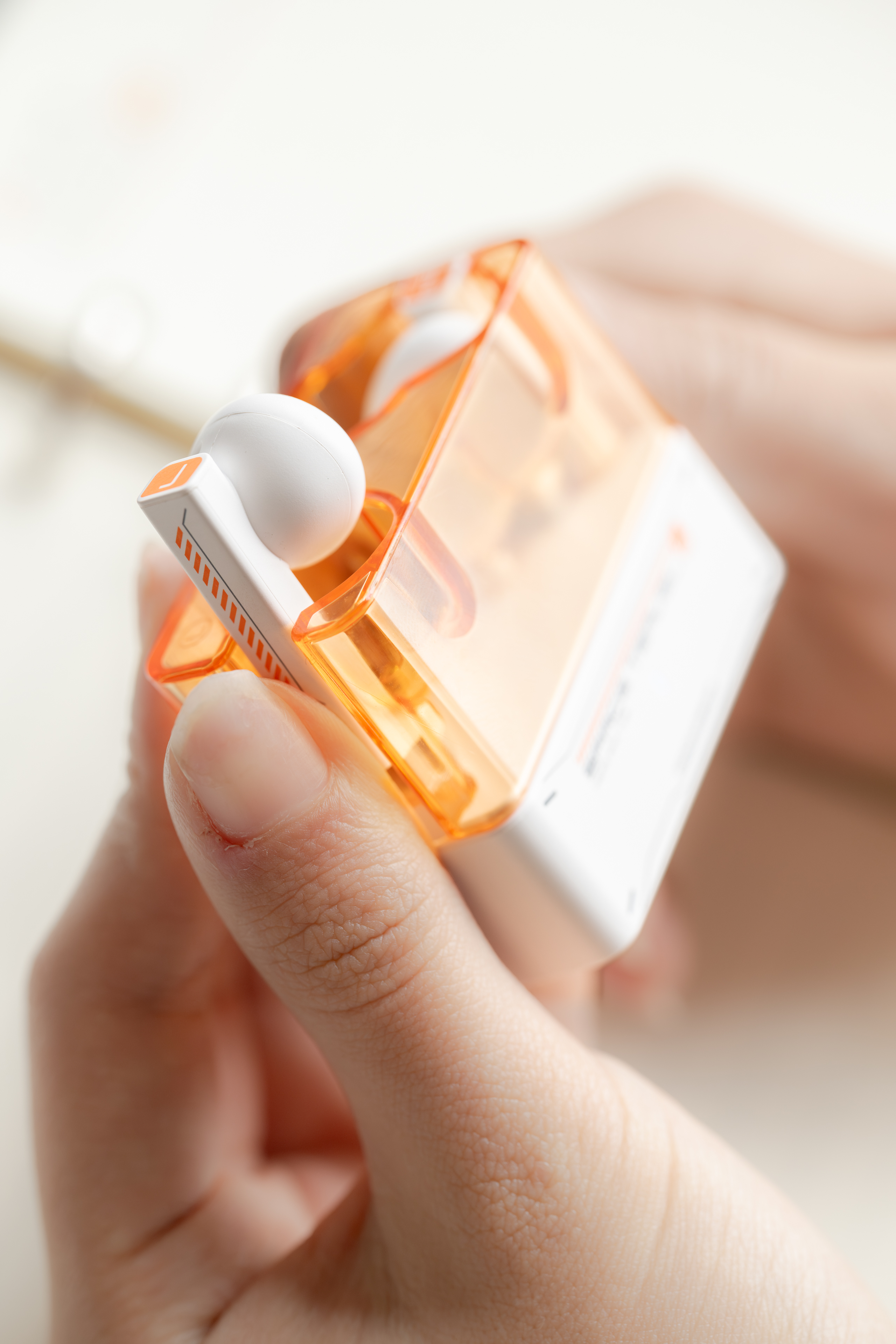 A non-slip raised hook is integrated at the end of the handle which facilitates the retrieval of the headphone from the charging compartment. Indicator lights shaped like end strips display the status of the charging compartment in various colors. Each edge comes with subtly rounded corners, enhancing tactile comfort and maintaining geometric consistency.