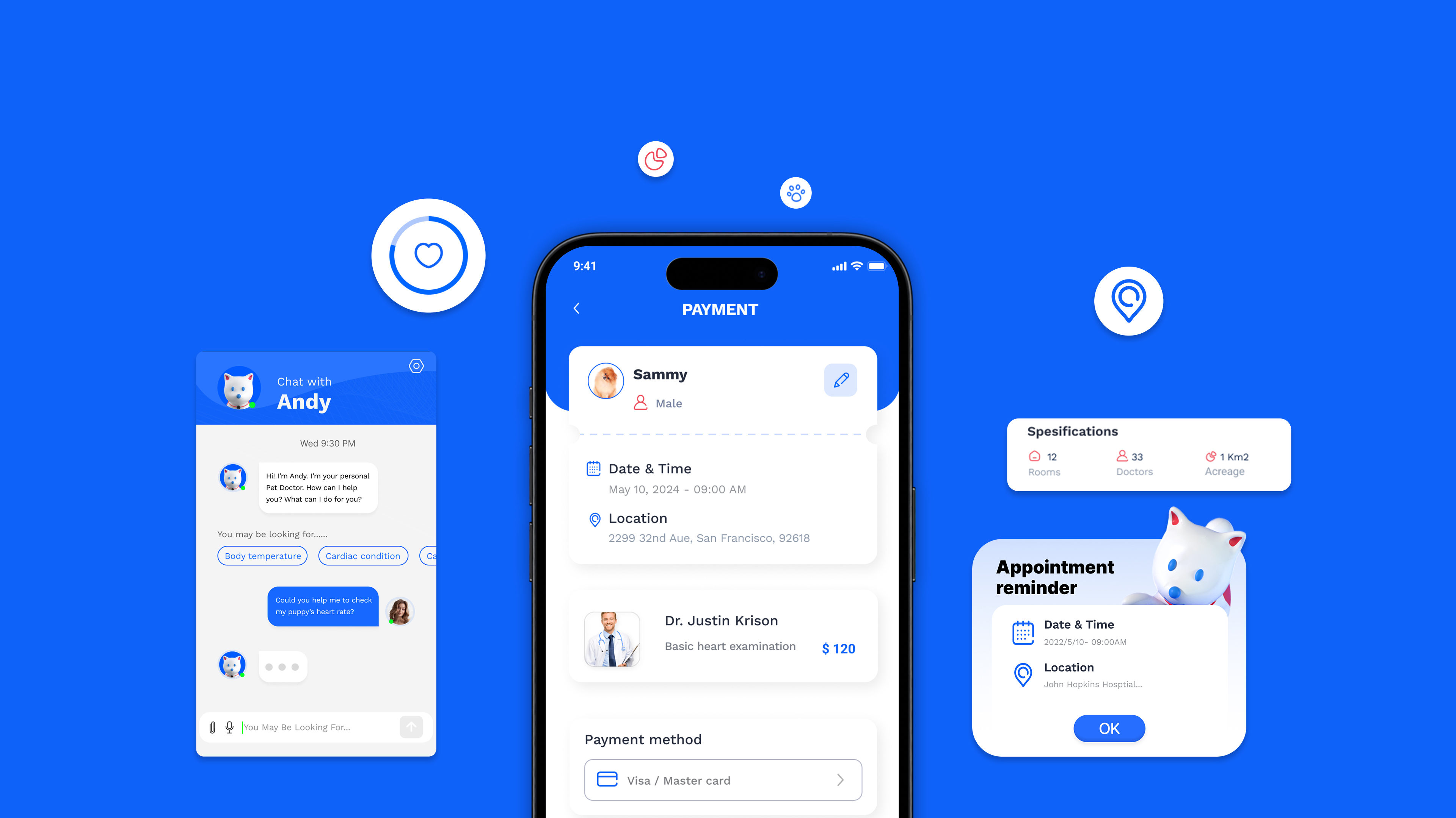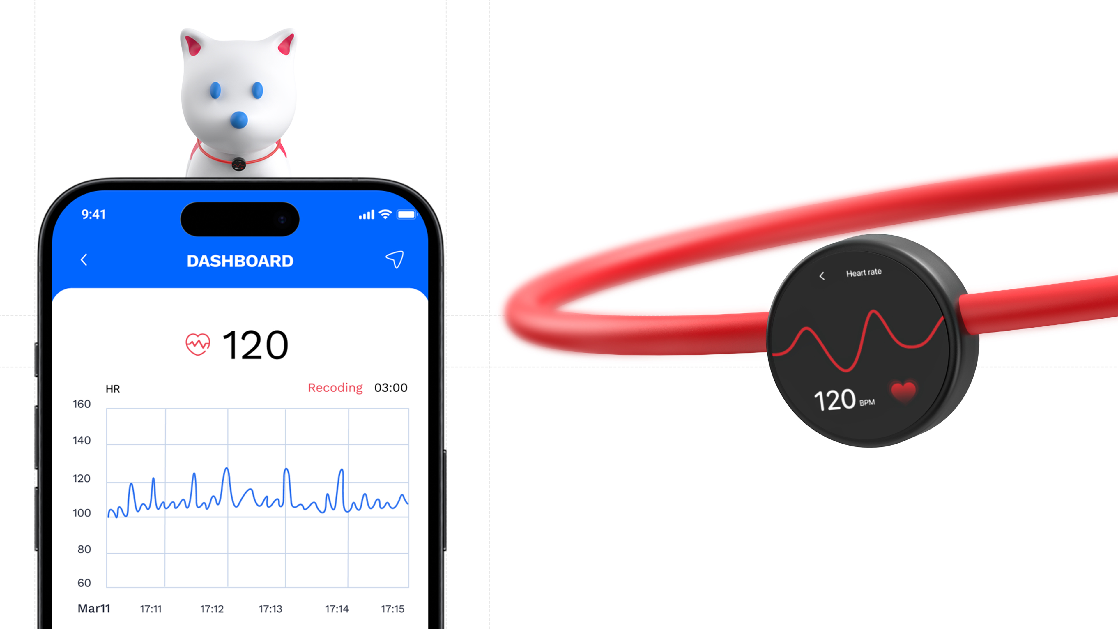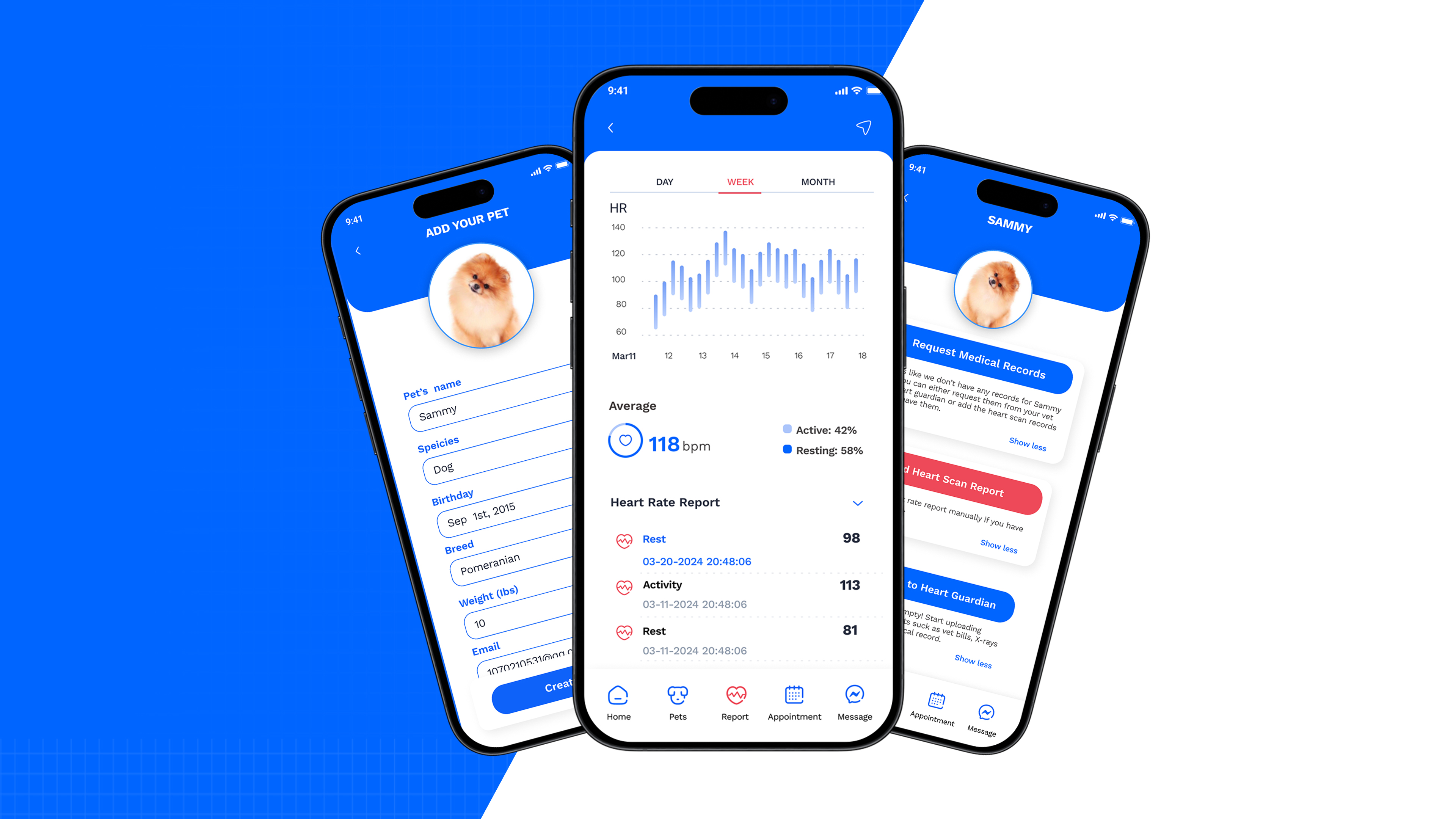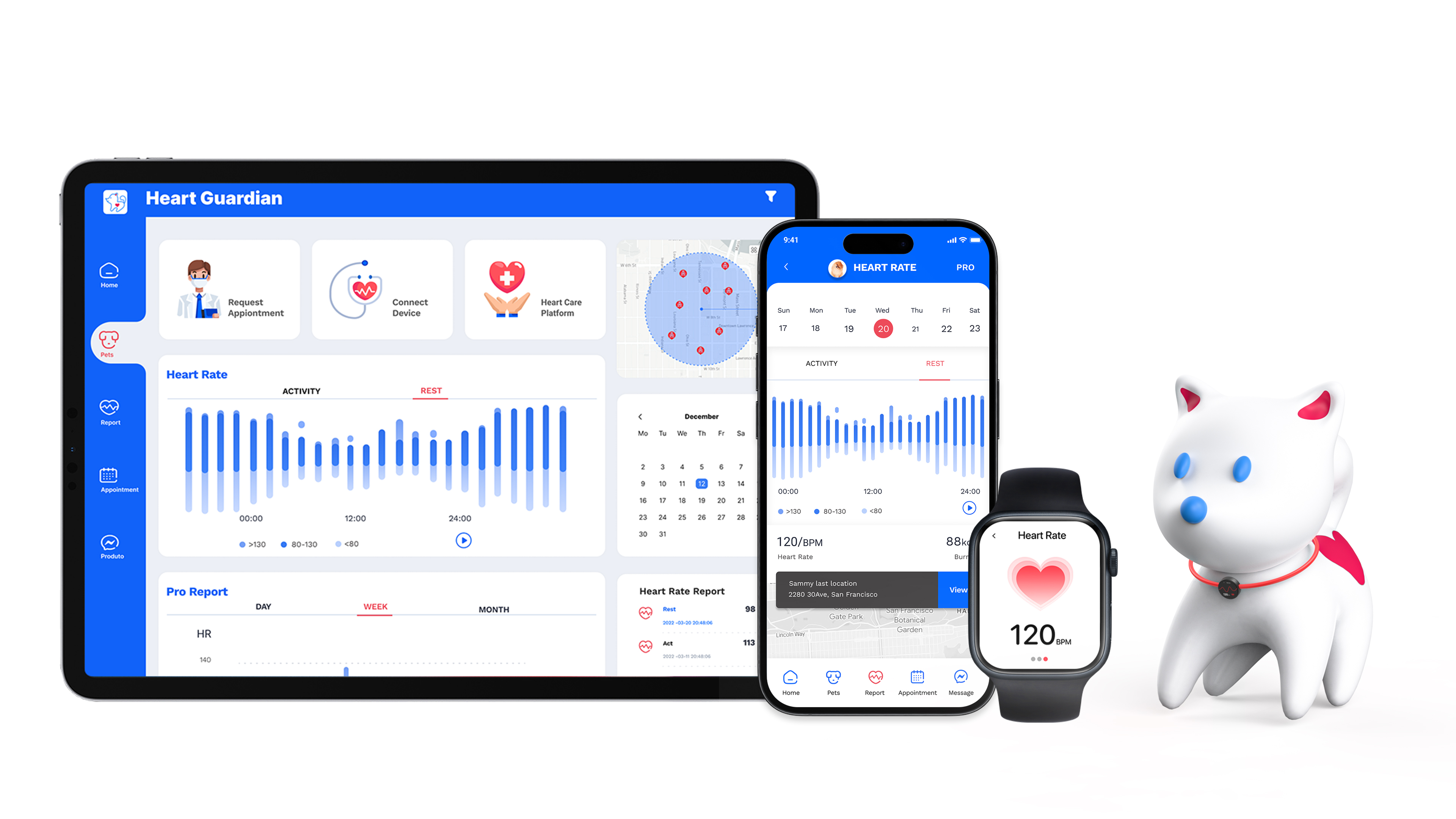 According to research, the incidence of acquired heart disease in pets increases with age, gradually rising from 10%. This led to the development of Heart Guardian – a heart tracking app designed specifically for pets. Compatible with collar-like smart wear, Heart Guardian ensures pet owners can always detect the pet's heart health status. With a highly intelligent and reliable design, Heart Guardian integrates innovative functions such as real-time monitoring, health records, AI data analysis, and links to doctor. The comprehensive attention provides scientific and reassuring care for pets while meeting the deep emotional bond between modern people and pets, establishing a new standard for pet health management.