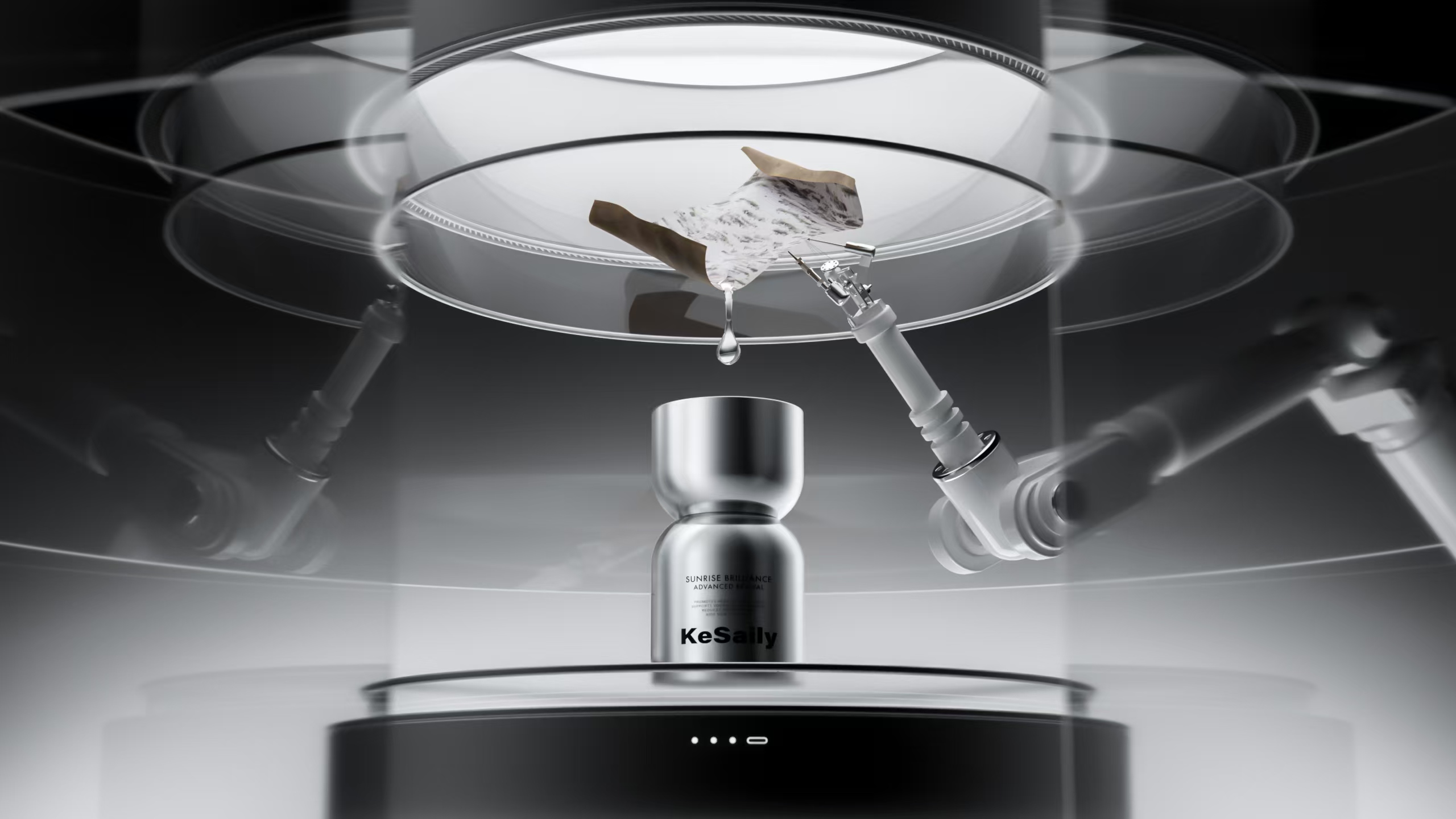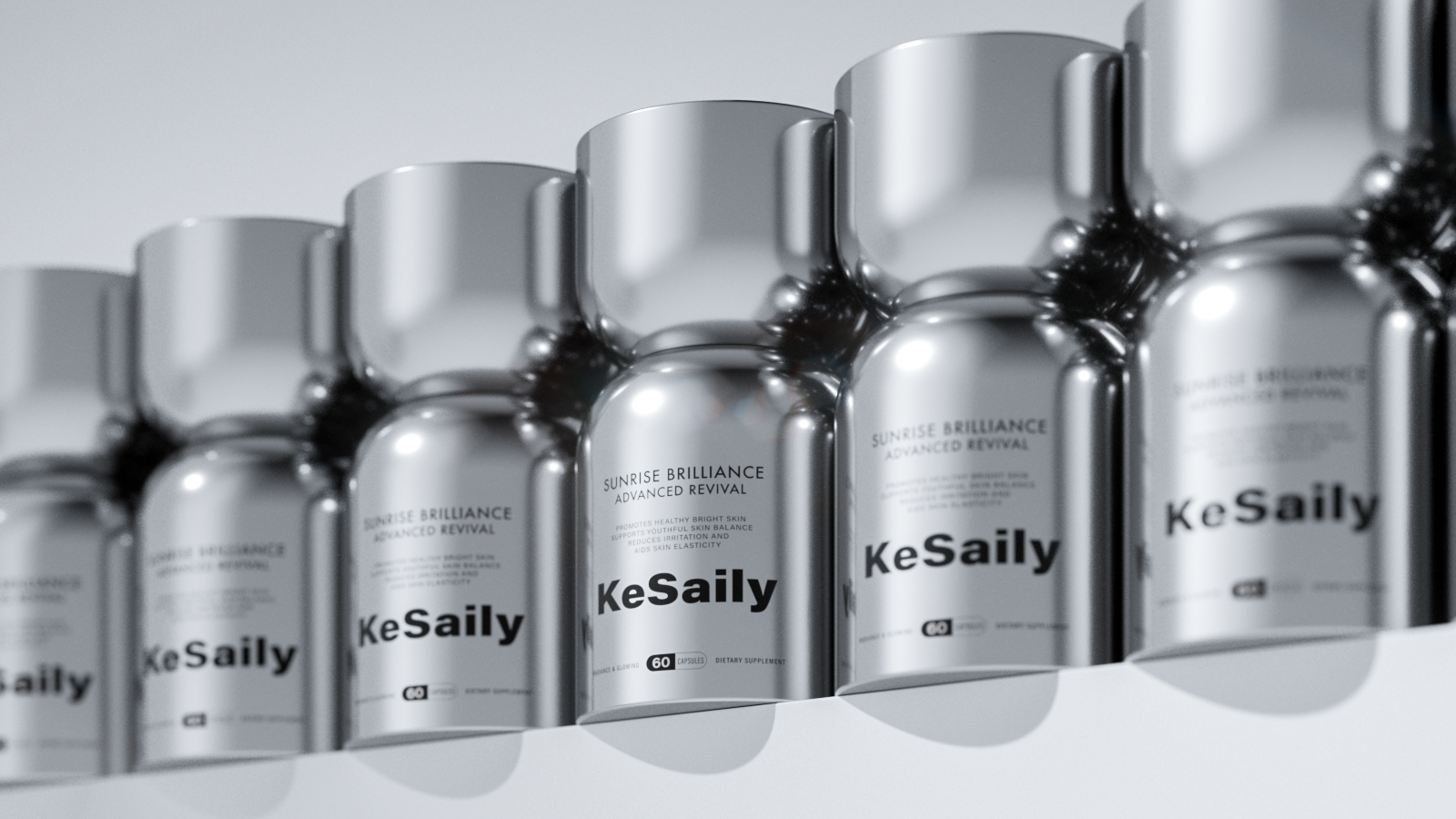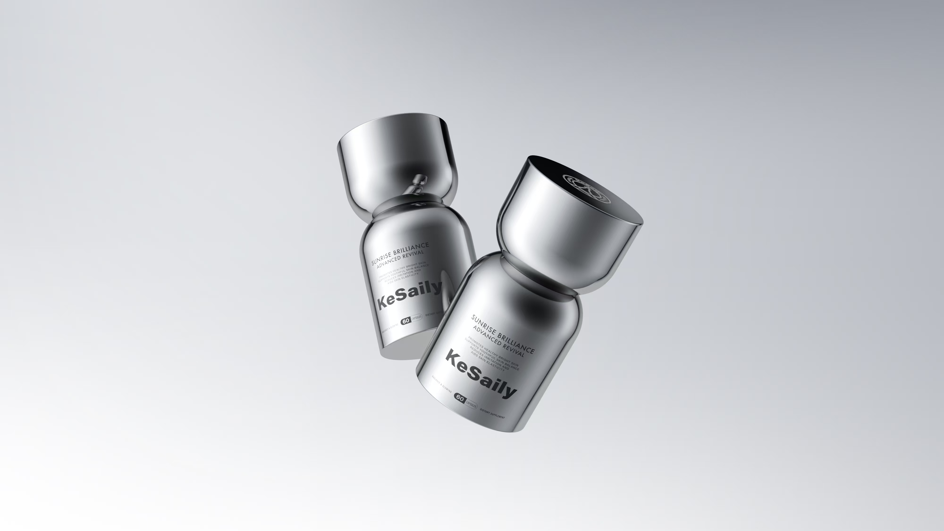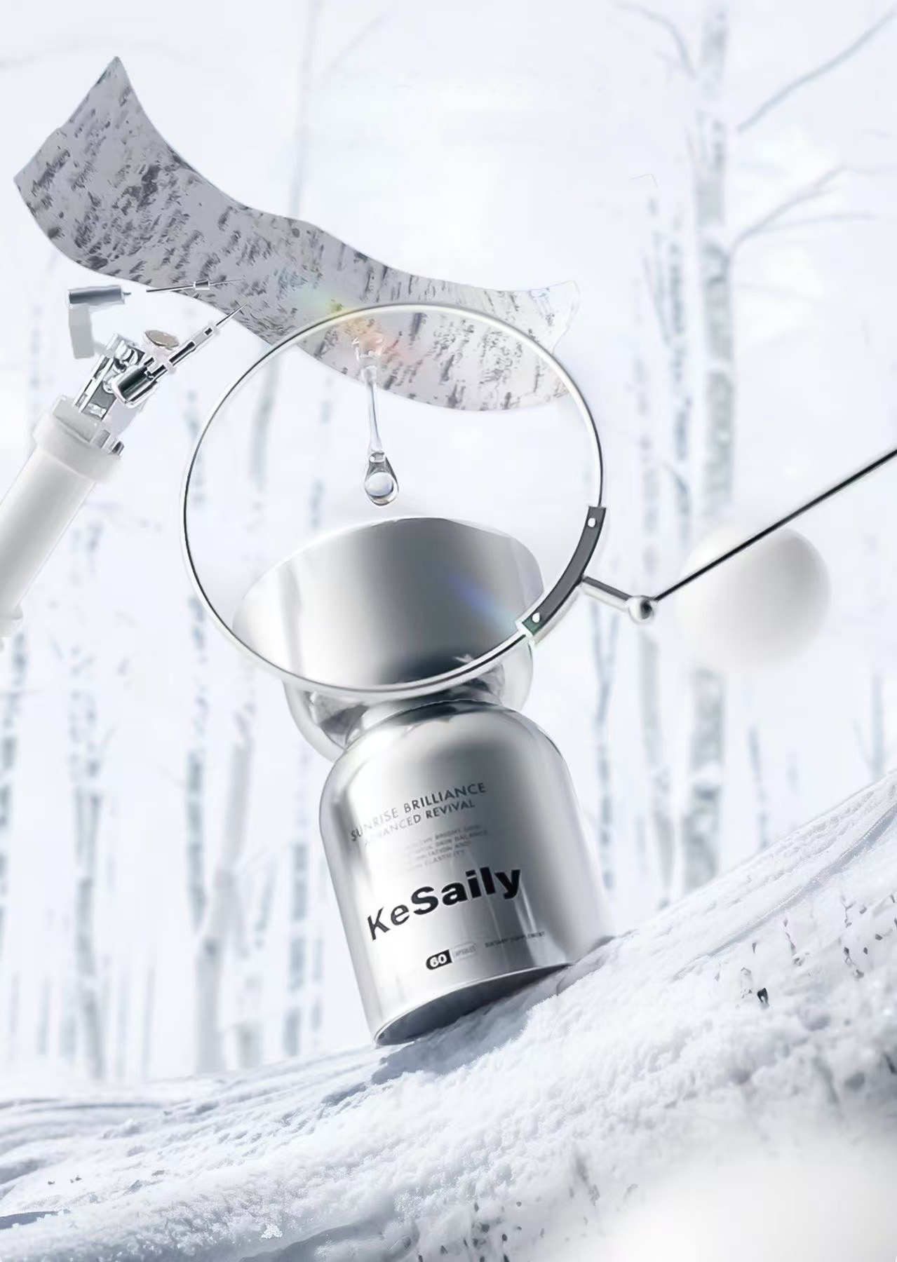 KeSaily presents a bottle design characterized by an hourglass form, implying the battle against the passage of time. The exterior of the bottle is enhanced with a silver electroplated glossy finish. This treatment allows the majority of light to be reflected rather than absorbed when it strikes the surface. Additionally, the lustrous finish serves as a metaphor for protection against external light damage, establishing a profound association between the design and the product's inherent sunlight resistance attributes, both visually and conceptually.