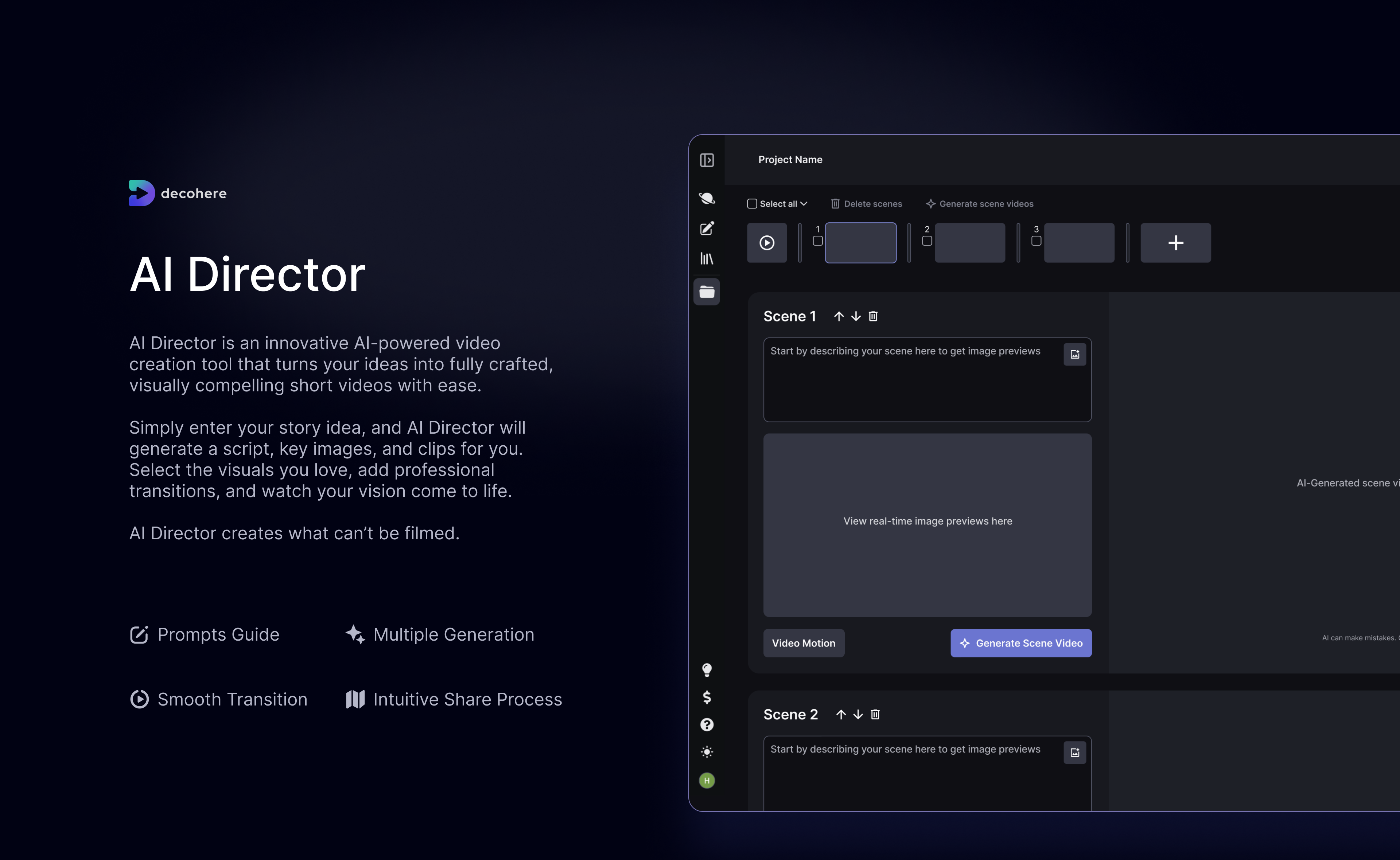 A key design innovation was the AI Script Assistant which enhances the experience by offering contextual guidance on prompt refinement, helping users craft more effective inputs for scene generation. By integrating smart suggestions and real-time feedback, this tool empowers creators to achieve higher-quality outputs with minimal trial and error.