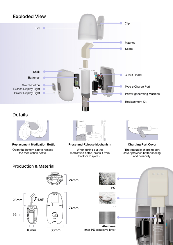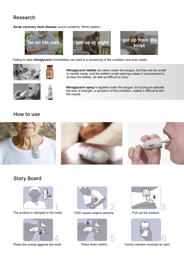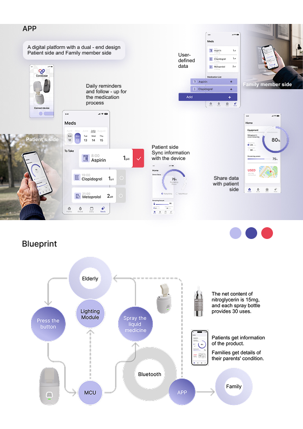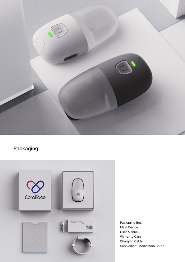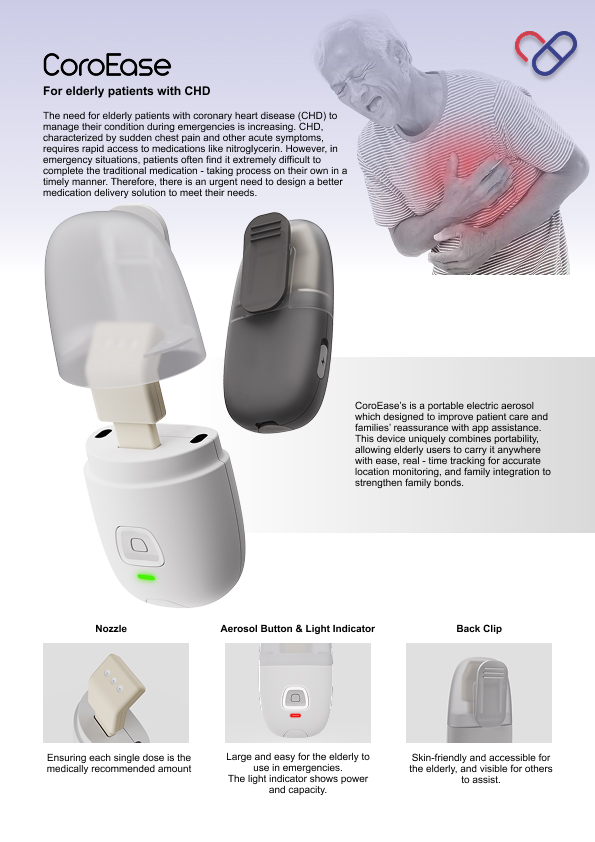 CoroEase is an innovative, portable nitroglycerin electronic spray designed for elderly coronary heart disease patients. Combining traditional medication with modern technology, it features a user-friendly design for easy localization with a positioning nozzle and precise dosing with a single press. The device syncs usage data to a dedicated mobile app, allowing patients to track their treatment progress and share the data with their families. This data-driven approach enhances communication and ensures better patient support.