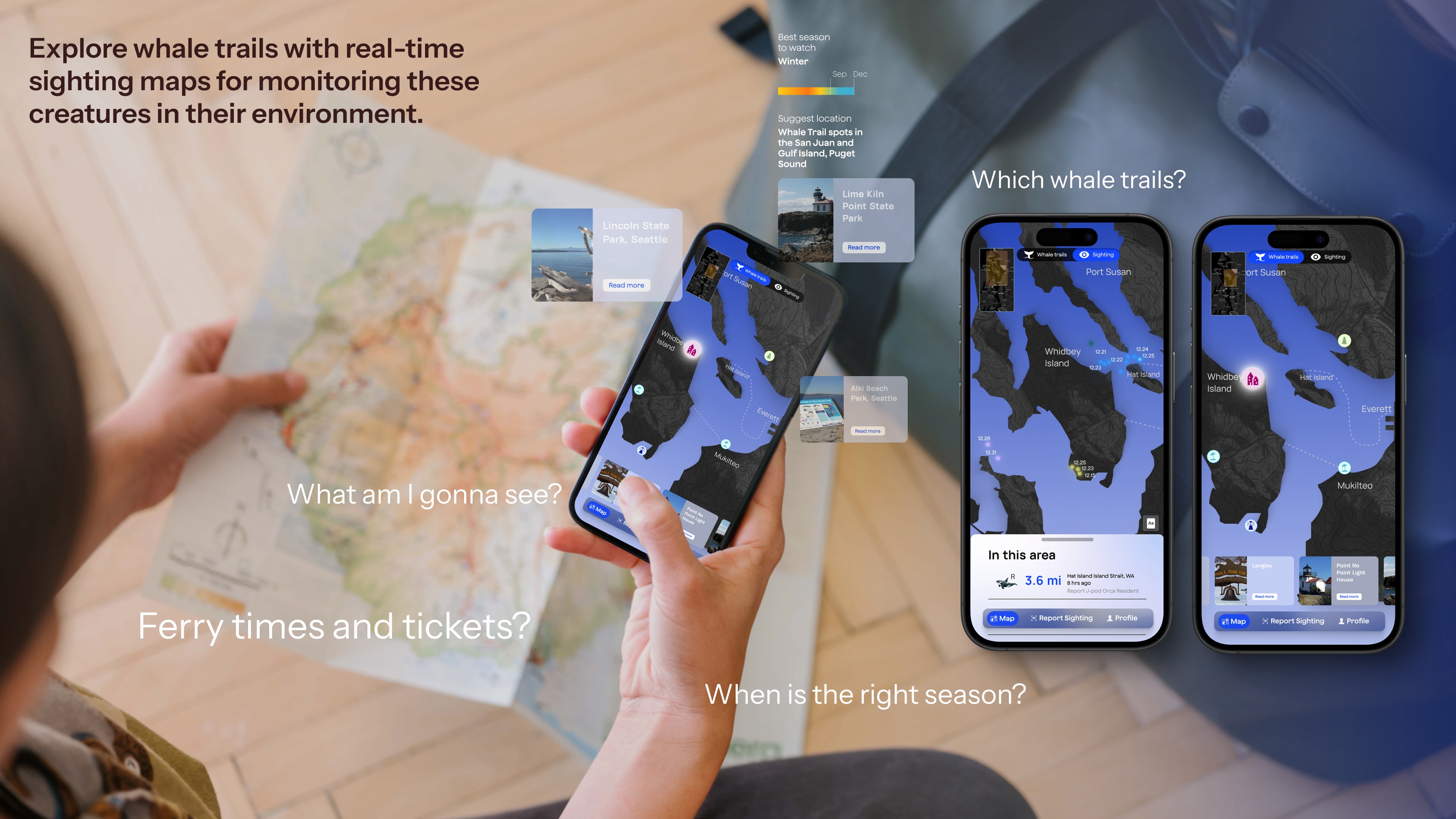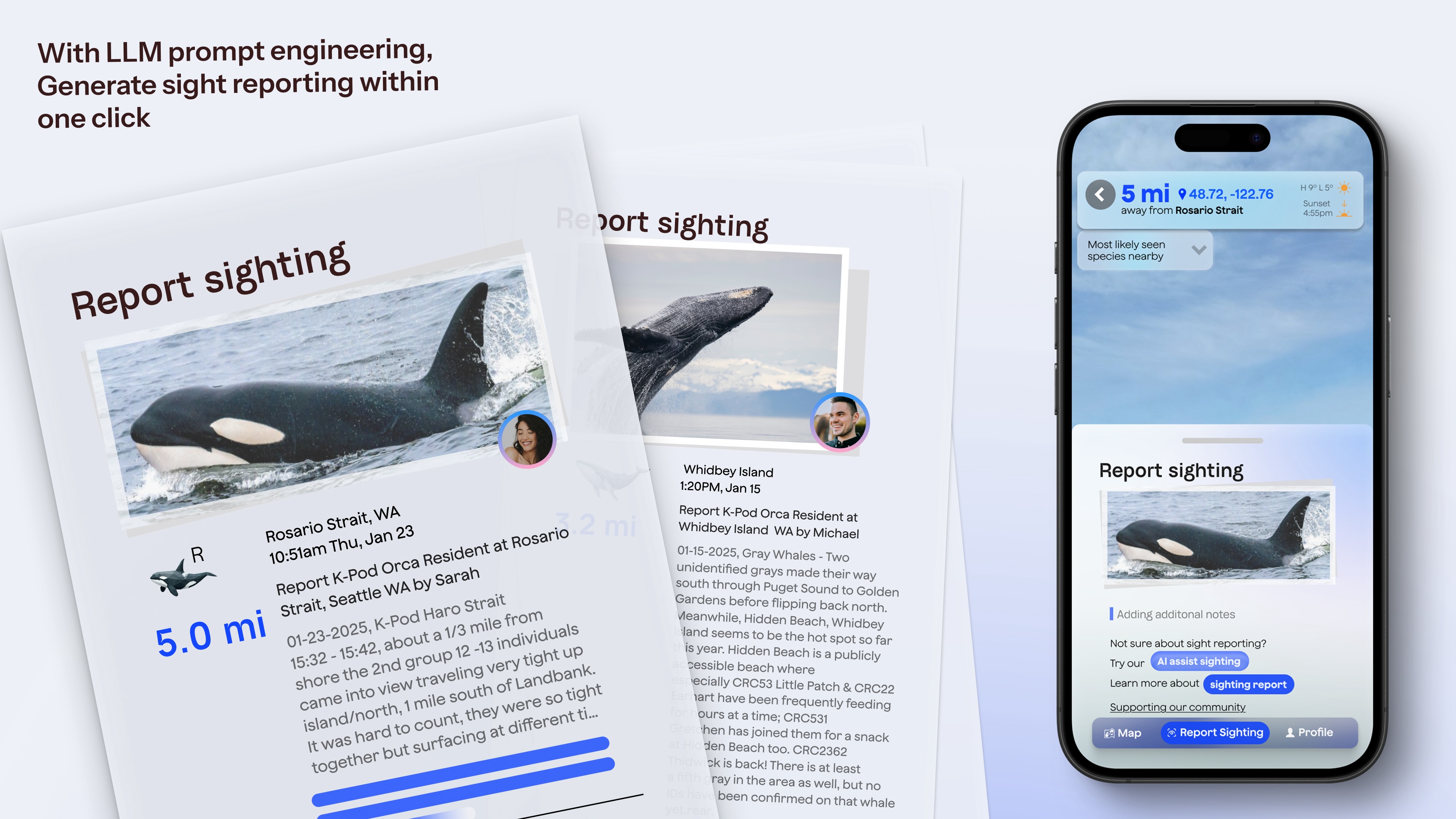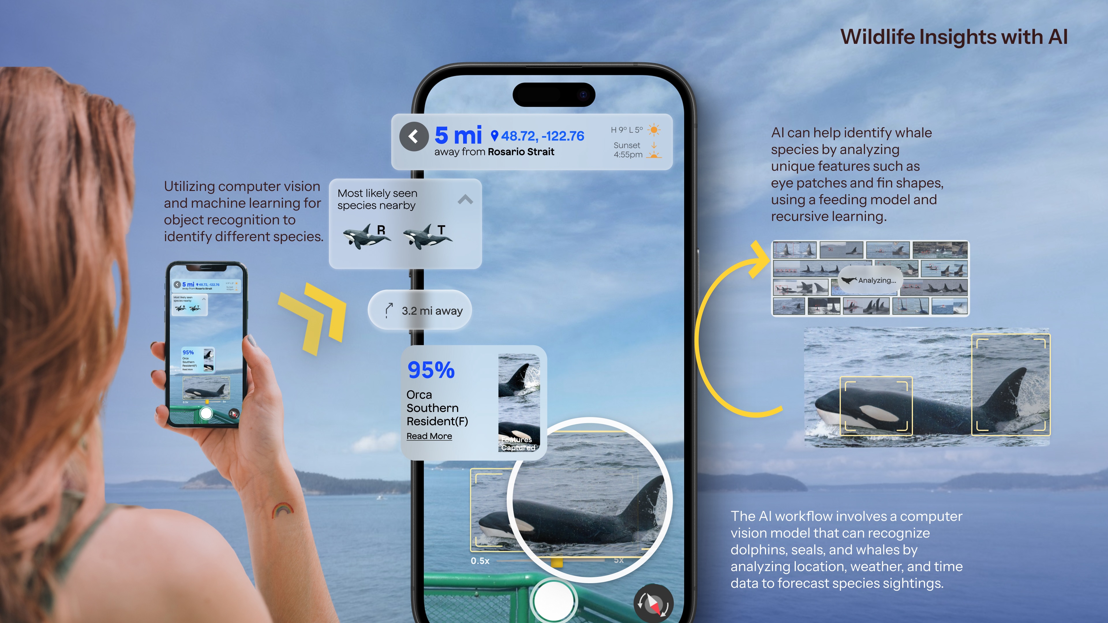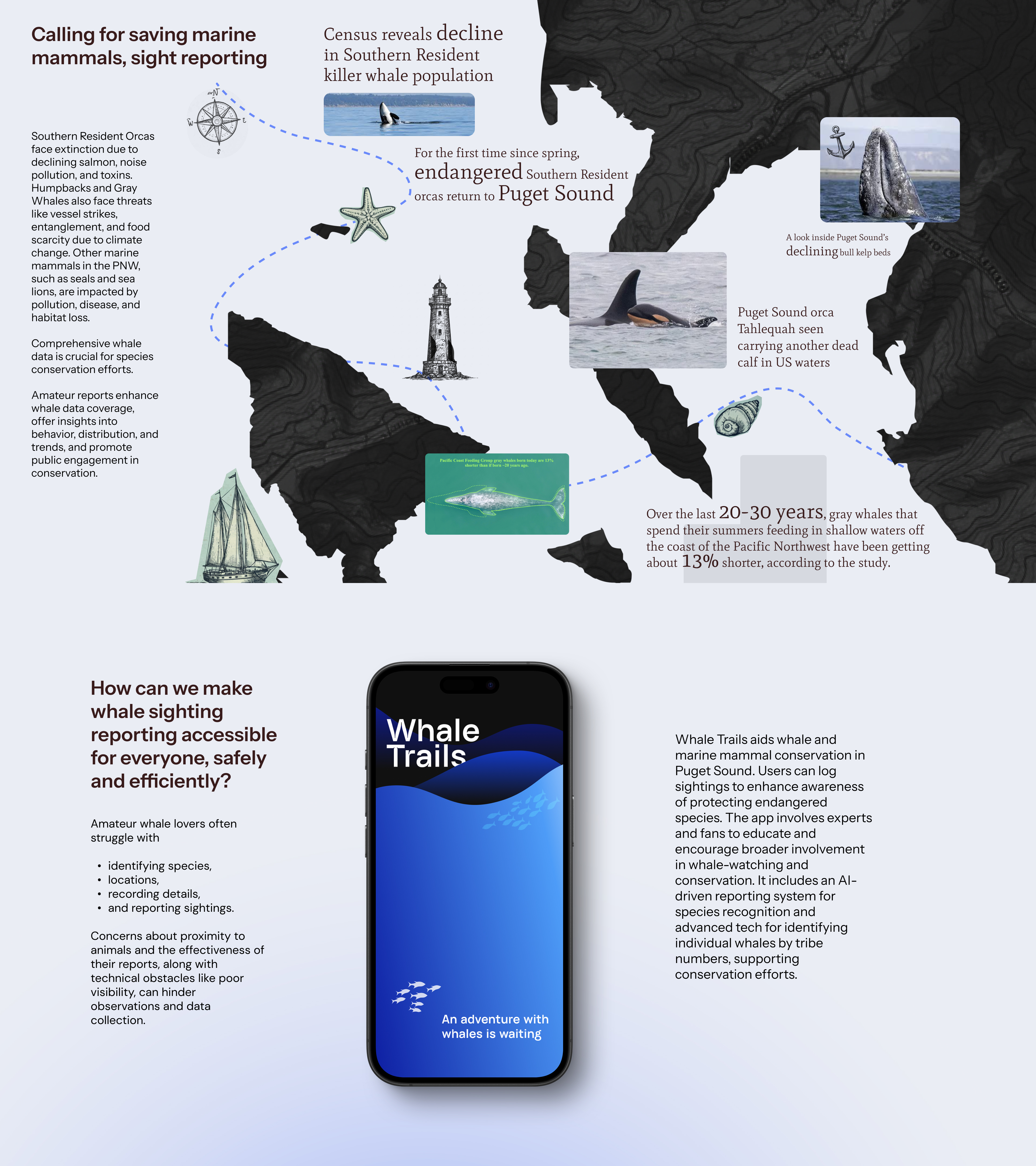 Whale Trails is an innovative application designed to support whale and sea mammal conservation efforts around the Puget Sound area. This platform empowers users to report sightings of whales and other marine giants, fostering greater awareness about the importance of protecting endangered species. By engaging both experts and enthusiasts, Whale Trails aims to educate and encourage more people to participate in whale-watching events and conservation activities. Equipped with an AI-enhanced reporting tool, the app can automatically recognize species, gender, and age from user-submitted images. Additionally, thanks to its high-resolution image analysis capabilities, Whale Trails can even identify specific whales by their tribe number, contributing valuable data to researchers and supporting long-term preservation efforts.
