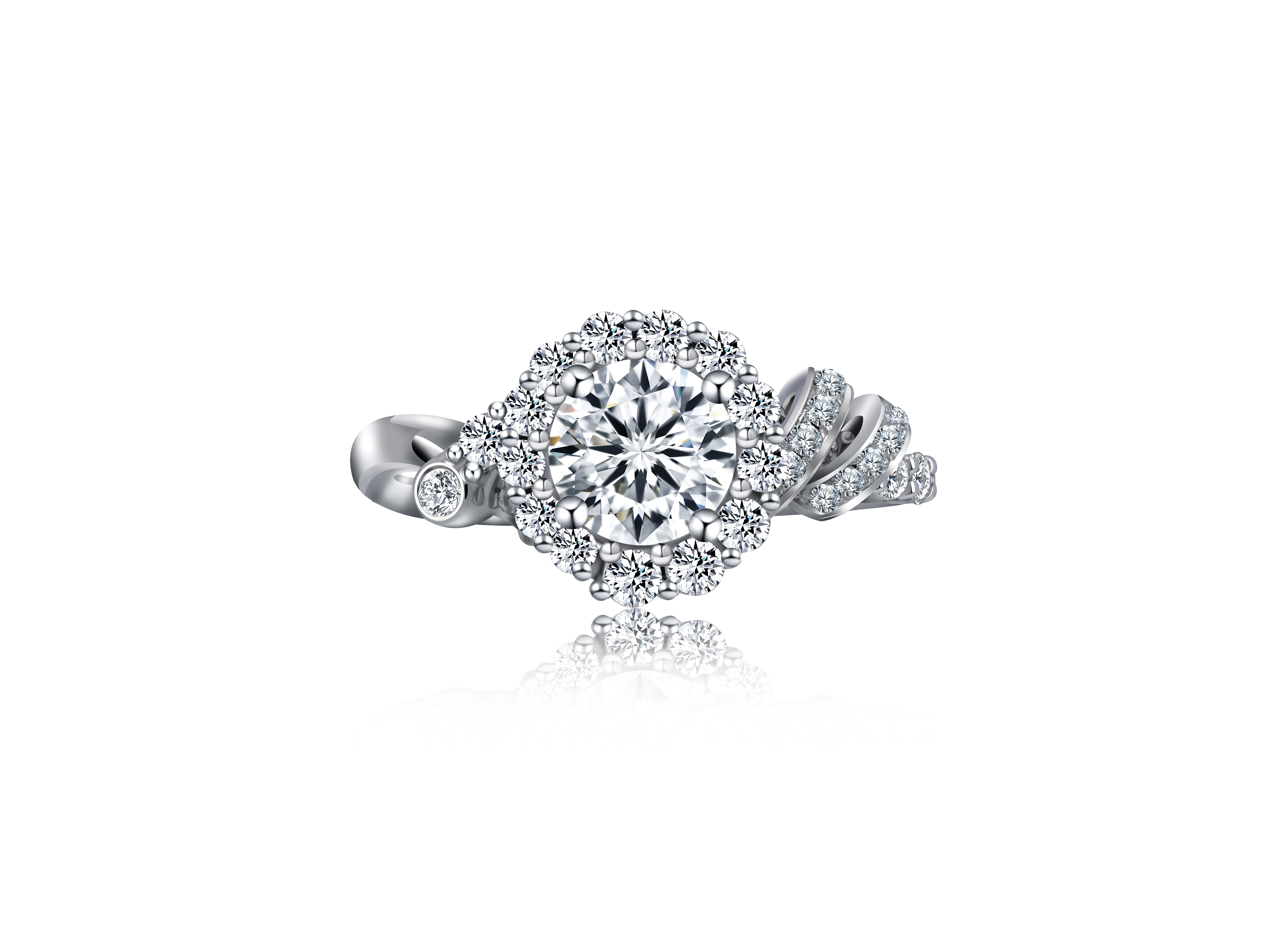 The diamond ring employs the innovative 3D pave setting technique, enabling the center stone and side stones to complement each other for dynamic light reflection. The mortise and tenon joints for physical connection of modules result in a seamless surface to not only ensure structural strength and aesthetic appeal but also effectively avoid metal fatigue associated with traditional welding technology, showcasing a perfect blend of technology and art. In terms of material selection, the product utilizes natural diamonds and 18K gold. The former is crystal clear while the latter presents a cool tone, which creates a sharp contrast to enhance visual impact. To further improve aesthetic appeal, the micro pave setting technique is applied to the side stones set in the shoulder, with the spacing between adjacent diamonds not more than 0.7mm, achieving a highly dense arrangement for visual continuity.