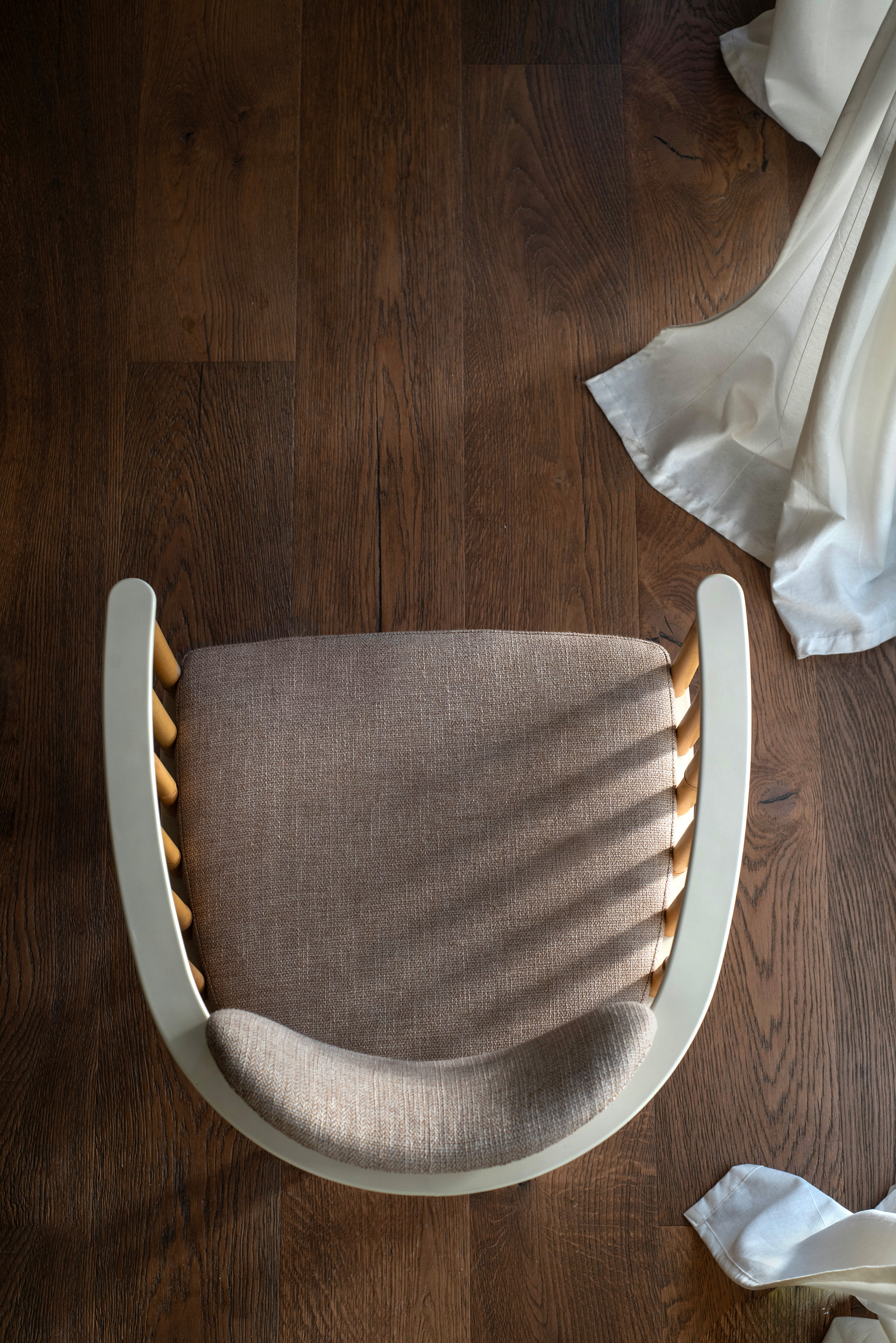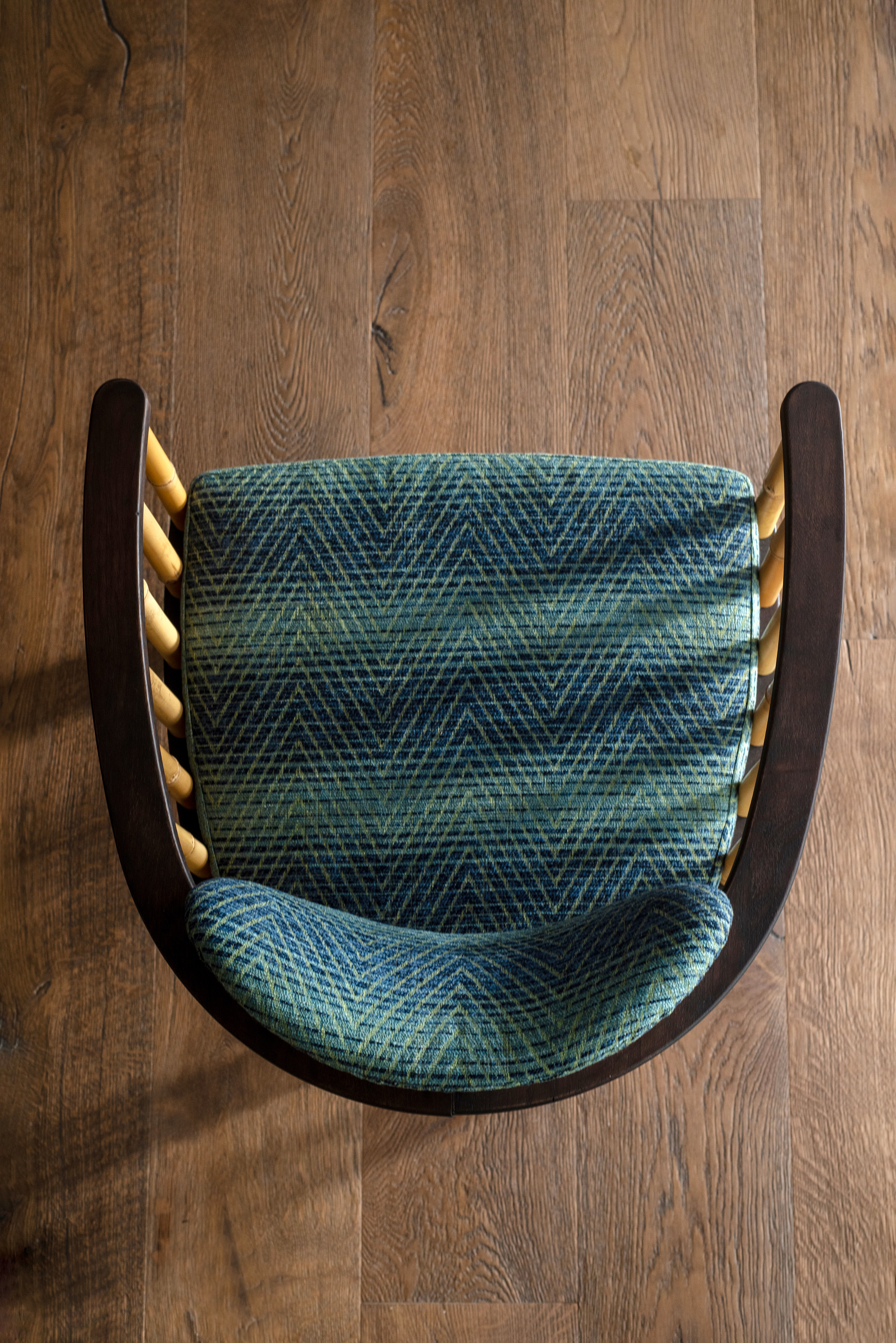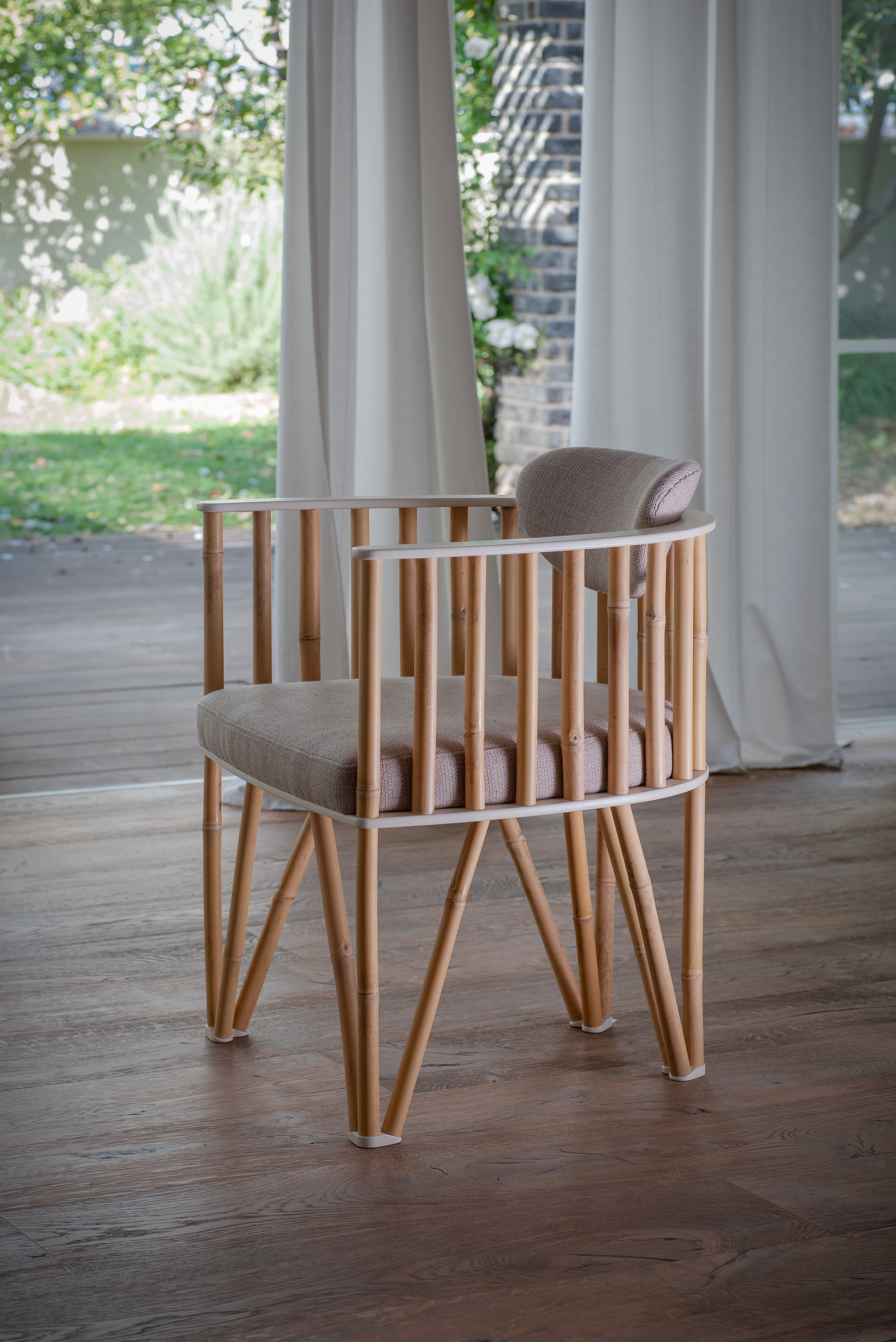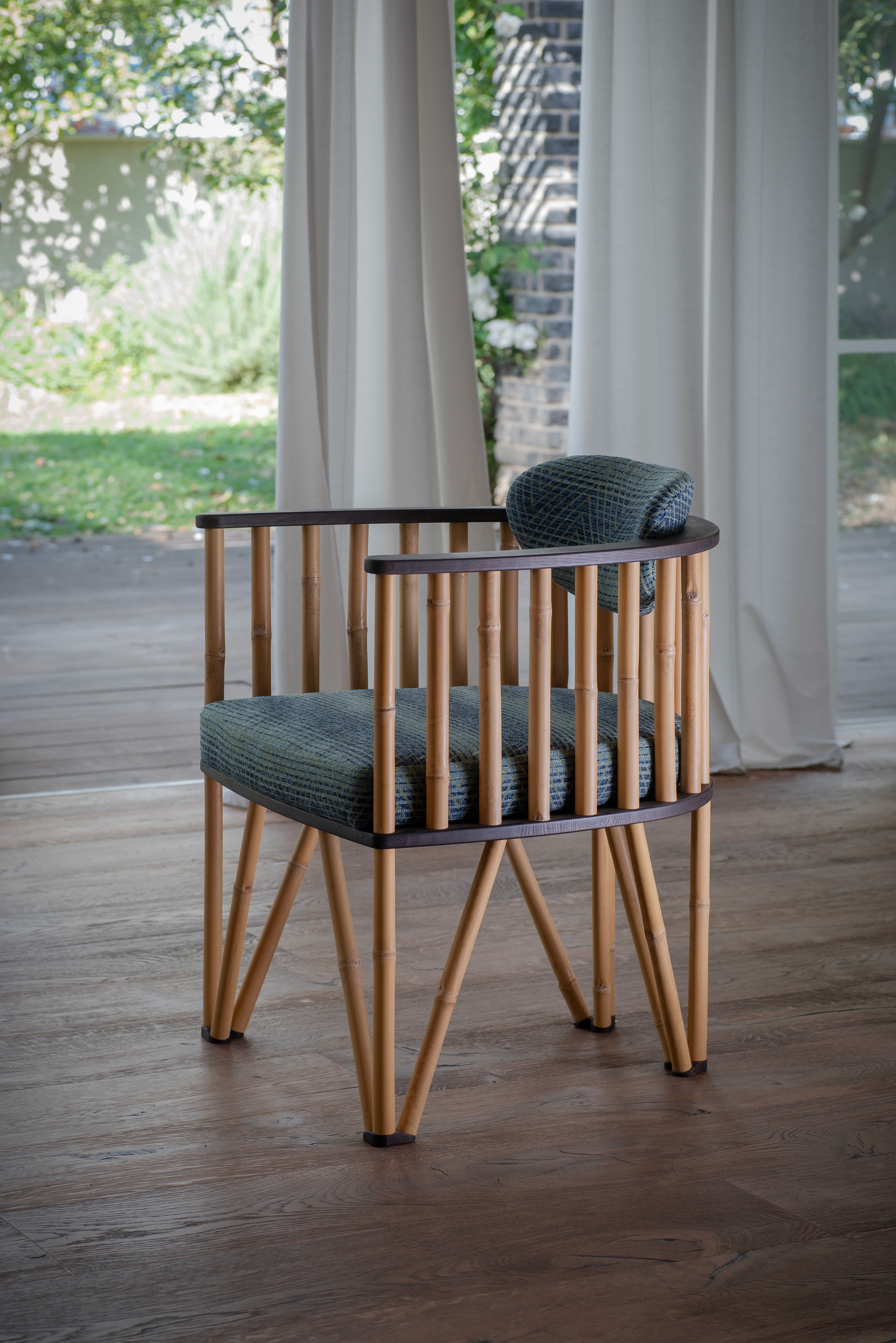 The legs of the chair are made of triangles which provide stability and rigidity without increasing its weight. The upper part of the chair is constructed with a round bamboo and wood frame, which serves as a comfortable armrest. This armrest incorporates a floating backrest, that allows it to adjust itself naturally to the lower back.