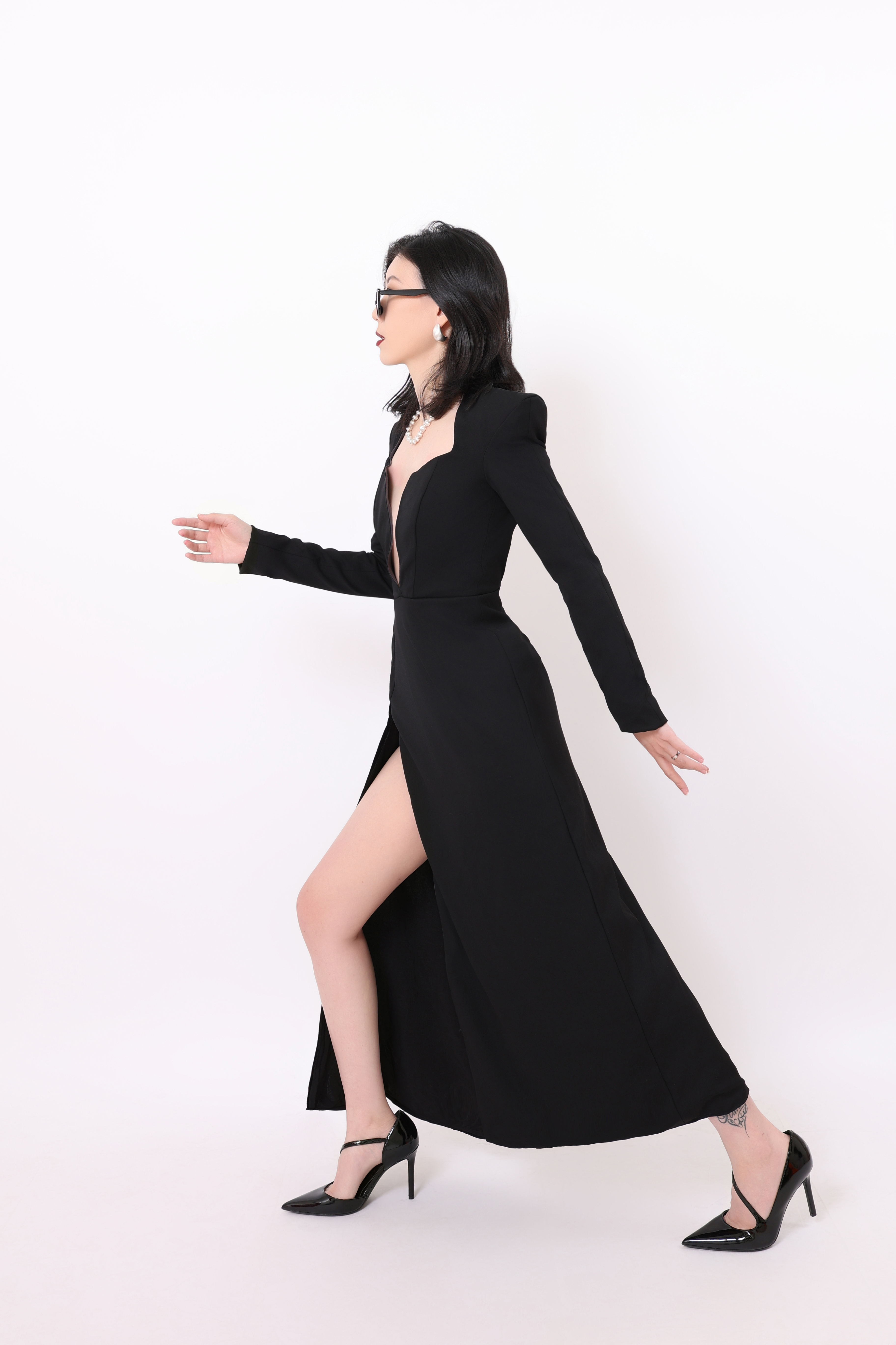 Tailoring is equally innovative. The high slit paired with tulle fabric achieves a perfect equilibrium between confidence and mystery. Inspired by 1980s power suits, the broad shoulder silhouette contrasts strikingly with a cinched waistline, showcasing both strength and graceful curves. This design element reflects the authority and leadership of modern women in professional and societal contexts. The tulle fabric at key body contours adds layers to the garment, creating a dynamic visual flow that enhances its overall fluidity and elegance. Asymmetric cuts further disrupt conventional symmetrical patterns, embodying women’s courage to defy societal norms and pursue independent self-expression.