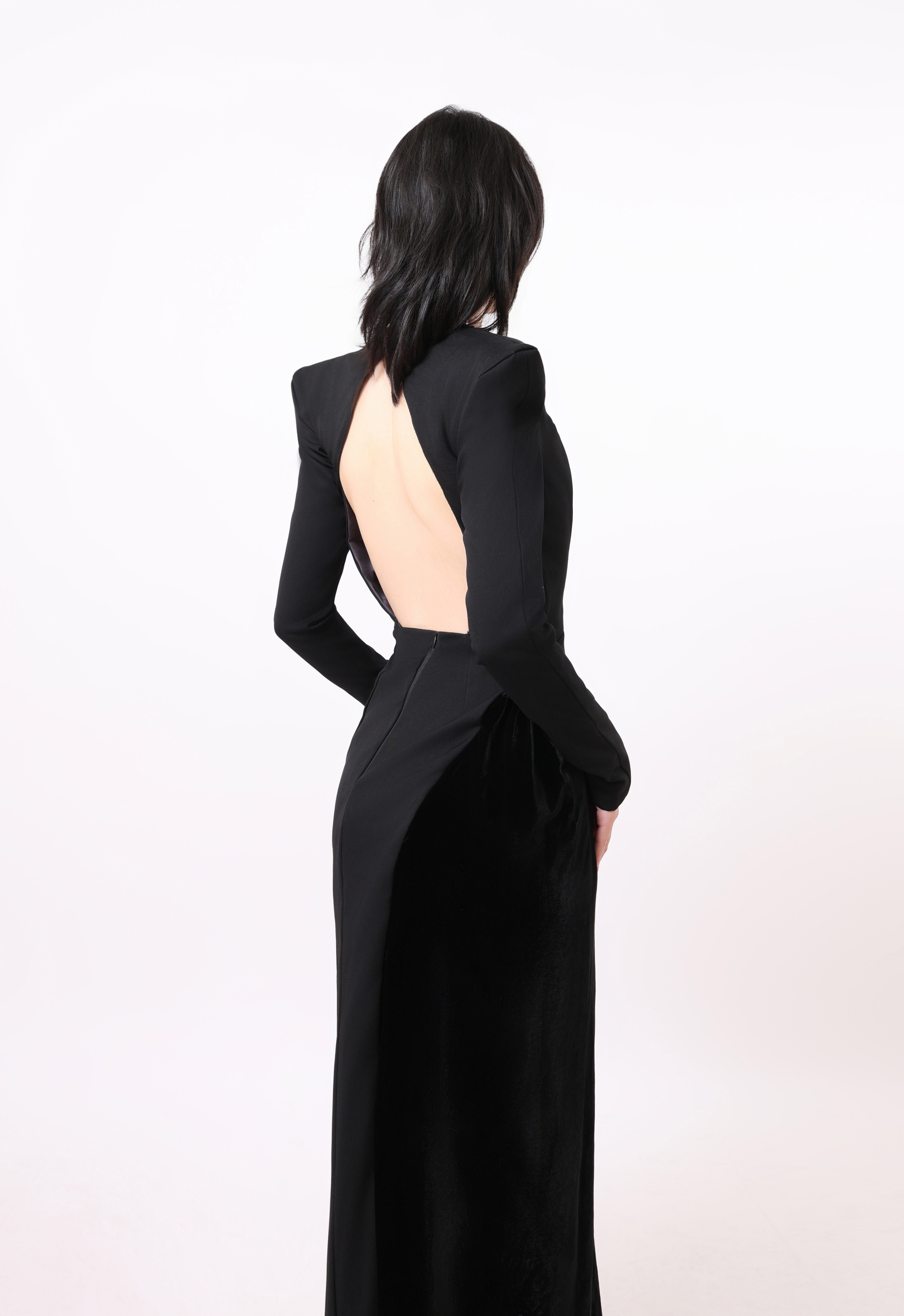 Set against the backdrop of feminist discourse, this apparel design reflects the complexity and multidimensional allure of contemporary women, challenging traditional, monotonous stereotypes of femininity. The choice of materials is particularly ingenious, combining leather, suiting fabric, velvet, and tulle—four distinct materials that contrast yet coexist in the design, symbolizing the multifaceted nature of feminine qualities.