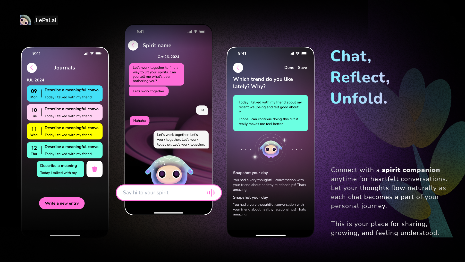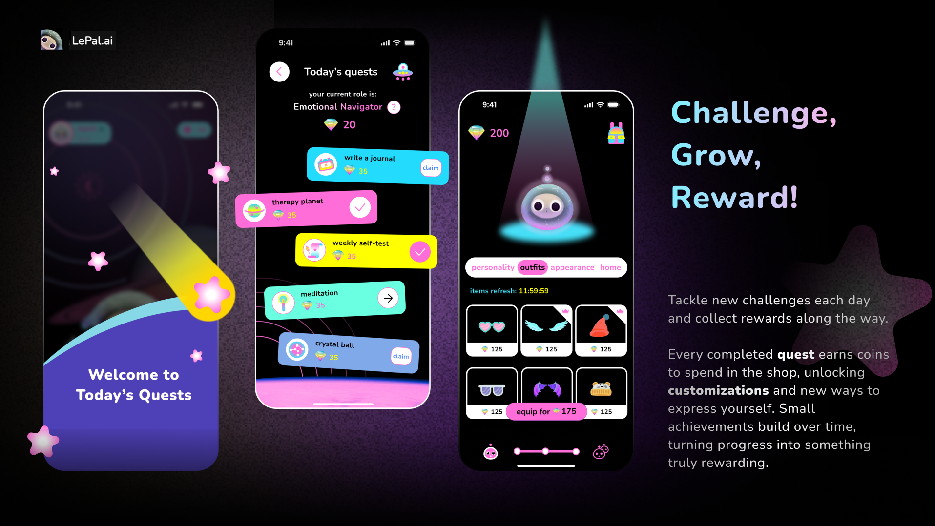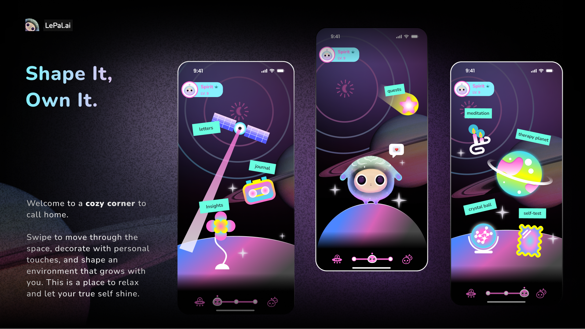 LePal.ai reimagines mental wellness by infusing gamification with AI-driven personalization, making self-care interactive, rewarding, and effortless. It transforms wellness management into bite-sized, game-like experiences powered by large language models. Through AI-generated “spirit companions,” users receive personalized mindfulness guidance, CBT-based exercises, and real-time emotional insights. Game mechanics like progress tracking, virtual rewards, and customizable avatars encourage consistency, while mood maps and social features foster connection and a sense of belonging. By building a supportive mental health community, LePal.ai helps reduce stigma and integrate well-being into daily life.