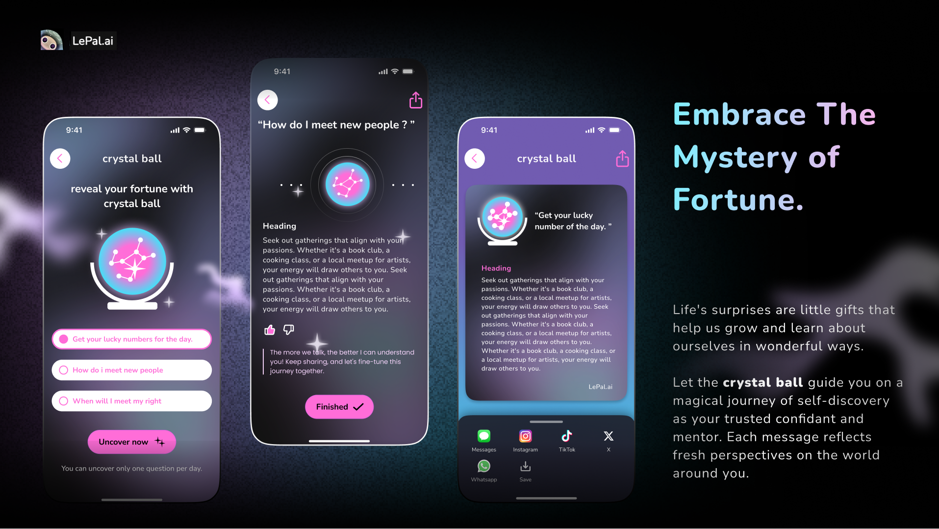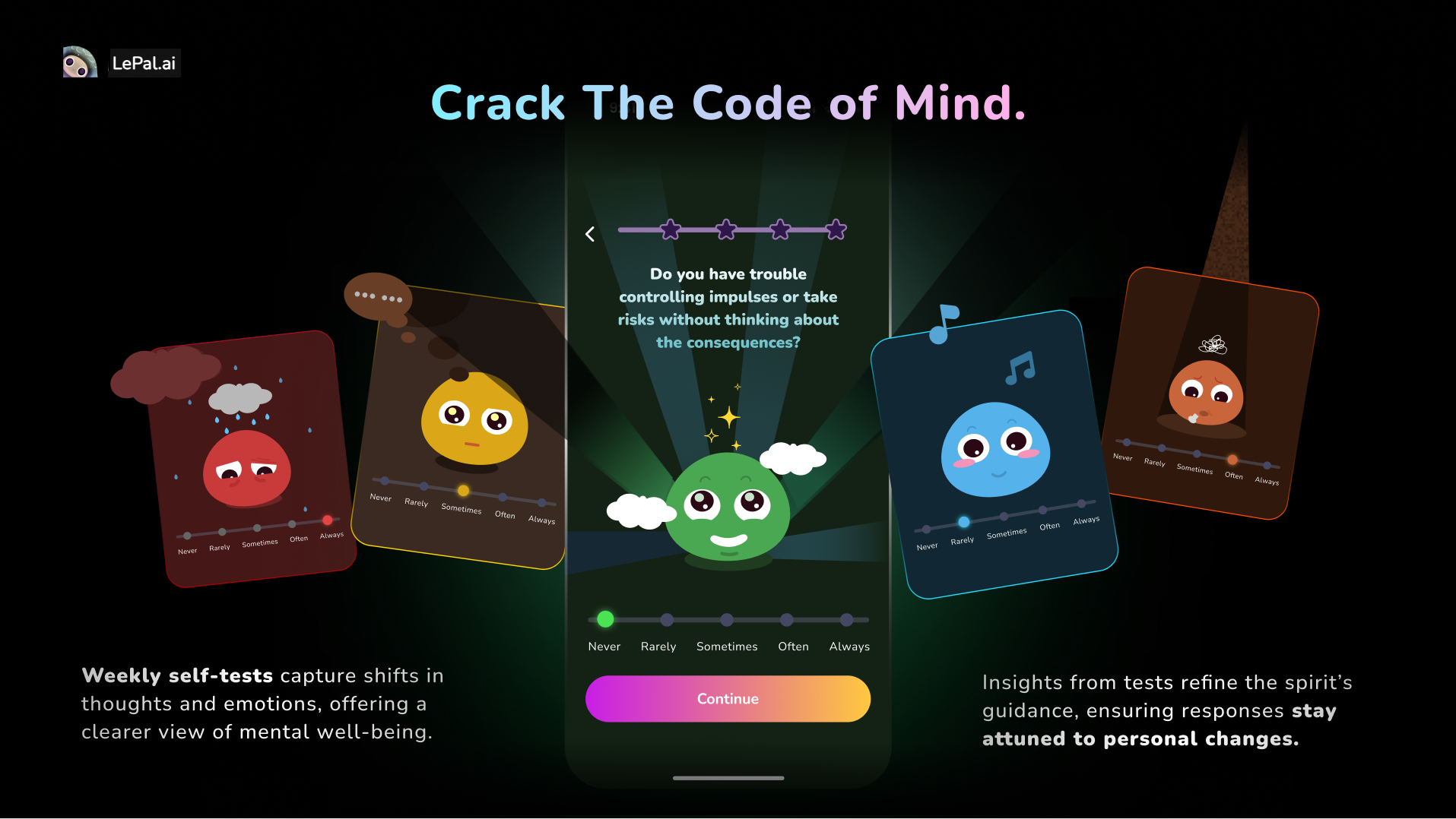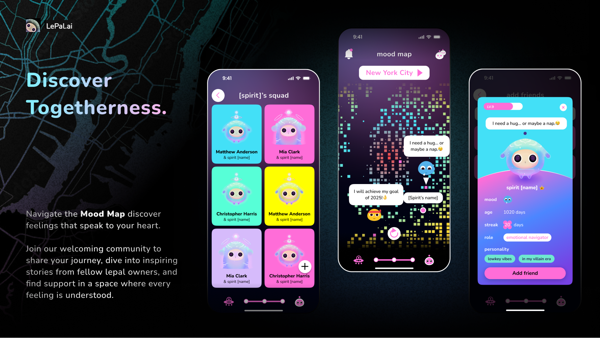 LePal.ai reimagines mental wellness by infusing gamification with AI-driven personalization, making self-care interactive, rewarding, and effortless. It transforms wellness management into bite-sized, game-like experiences powered by large language models. Through AI-generated “spirit companions,” users receive personalized mindfulness guidance, CBT-based exercises, and real-time emotional insights. Game mechanics like progress tracking, virtual rewards, and customizable avatars encourage consistency, while mood maps and social features foster connection and a sense of belonging. By building a supportive mental health community, LePal.ai helps reduce stigma and integrate well-being into daily life.