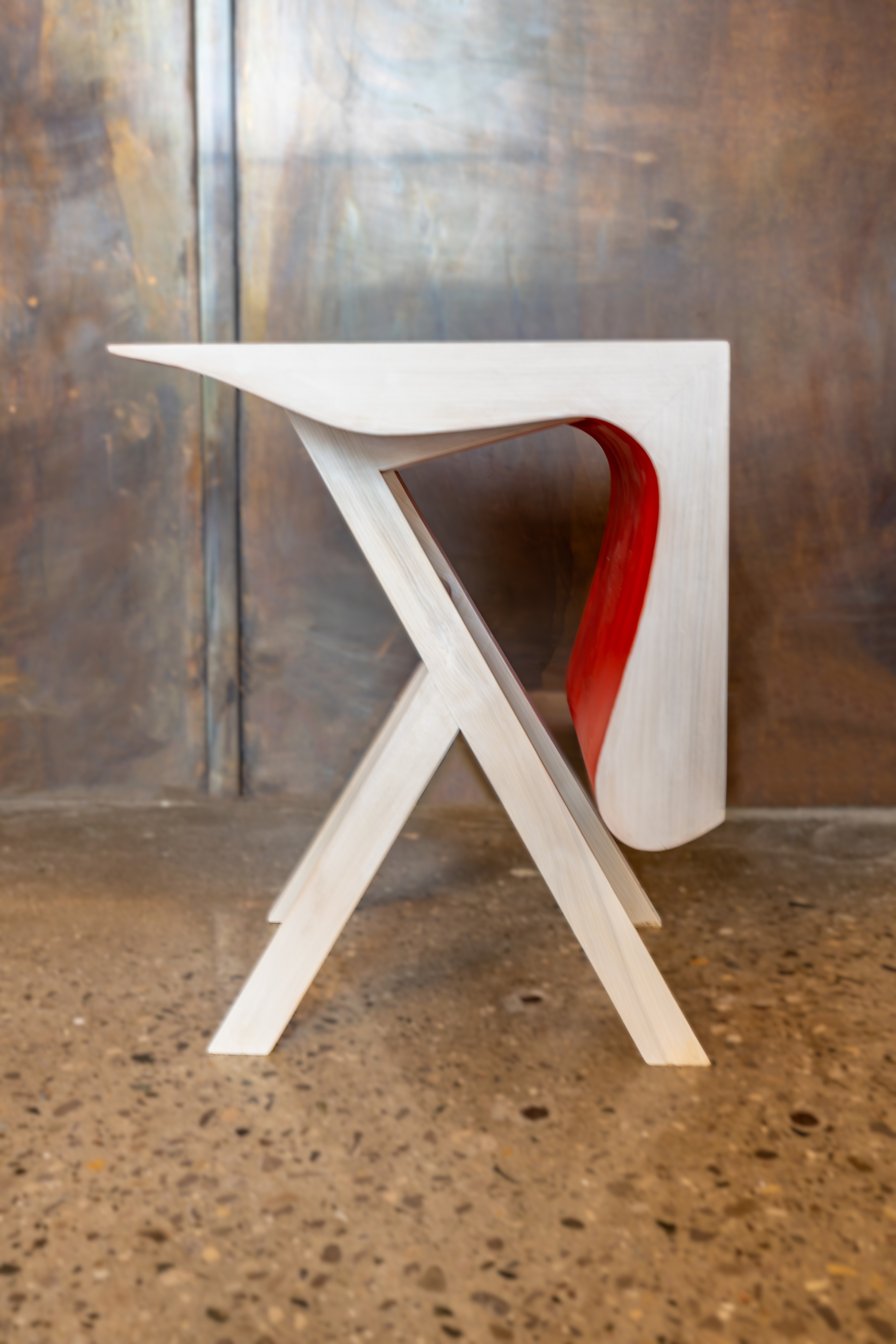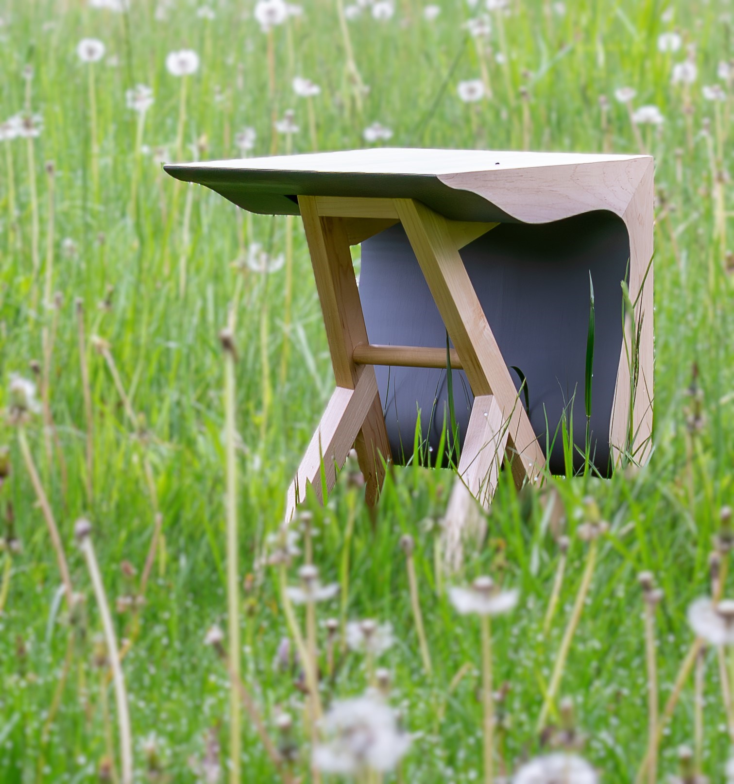 An unexpected gesture to a clean minimalist shape, the concept of this stool is a modest cube with a deconstructed underside: a quiet appearance on one side and bold gesture on the other; a contrast between shell and underside and between line and curve.