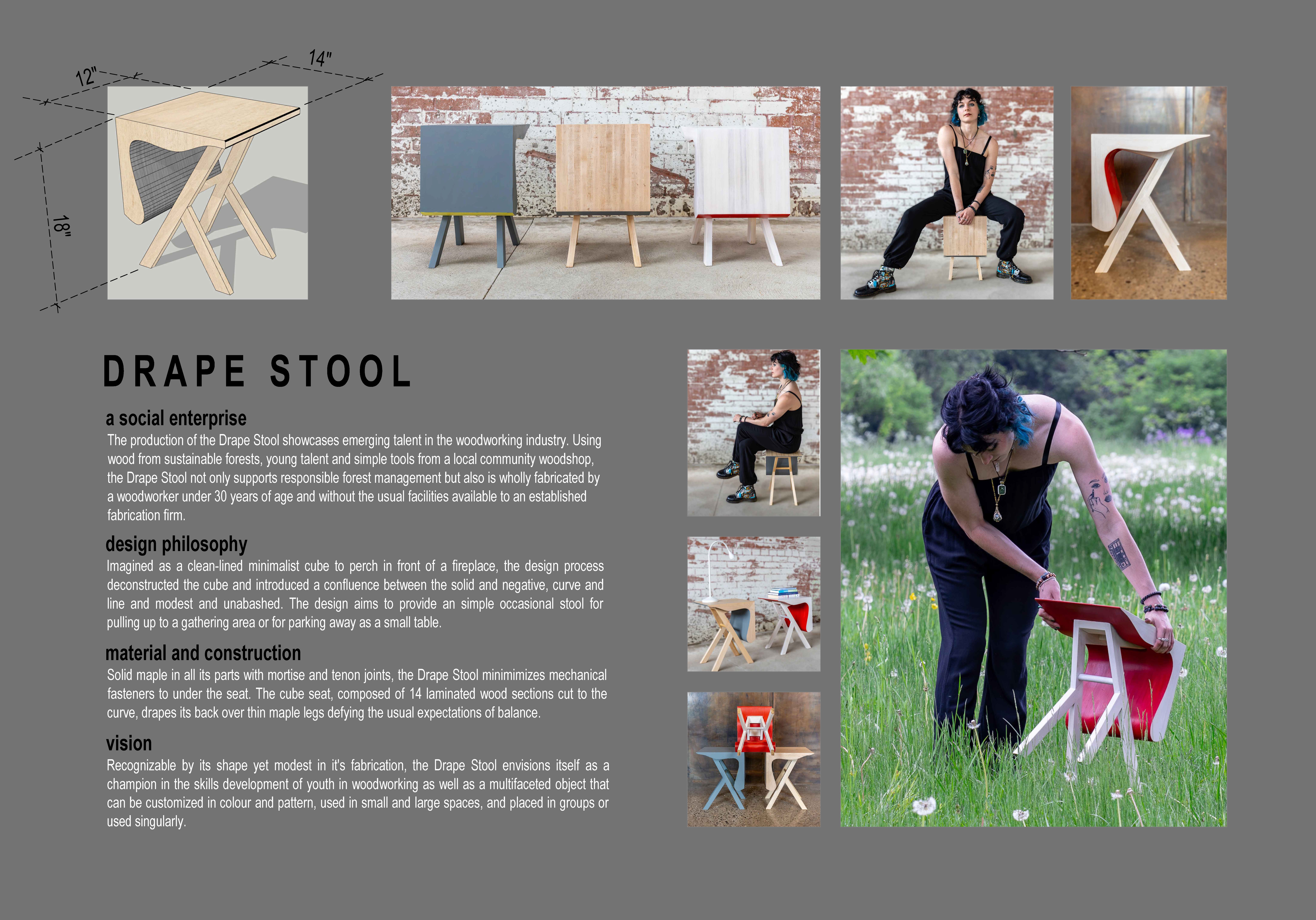 The stool retains a simple but uniquely identifiable shape that carries a social statement. And in this case, an investment in youth in woodworking. The fabrication of this product utilizes a local community woodshop to provide the under 30 age group an opportunity to demonstrate their expertise in woodworking and to advance the craft of fine furniture.