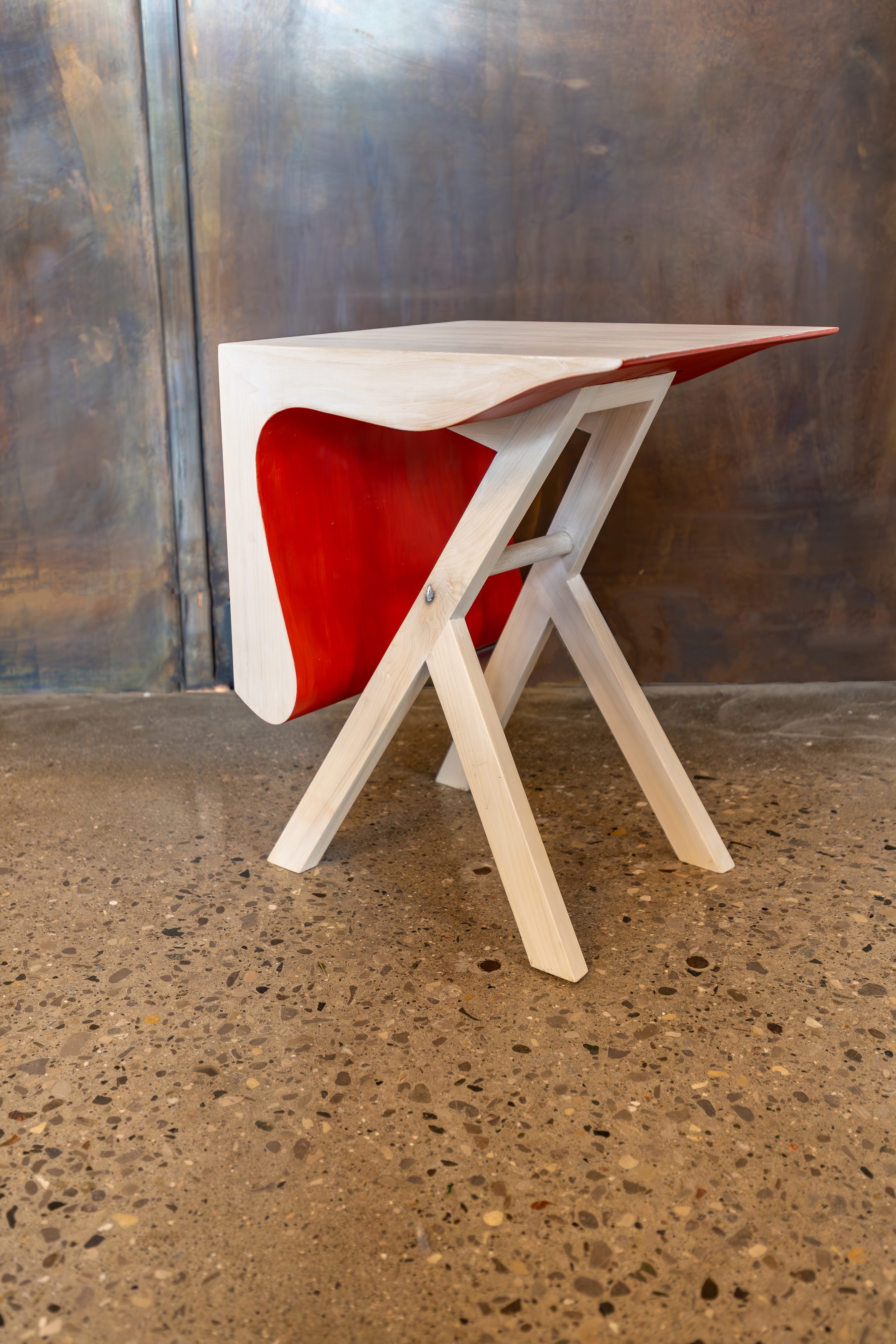 Responding to a missing gap in small seating options to pull up to a gathering space or put back in a corner as a table. This stool is intended to be equally suited in front of a fireplace of a large formal area, a small condo space, or a multi-functional exhibition space.