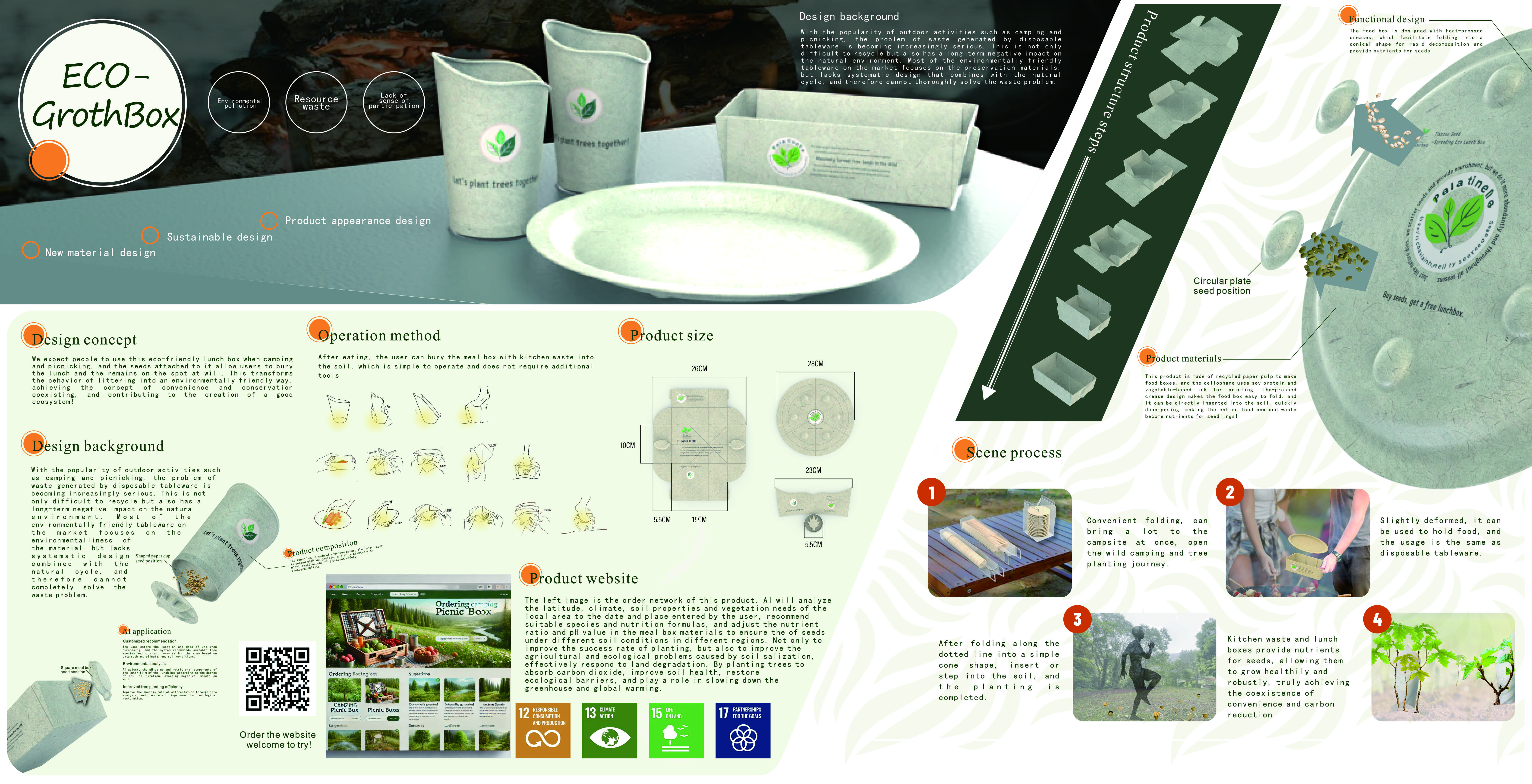 Eco-Grow Box offers a different path. It looks like an ordinary lunchbox but is much more. Made entirely from recycled paper pulp and coated with natural soy protein, it holds food safely without plastic or synthetic materials. The real innovation lies inside—embedded seeds that turn waste into renewal. Instead of throwing it away, users fold the empty box into a cone, bury it in the soil, and let nature take over. The packaging decomposes on its own, and within weeks, new plants begin to grow. Unlike other biodegradable packaging that still relies on controlled processing, Eco-Grow Box thrives in the wild, reducing waste while restoring ecosystems. It doesn’t just aim to be less harmful—it actively makes things better, turning outdoor dining into a small but meaningful act of reforestation.