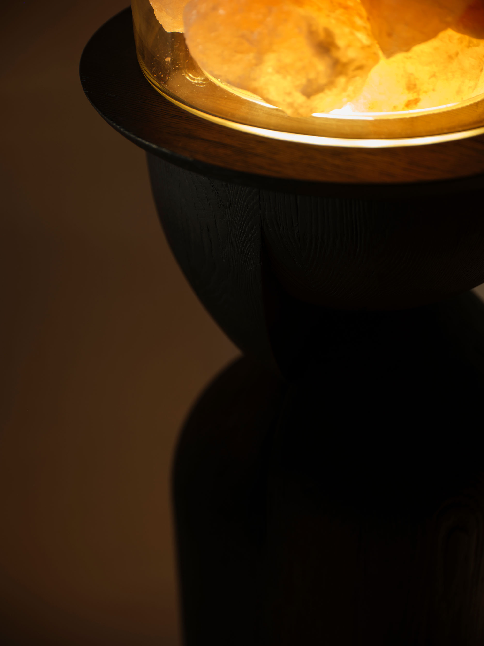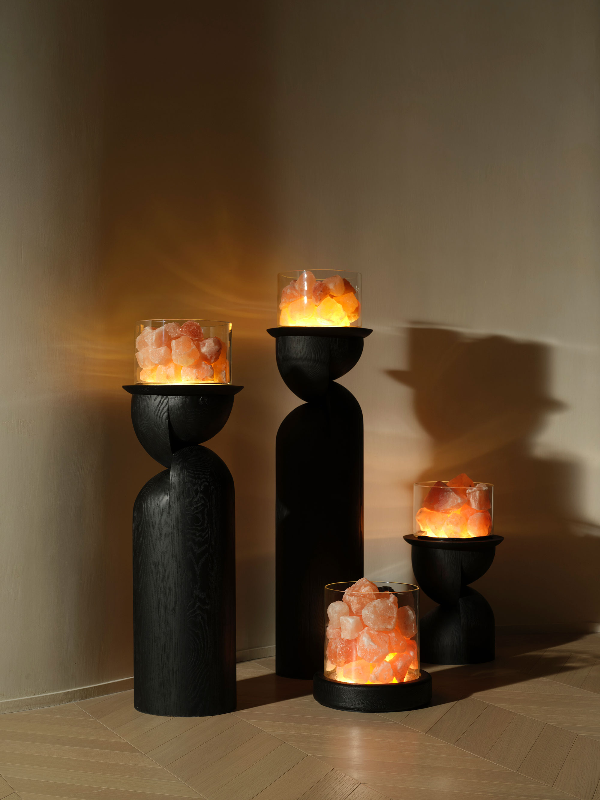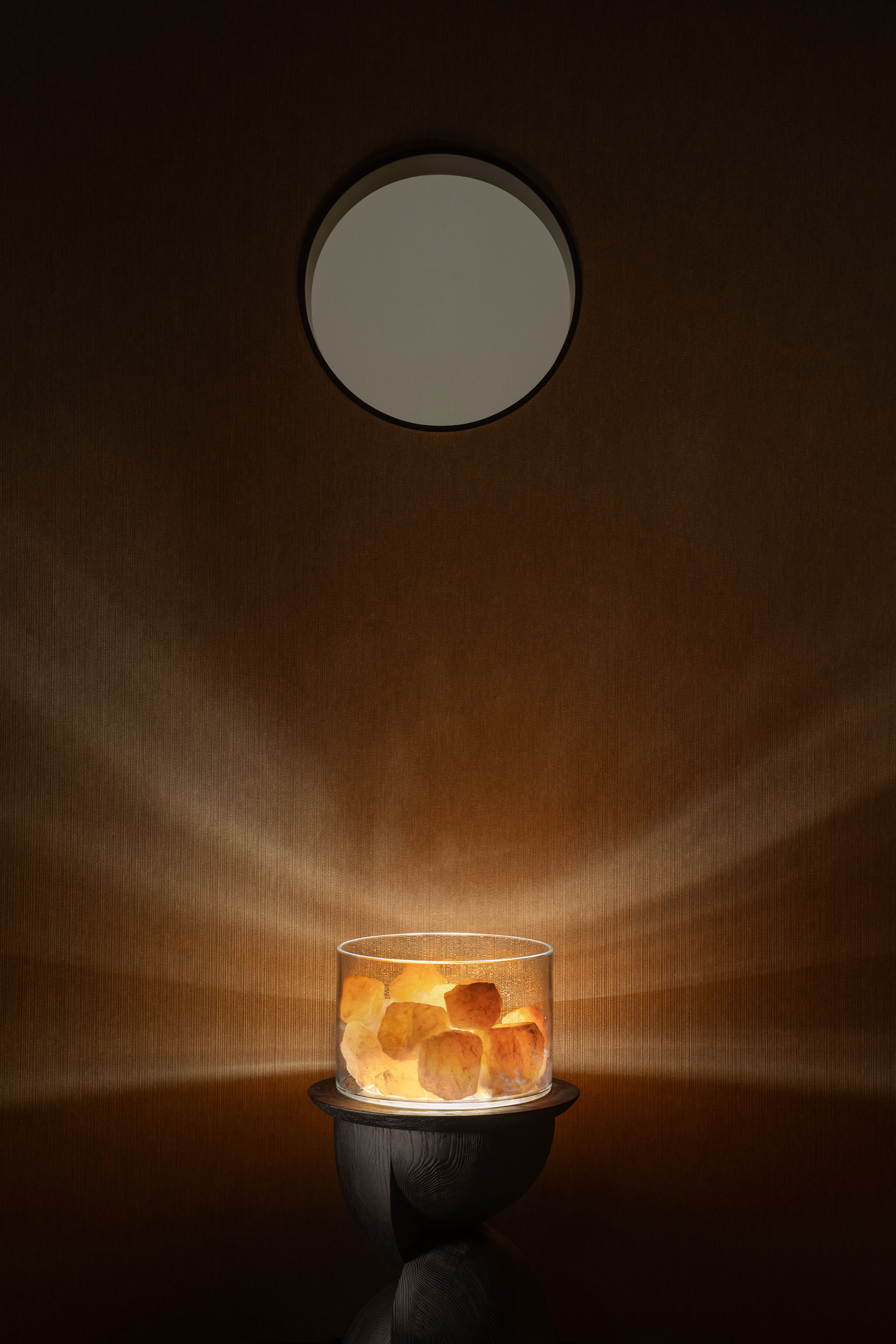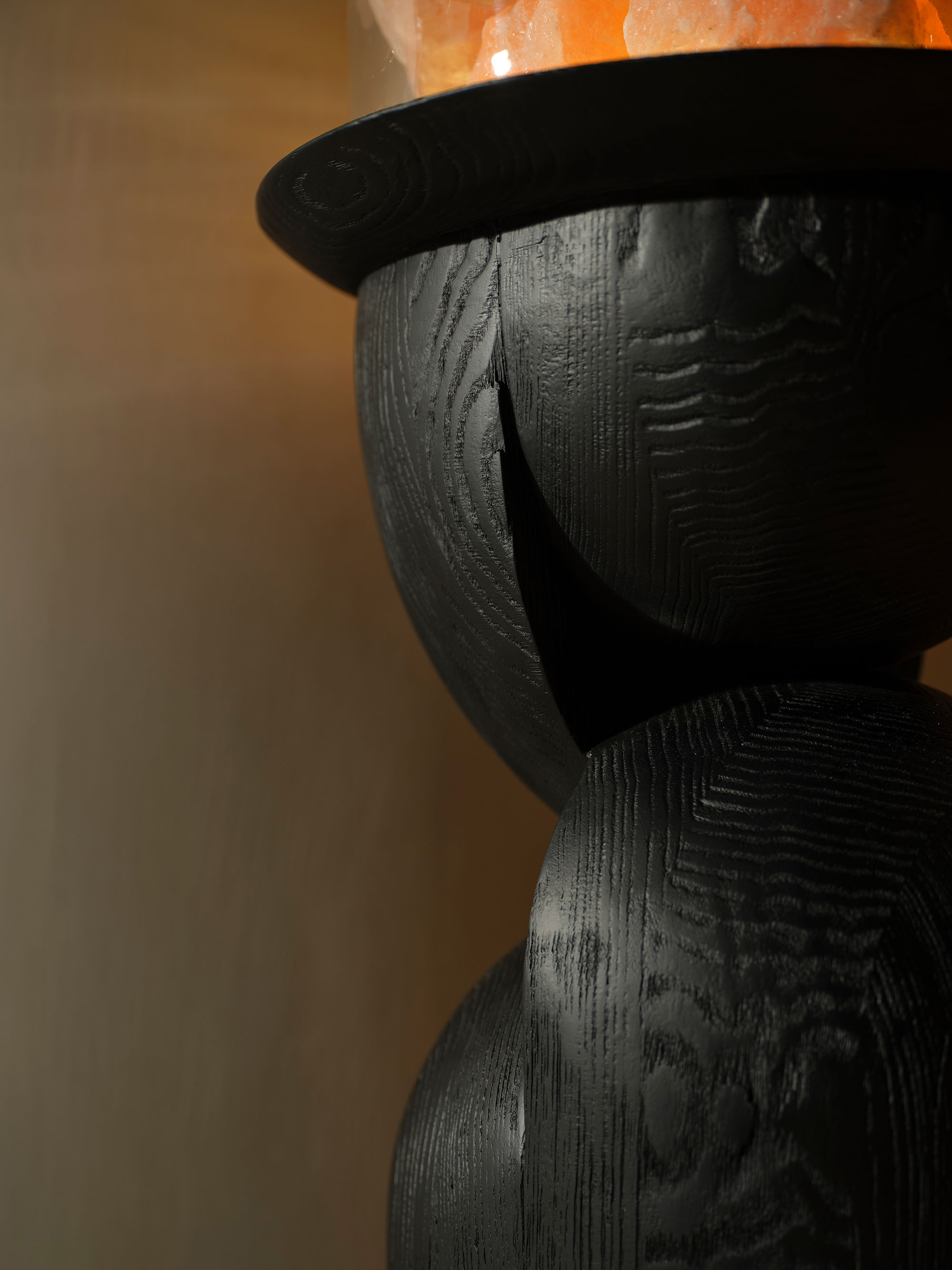 This product and design showcase the beauty of intertwining forms, with a carved wooden structure that spirals gracefully around a glass core. It is Inspired by natural transformation, it emits a gentle, peaceful glow that fills any space with warmth. The special function of it is being a sculptural lamp stand, with the filing of Himalaya Salt stone, or it can even turn into a candle holder. The idea of light and shadow is integrated, is about appreciating the power of hope and healing.