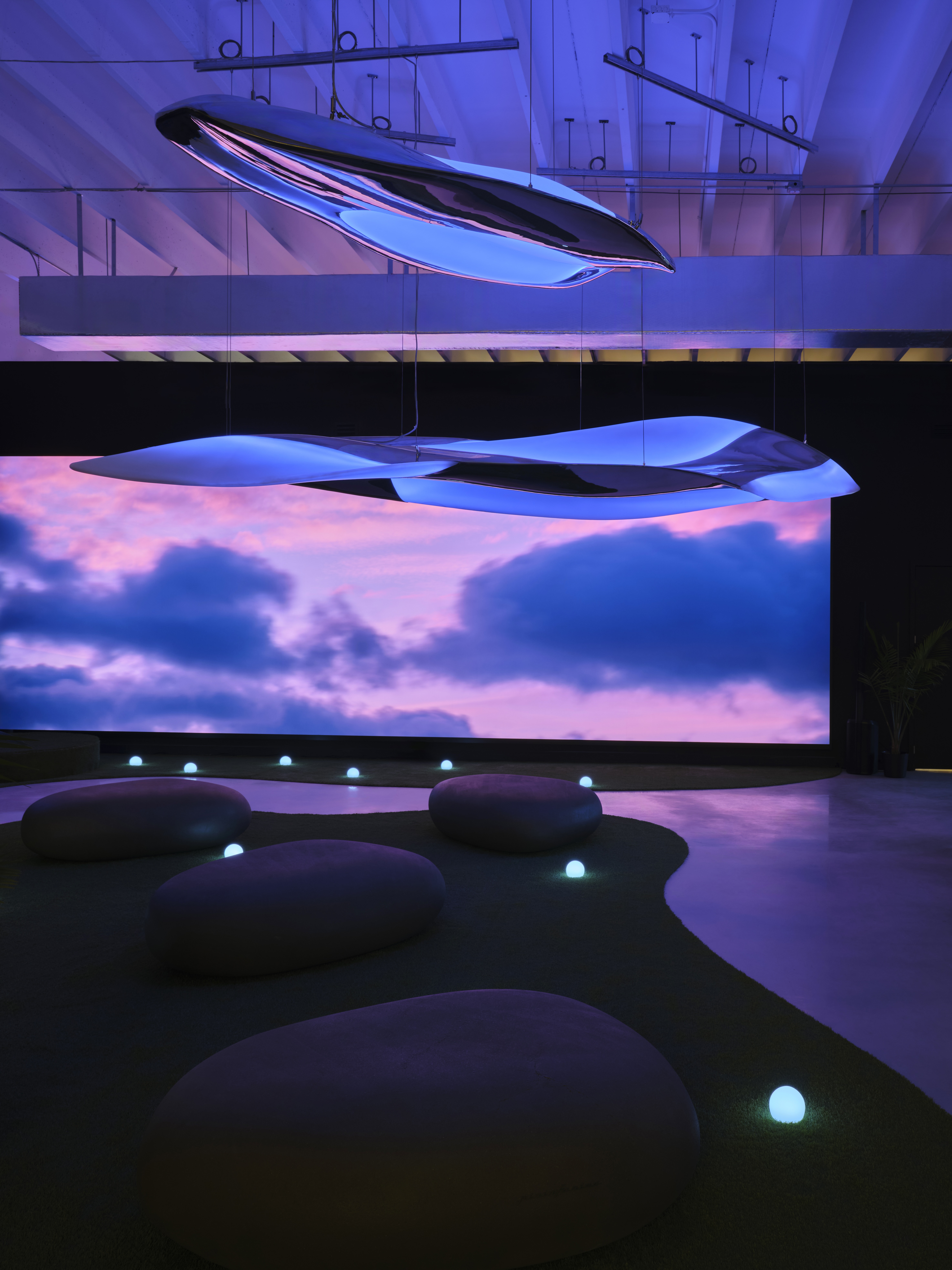 Beyond lighting, the installation offers a multi-sensory experience. A custom soundscape and accompanying cinematic visuals, created by French filmmaker Gwenael Lewis, enhance the immersive nature of the design, drawing visitors into a world of imagination and nostalgia. To complete the experience, Pininfarina designed sculptural seating inspired by organic rock formations, encouraging visitors to engage with the installation from a place of comfort and contemplation.
