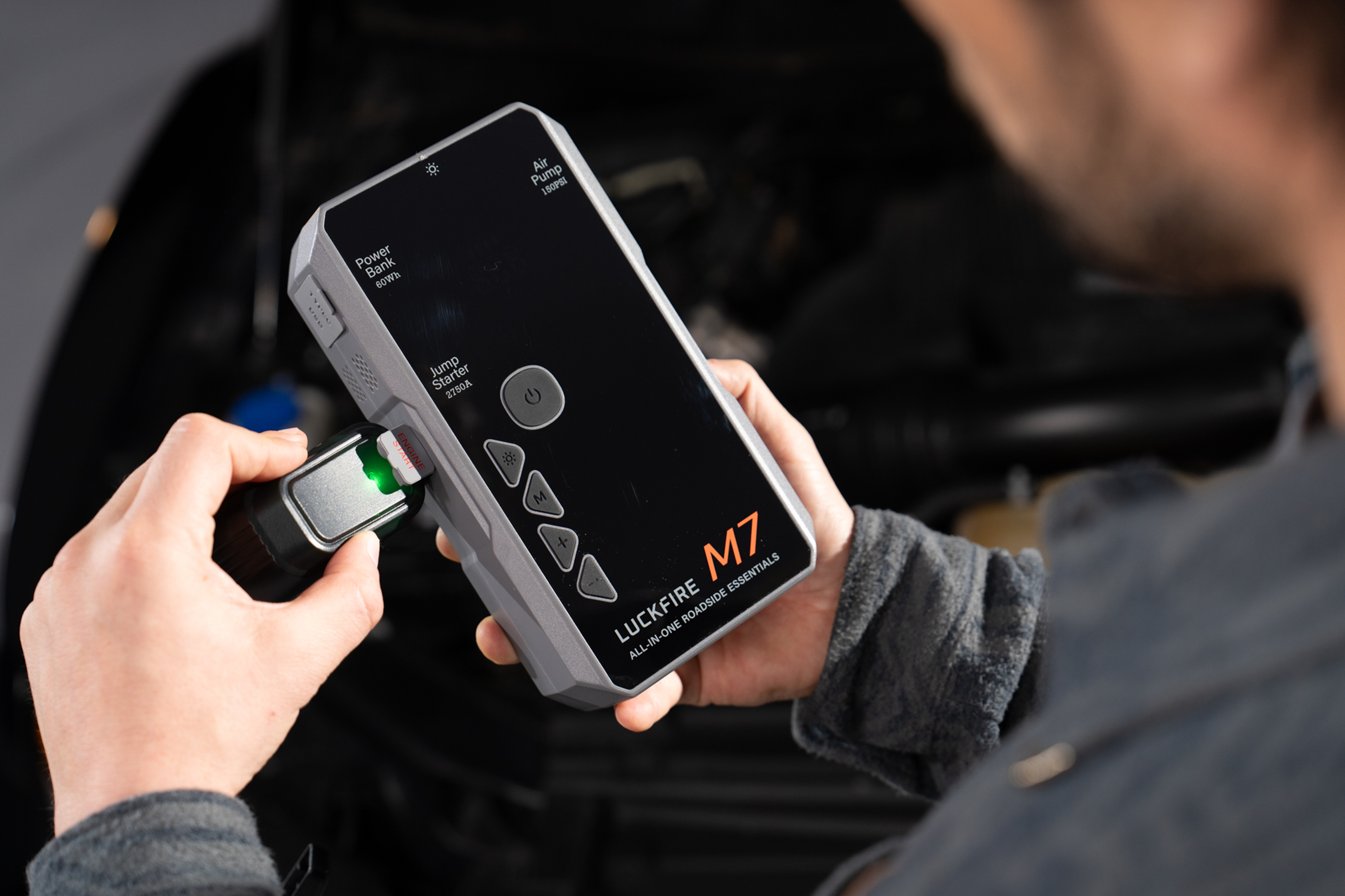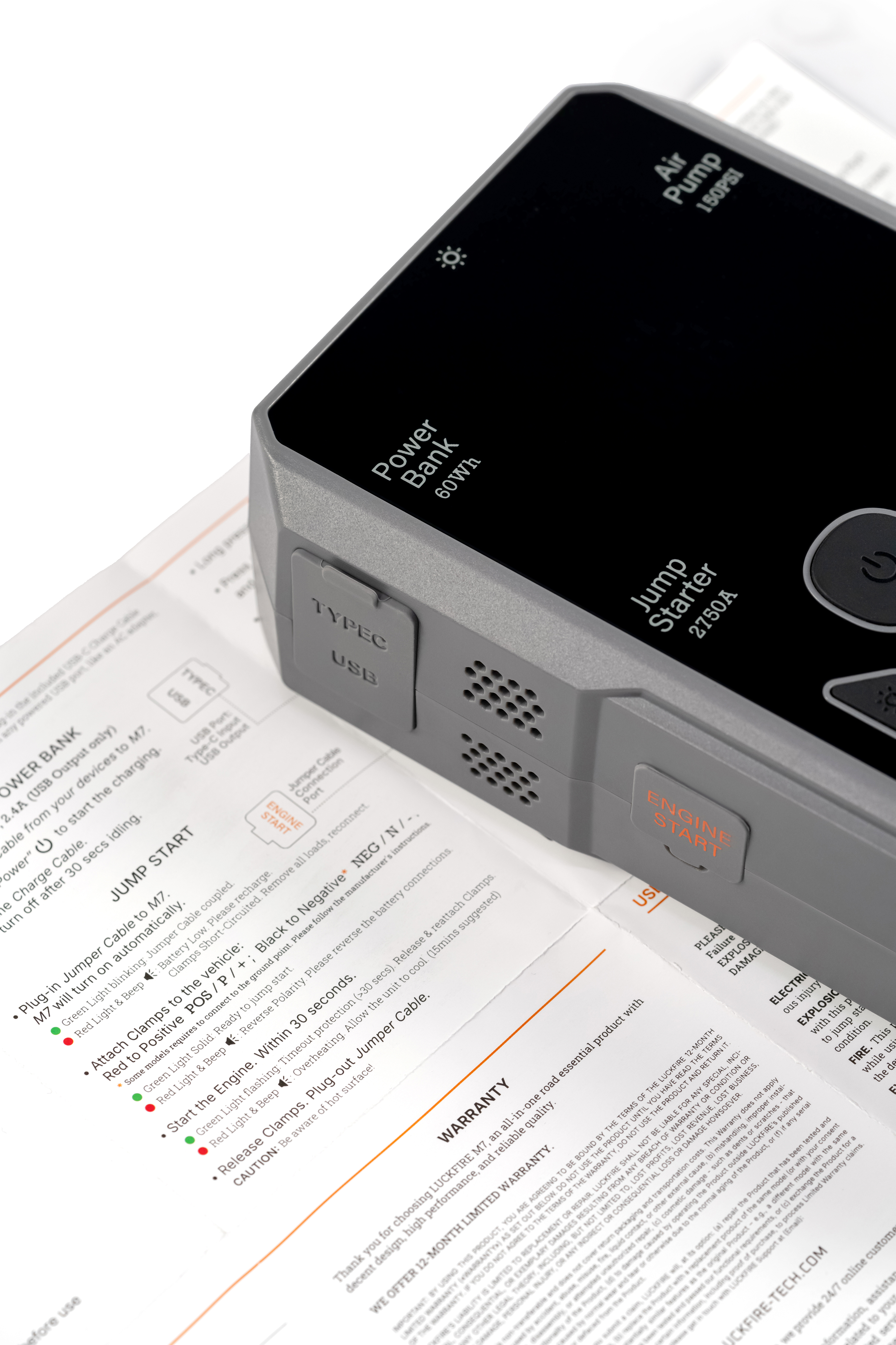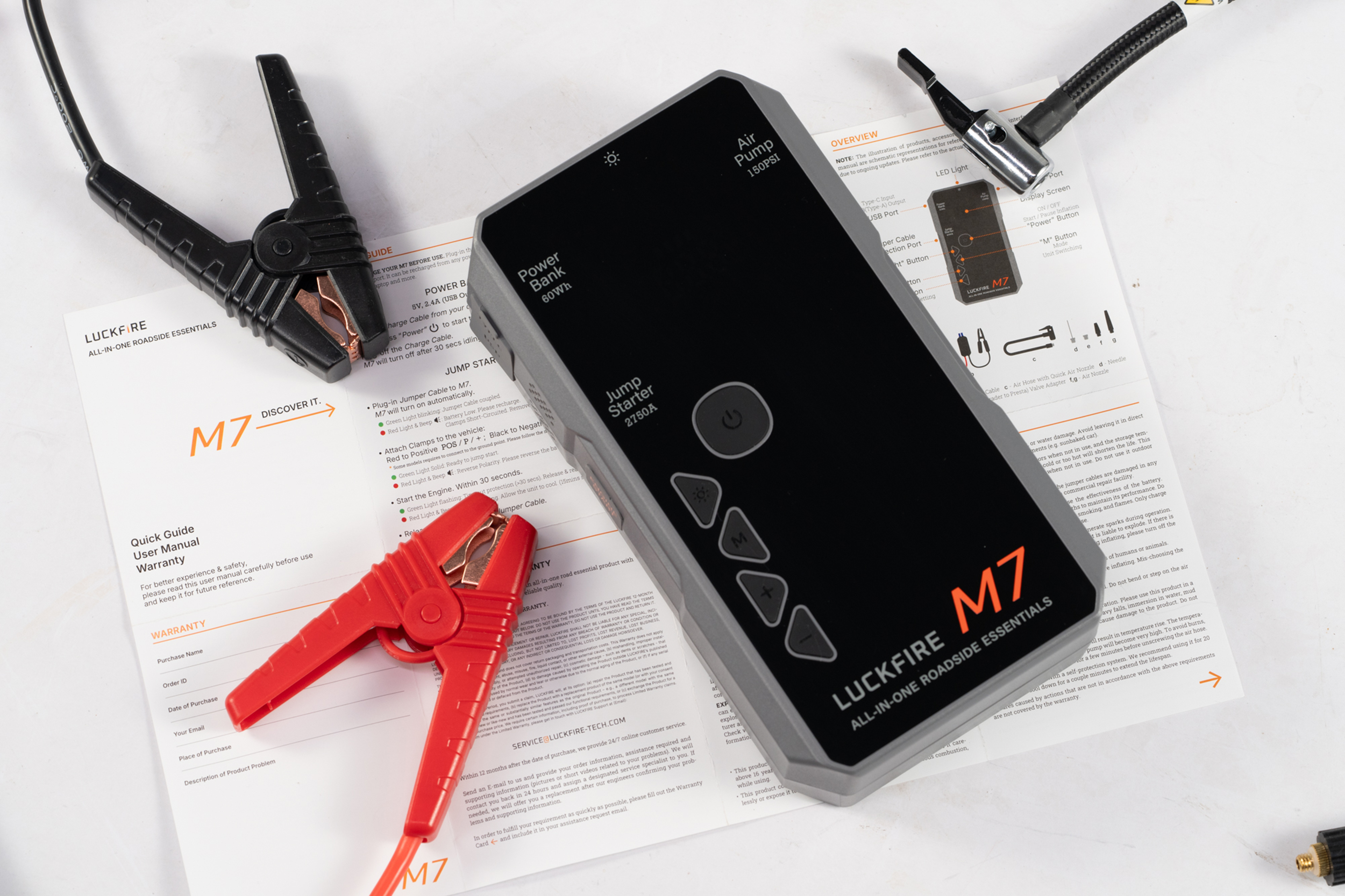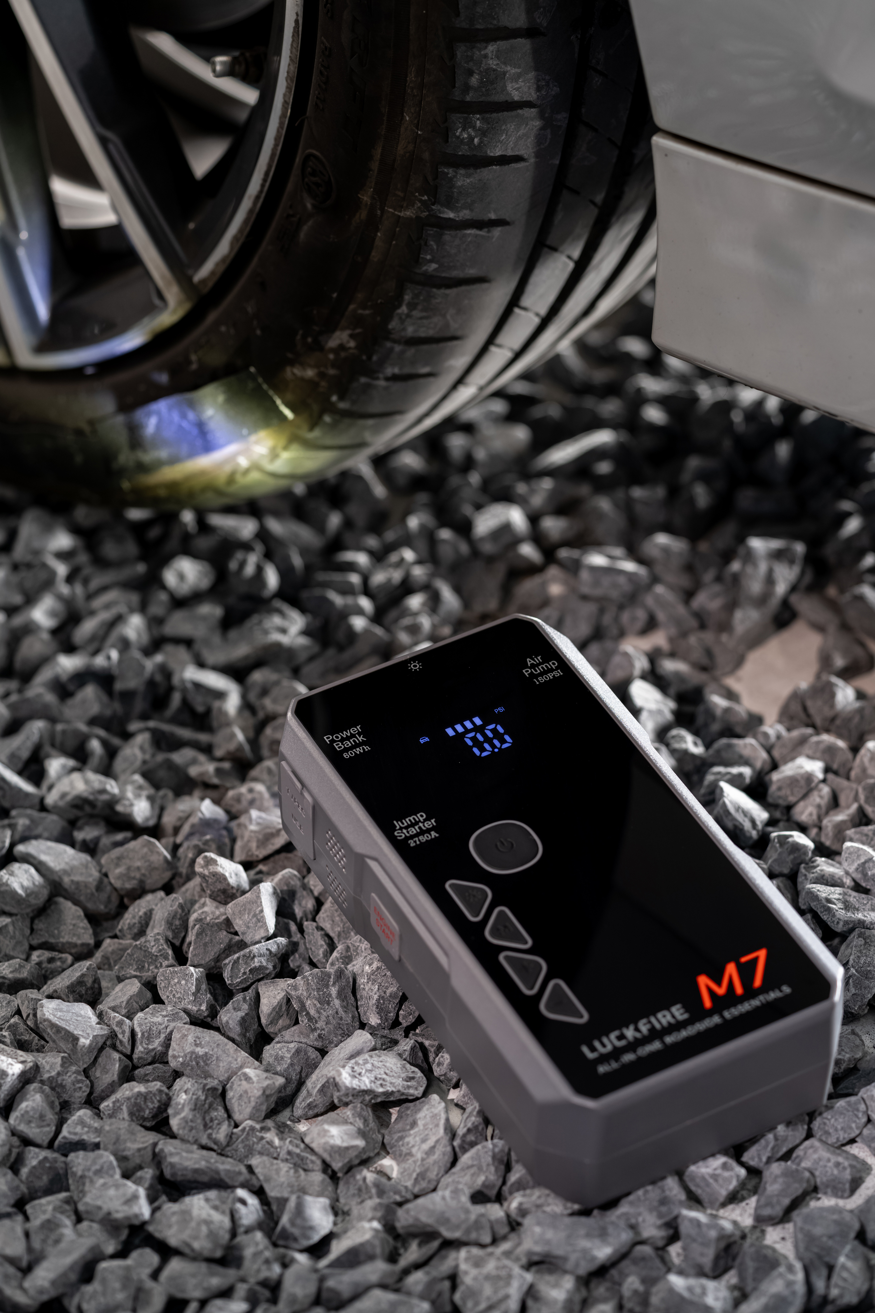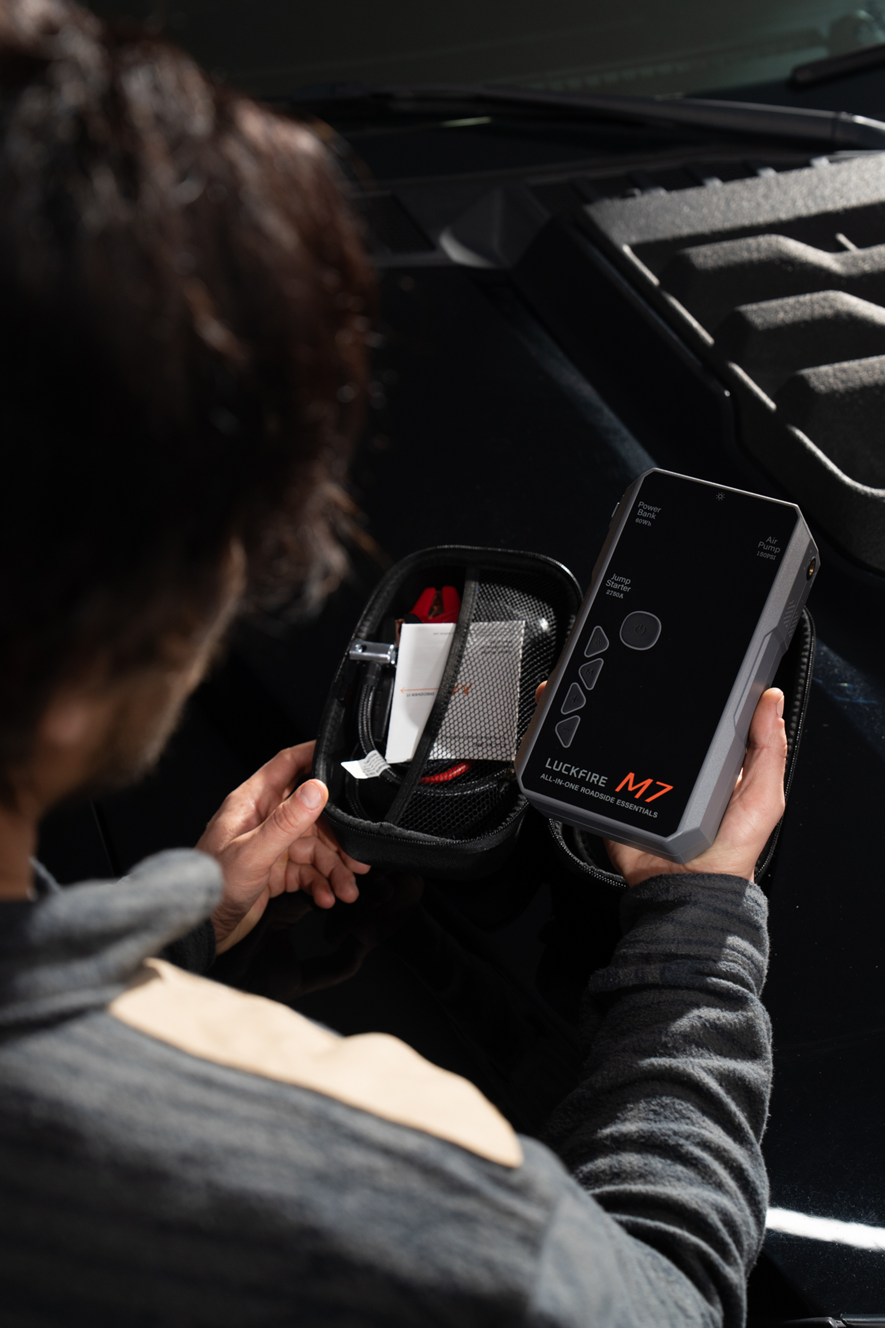 Roadside Essentials M7 is designed around the all-in-one philosophy, where N equals 1. It offers the ultimate compact solution to the diverse challenges faced by drivers and outdoor adventurers. By seamlessly integrating four core functions—jump starting, tire inflation, phone charging, and emergency lighting—into a single device, the M7 eliminates the need for multiple bulky tools. With this sleek yet powerful and reliable device, users can confidently tackle a wide range of travel disruptions, whether on road trips, camping adventures, or everyday drives.