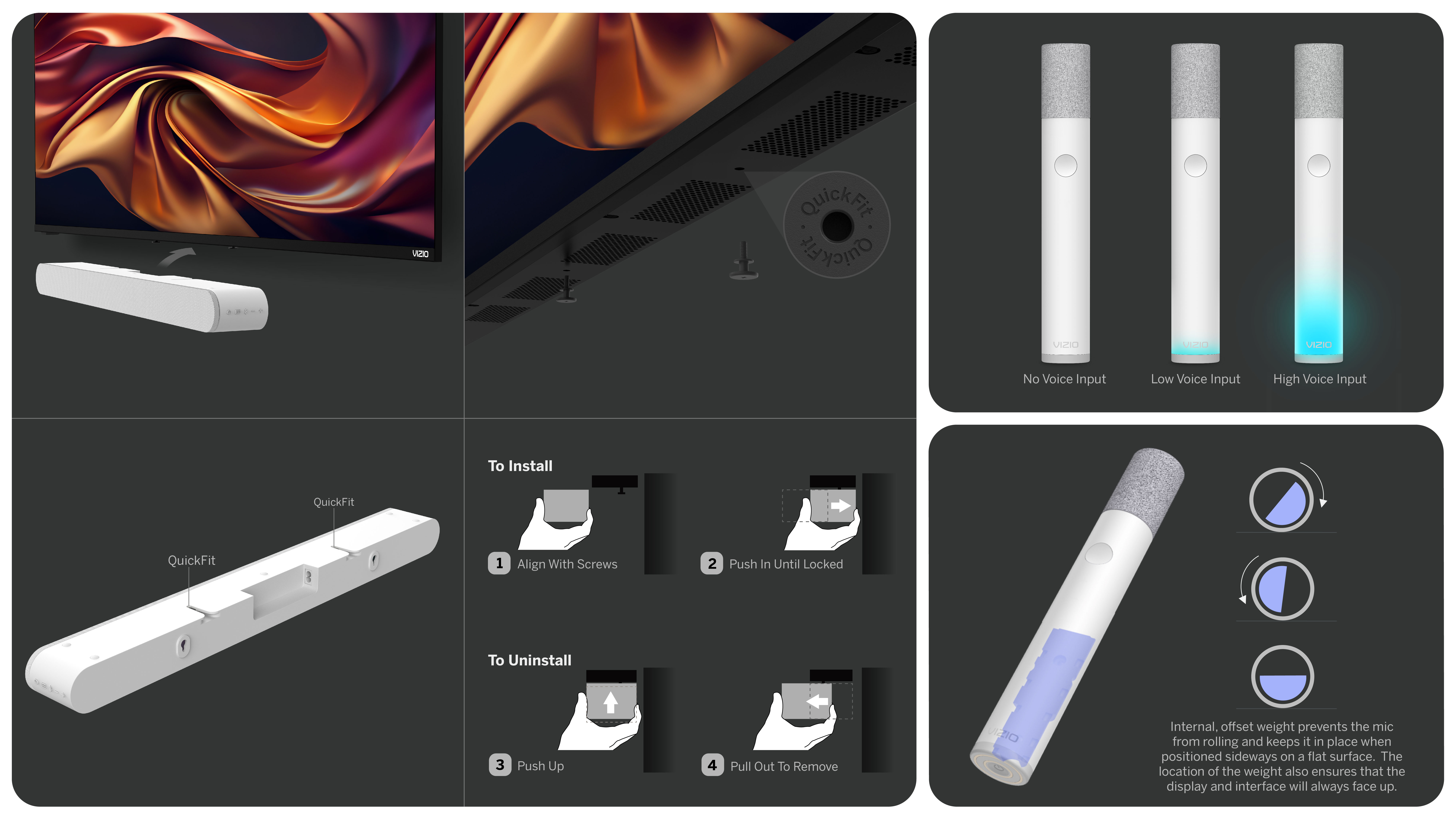 A customizable karaoke experience that will demand an encore, MicMe continues VIZIO’s history of raising the bar for high-impact, immersive audio technology by inviting users to turn up the volume and take their soundbar experience to the next level. MicMe integrates additional technology optimized for karaoke into the VIZIO Soundbar and is paired with two wireless microphones. The soundbar is designed to seamlessly integrate with select VIZIO Smart TVs when attached to the bottom of the TV via QuickFit.