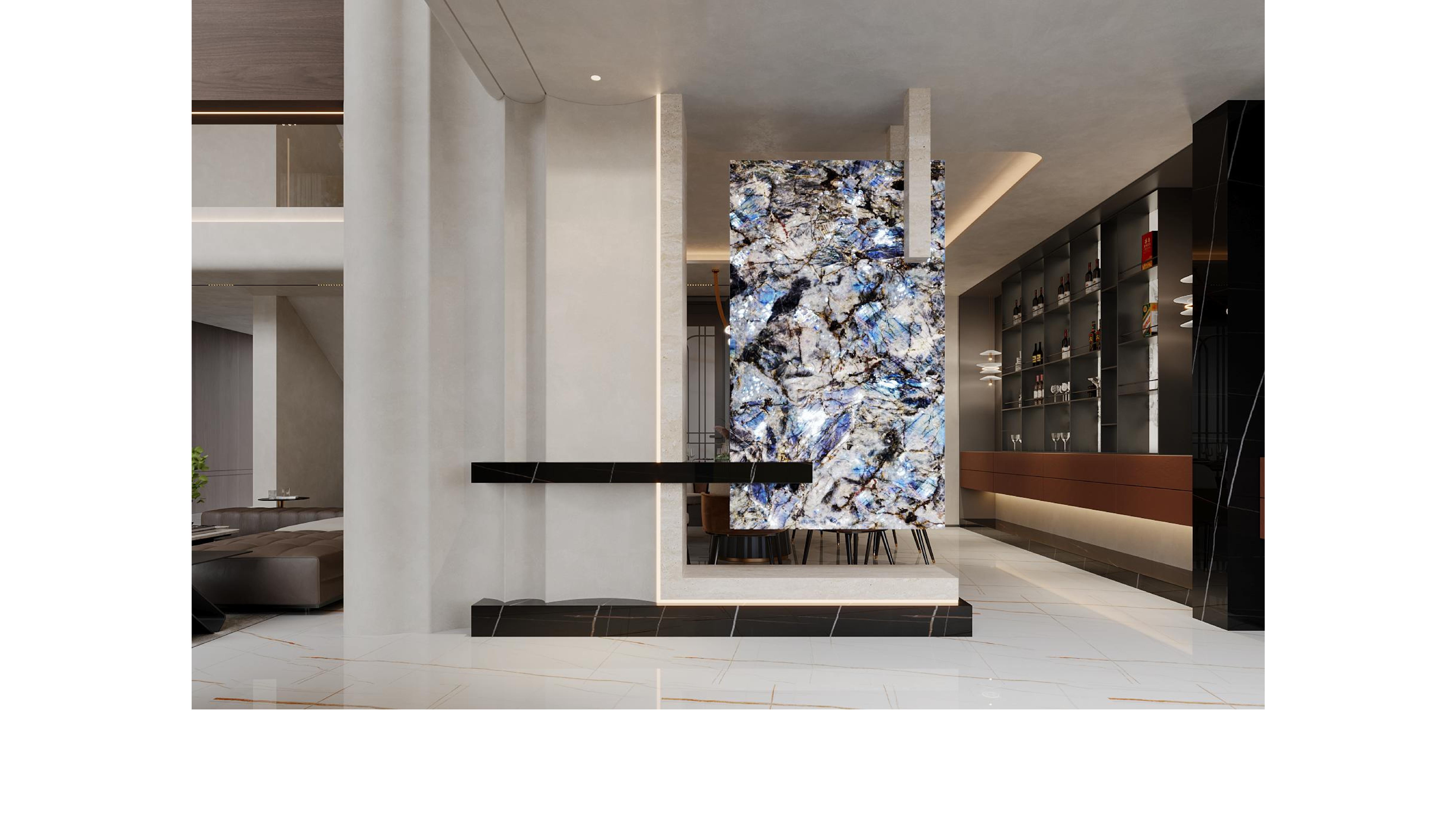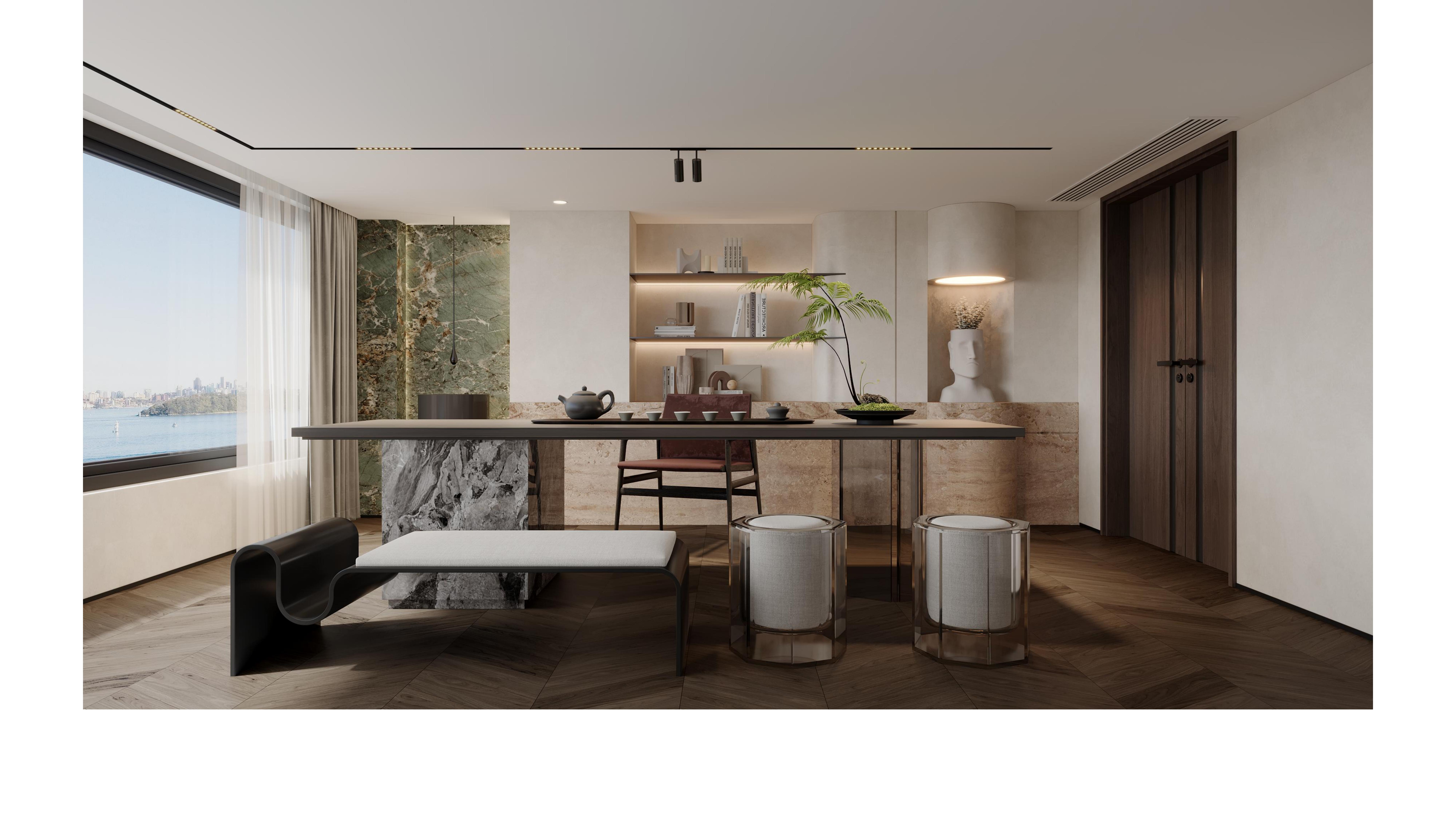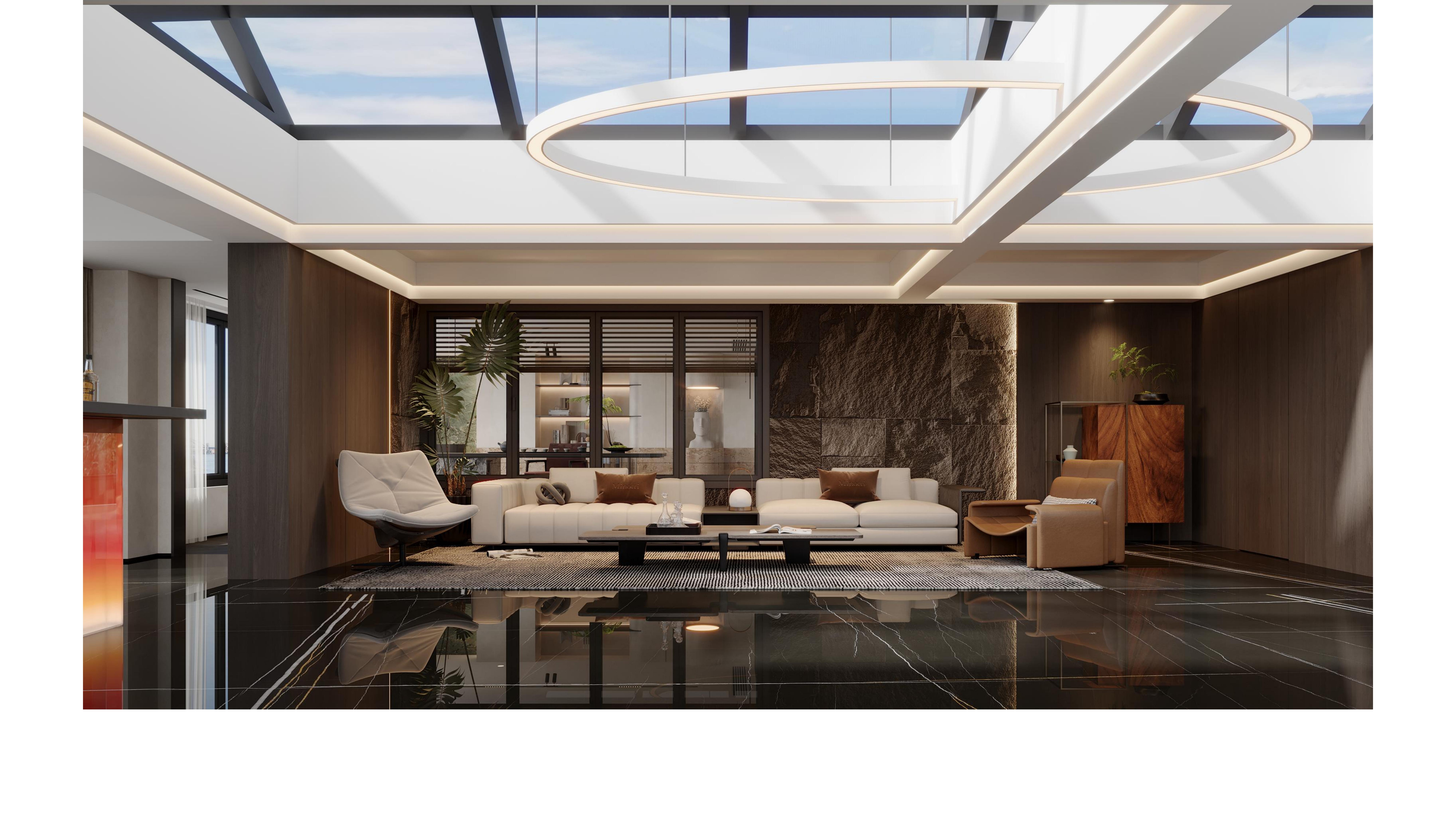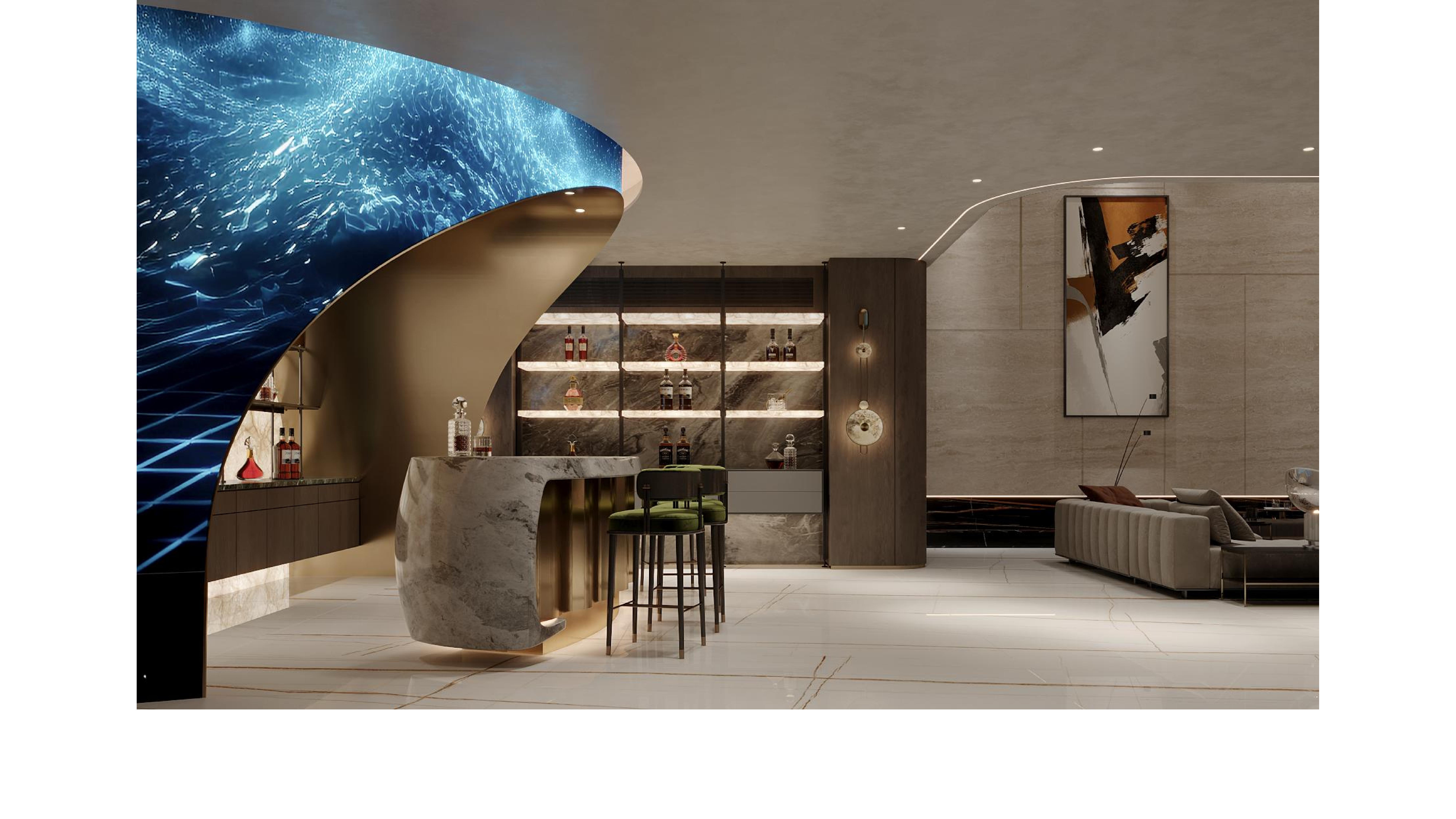 The spacious layout harmonizes seamlessly with its minimalist yet refined furnishings, infusing the space with an artistic ambiance while exuding a sense of unparalleled luxury and sophistication. The designer masterfully plays with the curvature, thickness, and layering of lines, creating a visual rhythm that is both harmonious and dynamic, adding depth and dimension to the space.