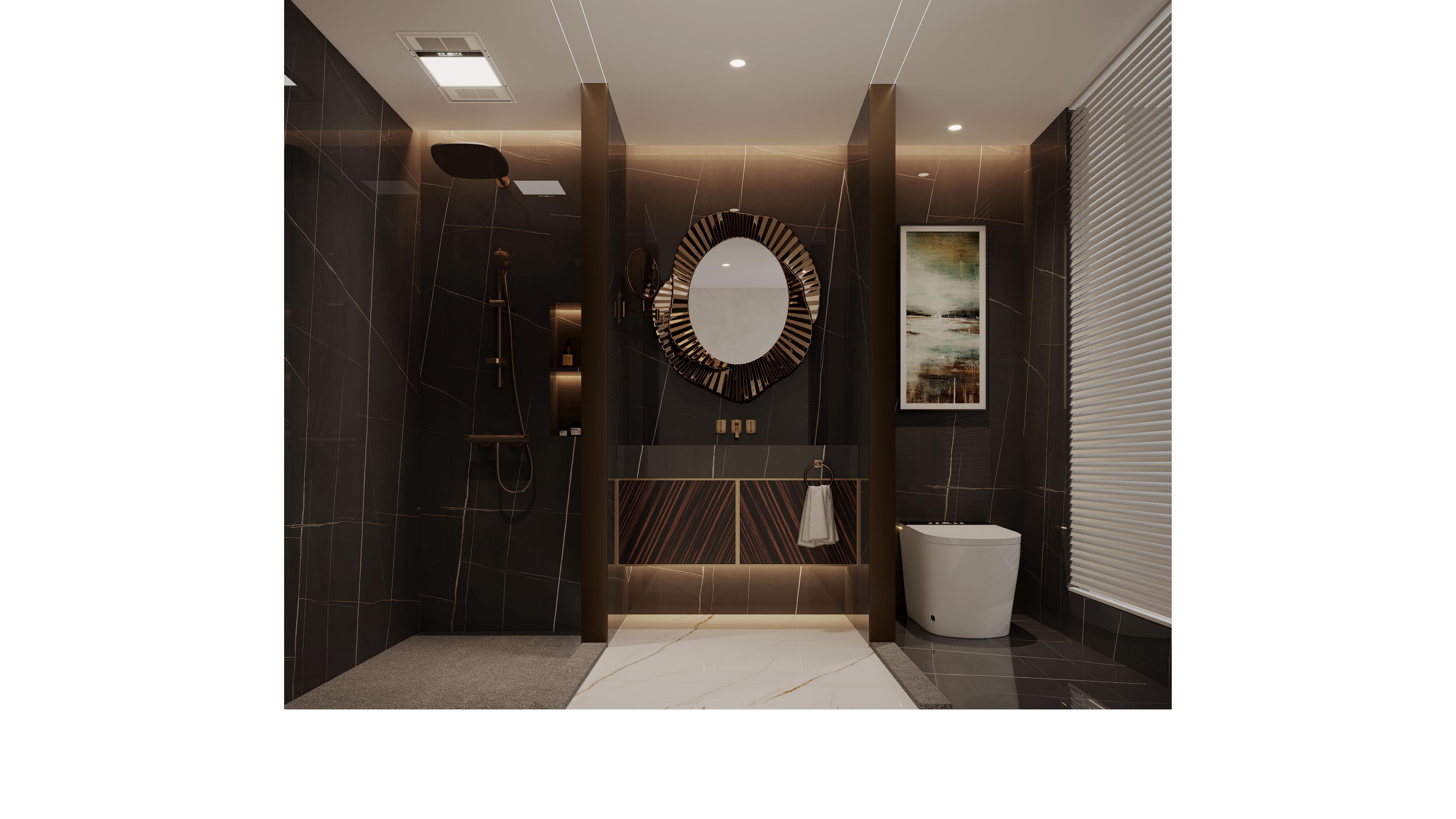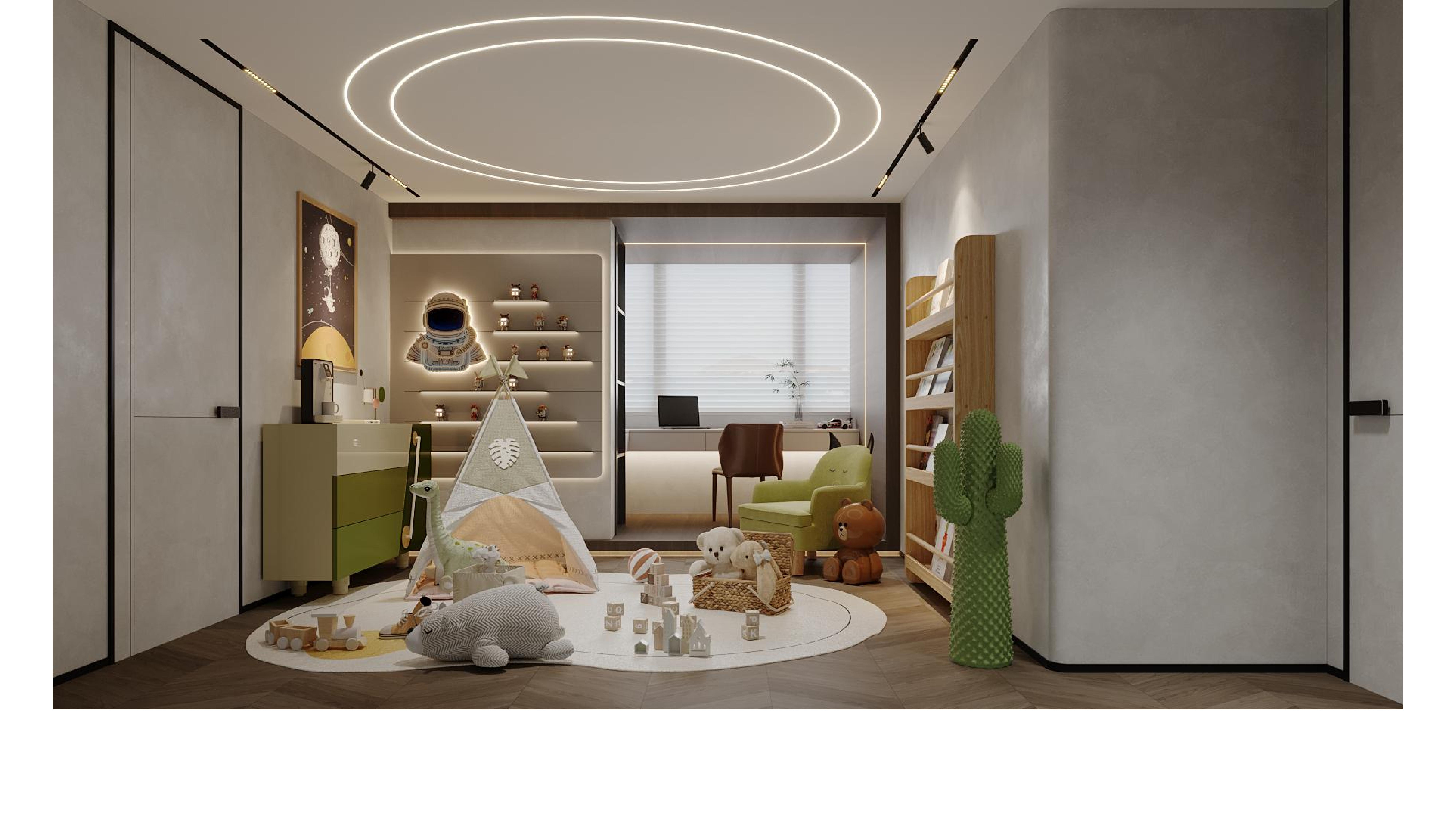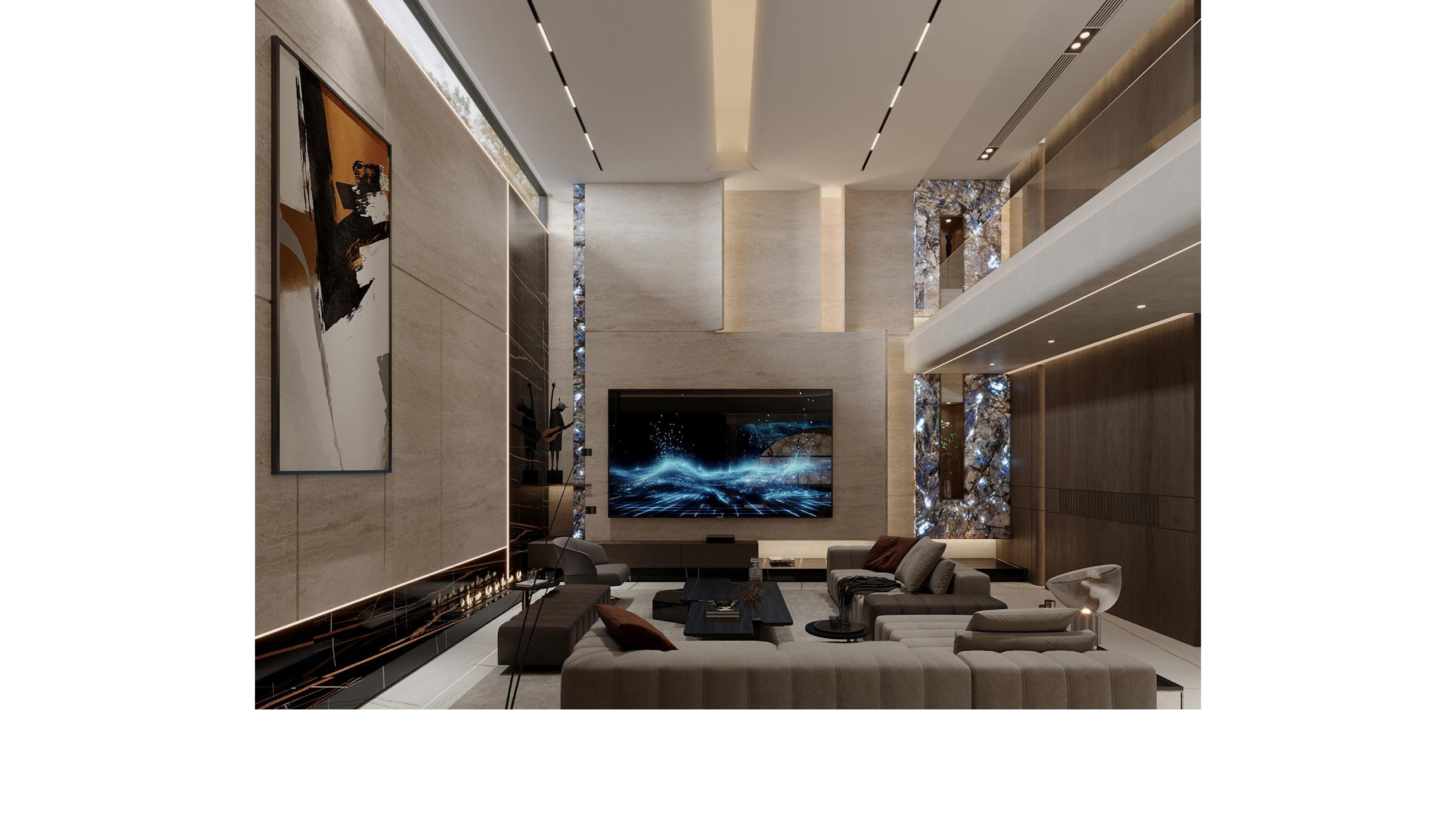 Every detail embodies artistic beauty, extending the personality and taste of its inhabitants. The fluid ceiling lines, complemented by the soft glow of circular light strips, introduce a contemporary feel while maintaining an inviting warmth. Strategically integrated lighting along the architectural facades enhances functionality while imparting an airy, luminous quality to the space.